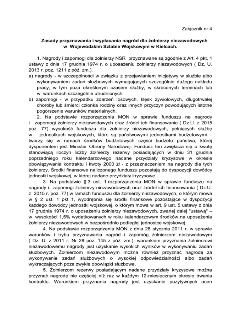 Załącznik nr 4 Zasady przyznawania i wypłacania nagród dla żołnierzy niezawodowych w Wojewódzkim Sztabie Wojskowym w Kielcach. 1. Nagrody i zapomogi dla żołnierzy NSR przyznawane są zgodnie z Art. 4 pkt. 1 ustawy z dnia 17 grudnia 1974 r. o uposażeniu żołnierzy niezawodowych ( Dz. U. 2013 r. poz. 1211 z póź. zm.). a) nagrody - w szczególności w związku z przejawianiem inicjatywy w służbie albo wykonywaniem zadań służbowych wymagających szczególnie dużego nakładu pracy, w tym poza określonym czasem służby, w skróconych terminach lub w warunkach szczególnie utrudnionych, b) zapomogi - w przypadku zdarzeń losowych, klęsk żywiołowych, długotrwałej choroby lub śmierci członka rodziny oraz innych przyczyn powodujących istotne pogorszenie warunków materialnych. 2. Na podstawie rozporządzenia MON w sprawie funduszu na nagrody i zapomogi żołnierzy niezawodowych oraz źródeł ich finansowania ( Dz.U. z 2015 poz. 77) wysokość funduszu dla żołnierzy niezawodowych, pełniących służbę w jednostkach wojskowych, które są państwowymi jednostkami budżetowymi – tworzy się w ramach środków budżetowych części budżetu państwa, której dysponentem jest Minister Obrony Narodowej. Fundusz ten zwiększa się o kwotę stanowiącą iloczyn liczby żołnierzy rezerwy posiadających w dniu 31 grudnia poprzedniego roku kalendarzowego nadane przydziały kryzysowe w okresie obowiązywania kontraktu i kwoty 2000 zł - z przeznaczeniem na nagrody dla tych żołnierzy. Środki finansowe naliczonego funduszu pozostają do dyspozycji dowódcy jednostki wojskowej, w której nadano przydziały kryzysowe. 3. Na podstawie § 3. ust. 1 rozporządzenia MON w sprawie funduszu na nagrody i zapomogi żołnierzy niezawodowych oraz źródeł ich finansowania ( Dz.U. z 2015 r. poz. 77) w ramach funduszu dla żołnierzy niezawodowych, o którym mowa w § 2 ust. 1 pkt 1, wyodrębnia się środki finansowe pozostające w dyspozycji każdego dowódcy jednostki wojskowej, o którym mowa w art. 9 ust. 5 ustawy z dnia 17 grudnia 1974 r. o uposażeniu żołnierzy niezawodowych, zwanej dalej "ustawą" – w wysokości 1,5% wydatkowanych w roku kalendarzowym środków na uposażenia żołnierzy niezawodowych w bezpośrednio podległej jednostce wojskowej. 4. Na podstawie rozporządzenia MON z dnia 28 stycznia 2011 r. w sprawie warunków i trybu przyznawania nagród i zapomóg żołnierzom niezawodowym ( Dz. U. z 2011 r. Nr 28 poz. 145 z póź. zm.), warunkiem przyznania żołnierzowi niezawodowemu nagrody jest uzyskanie wysokich wyników w wykonywaniu zadań służbowych. Żołnierzom niezawodowym można również przyznać nagrodę za wykonywanie zadań służbowych o wysokiej odpowiedzialności albo zadań wykraczających poza zwykłe obowiązki służbowe. 5. Żołnierzom rezerwy posiadającym nadane przydziały kryzysowe można przyznać nagrodę nie częściej niż raz w każdym 12-miesięcznym okresie trwania kontraktu. Warunkiem przyznania nagrody jest uzyskanie pozytywnych ocen służbowych z ćwiczeń wojskowych, odbytych przez żołnierza rezerwy w okresie, za który jest przyznawana nagroda. 6. Nagrody naliczone na podstawie § 2. ust. 3 rozporządzenia MON w sprawie funduszu na nagrody i zapomogi żołnierzy niezawodowych oraz źródeł ich finansowania ( Dz.U. z 2015 poz. 77) przyznaje dowódca jednostki wojskowej w określonym poniżej trybie: - nagroda w pełnej wysokości tj. 2000,00 zł (dwa tysiące złotych) zostanie przyznana żołnierzowi rezerwy, który odbył w całości zaplanowane ćwiczenia wojskowe oraz uzyskał pozytywną ocenę służbową z ćwiczeń wojskowych, odbytych przez żołnierza rezerwy w okresie, za który przyznawana jest nagroda, - w przypadku nie uczestniczenia w planowanych ćwiczeniach w pełnym wymiarze żołnierzowi NSR może zostać przyznana nagroda w wysokości proporcjonalnej do całości planowanych dni ćwiczeń. O wysokości nagrody decyduje Szef WSzW w Kielcach uwzględniając ilość faktycznie odbytych dni ćwiczeń, zaangażowanie żołnierza w trakcie ich trwania oraz przyczynę nie uczestniczenia w planowanych zajęciach. 7. Fundusz na nagrody naliczony na podstawie § 3. ust. 1 rozporządzenia MON w sprawie funduszu na nagrody i zapomogi żołnierzy niezawodowych oraz źródeł ich finansowania ( Dz.U. z 2015 poz. 77) pozostaje w dyspozycji dowódcy jednostki wojskowej. Nagrody przyznawane są zgodnie z rozporządzeniem z dnia 28 stycznia 2011 r. w sprawie warunków i trybu przyznawania nagród i zapomóg żołnierzom niezawodowym ( Dz. U. z 2011 r. Nr 28 poz. 145 z póź. zm.). 8. Żołnierzy NSR można wyróżnić nagrodą z funduszu naliczony na podstawie § 3. ust. 1 rozporządzenia MON. Zgodnie z w/w rozporządzeniem żołnierzom rezerwy posiadającym nadane przydziały kryzysowe można przyznać nagrodę nie częściej niż raz w każdym 12 miesięcznym okresie trwania kontraktu, w związku z powyższym nagrodę z funduszu podstawowego należy wypłacić jedynie w połączeniu z nagrodą przyznaną z tytułu ćwiczeń wojskowych. 9. Żołnierze NSR, z którymi podpisano kontrakty po wejściu nowelizacji rozporządzenia w 2015 roku ( Dz. U. z 2015 r. poz. 229) otrzymują nagrody zgodnie z obowiązującymi przepisami. 10. Żołnierze NSR, z którymi podpisano kontrakt przed wejściem w życie nowelizacji otrzymują nagrodę zgodnie z zasadami: - nagrodę rozliczającą poprzedni okres przebywania na kontrakcie z zaznaczeniem w rozkazie za jaki okres nagroda została przyznana. - nagrodę za kolejny okres obowiązywania nowego kontraktu, po spełnieniu warunków z rozporządzenia, w rozkazie podajemy jakiego okresu dotyczy dana nagroda. 10. W każdym kolejnym miesiącu roku, starszy referent sekcji kadr dokona analizy żołnierzy NSR, którzy uzyskali prawo do otrzymania nagrody z tytułu odbytych ćwiczeń i przedstawi listę żołnierzy dowódcy jednostki wojskowej. Fakt wyróżnienia żołnierzy niezawodowych nag