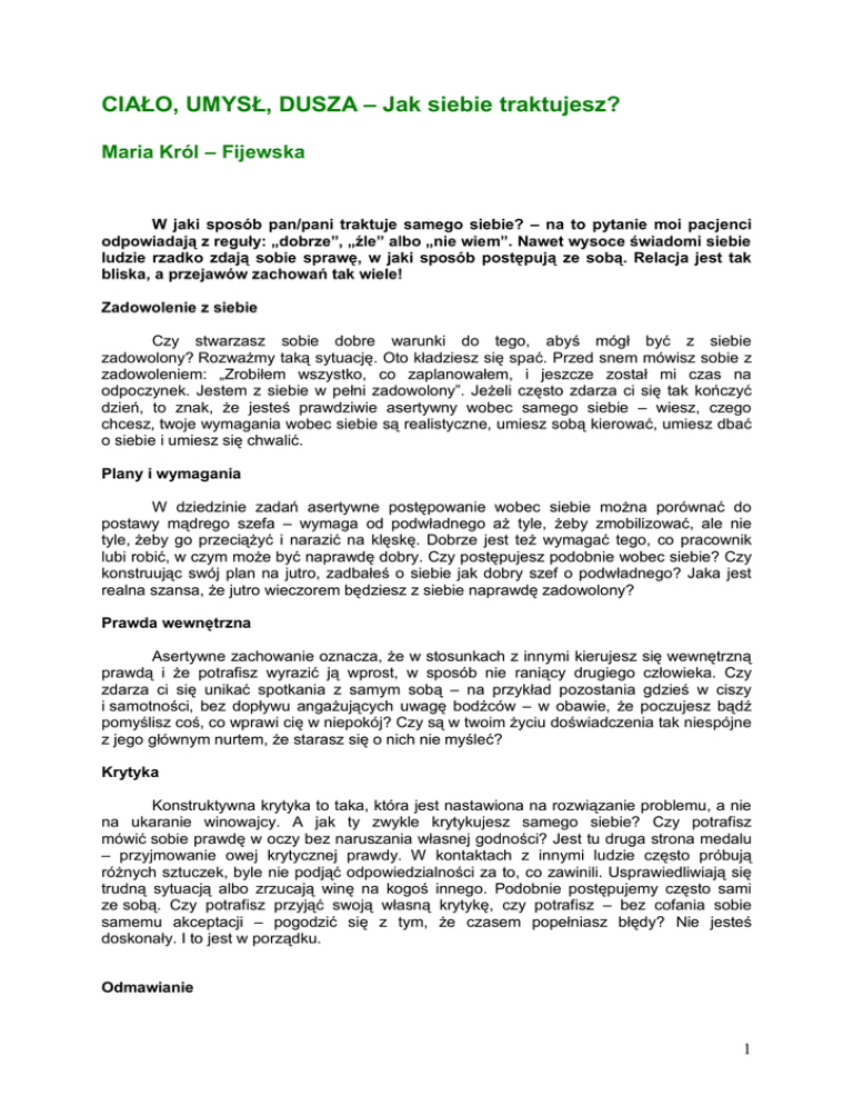 CIAŁO, UMYSŁ, DUSZA – Jak siebie traktujesz? Maria Król – Fijewska W jaki sposób pan/pani traktuje samego siebie? – na to pytanie moi pacjenci odpowiadają z reguły: „dobrze”, „źle” albo „nie wiem”. Nawet wysoce świadomi siebie ludzie rzadko zdają sobie sprawę, w jaki sposób postępują ze sobą. Relacja jest tak bliska, a przejawów zachowań tak wiele! Zadowolenie z siebie Czy stwarzasz sobie dobre warunki do tego, abyś mógł być z siebie zadowolony? Rozważmy taką sytuację. Oto kładziesz się spać. Przed snem mówisz sobie z zadowoleniem: „Zrobiłem wszystko, co zaplanowałem, i jeszcze został mi czas na odpoczynek. Jestem z siebie w pełni zadowolony”. Jeżeli często zdarza ci się tak kończyć dzień, to znak, że jesteś prawdziwie asertywny wobec samego siebie – wiesz, czego chcesz, twoje wymagania wobec siebie są realistyczne, umiesz sobą kierować, umiesz dbać o siebie i umiesz się chwalić. Plany i wymagania W dziedzinie zadań asertywne postępowanie wobec siebie można porównać do postawy mądrego szefa – wymaga od podwładnego aż tyle, żeby zmobilizować, ale nie tyle, żeby go przeciążyć i narazić na klęskę. Dobrze jest też wymagać tego, co pracownik lubi robić, w czym może być naprawdę dobry. Czy postępujesz podobnie wobec siebie? Czy konstruując swój plan na jutro, zadbałeś o siebie jak dobry szef o podwładnego? Jaka jest realna szansa, że jutro wieczorem będziesz z siebie naprawdę zadowolony? Prawda wewnętrzna Asertywne zachowanie oznacza, że w stosunkach z innymi kierujesz się wewnętrzną prawdą i że potrafisz wyrazić ją wprost, w sposób nie raniący drugiego człowieka. Czy zdarza ci się unikać spotkania z samym sobą – na przykład pozostania gdzieś w ciszy i samotności, bez dopływu angażujących uwagę bodźców – w obawie, że poczujesz bądź pomyślisz coś, co wprawi cię w niepokój? Czy są w twoim życiu doświadczenia tak niespójne z jego głównym nurtem, że starasz się o nich nie myśleć? Krytyka Konstruktywna krytyka to taka, która jest nastawiona na rozwiązanie problemu, a nie na ukaranie winowajcy. A jak ty zwykle krytykujesz samego siebie? Czy potrafisz mówić sobie prawdę w oczy bez naruszania własnej godności? Jest tu druga strona medalu – przyjmowanie owej krytycznej prawdy. W kontaktach z innymi ludzie często próbują różnych sztuczek, byle nie podjąć odpowiedzialności za to, co zawinili. Usprawiedliwiają się trudną sytuacją albo zrzucają winę na kogoś innego. Podobnie postępujemy często sami ze sobą. Czy potrafisz przyjąć swoją własną krytykę, czy potrafisz – bez cofania sobie samemu akceptacji – pogodzić się z tym, że czasem popełniasz błędy? Nie jesteś doskonały. I to jest w porządku. Odmawianie 1 Odmawianie samemu sobie to obszar, w którym wiele osób doznaje niepowodzeń. Jedzenie, picie, używanie telewizora lub komputera, gimnastyka, pora chodzenia spać – na coś innego umawiamy się ze sobą, a coś innego w końcu robimy. Wyobraź sobie, że masz na coś wielką ochotę, a jednocześnie wiesz, że rezultat twojego postępowania nie będzie dla ciebie dobry lub co innego sobie przyrzekałeś – co robisz? Czy ulegasz swoim chęciom? Czy odmawiasz sobie? Czy umiesz łagodnie, ale stanowczo kierować sobą? Pochwały Pochwała ogólna, relacyjna i warunkowa (Jesteś super, byłeś najlepszy, żaden z nich do pięt ci nie dorasta!) jest jak nadmuchany balon – z pewnością kiedyś pęknie. Konstruktywna pochwała jest konkretna (tj. dotyczy określonego zachowania lub klasy zachowań), bezwarunkowa (bez uwag typu: „Tylko uważaj, żebyś następnym razem nie wypadł gorzej!”) i następuje bezpośrednio po zachowaniu. Jak chwalisz samego siebie? Za co zwykle siebie chwalisz? Za co nigdy nie chwalisz siebie, choć jest powód? Wiara i zaufanie Wyobraź sobie, że kupiłeś nową szafkę – jest w pudle, musisz ją złożyć. Wyjmujesz różne części. Co tu do siebie pasuje?! Instrukcja robi wrażenie niejasnej... Co mówi twój wewnętrzny głos? Czy próbując wykonać jakąś trudną/nową pracę, masz zwyczaj raczej straszenia się, krytykowania i onieśmielania? Czy też wspierania, chwalenia i podtrzymywania nadziei na dobre zakończenie? Czy generalnie wierzysz w siebie i ufasz sobie? Asertywność wobec siebie pomaga człowiekowi osiągnąć to, czego pragnie, będąc jednocześnie w harmonii z samym sobą. I kto wie, czy ten drugi cel nie jest nawet ważniejszy niż pierwszy. Tekst został opublikowany w miesięczniku „Charaktery”, nr 3, 2003 r. 2