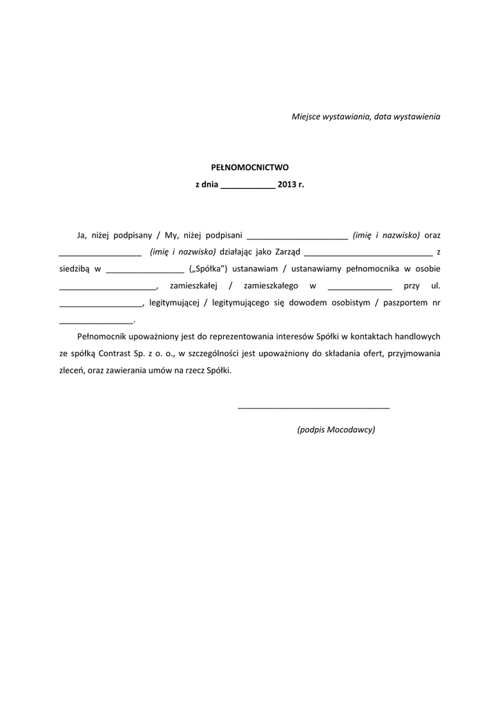 Miejsce wystawiania, data wystawienia PEŁNOMOCNICTWO z dnia ____________ 2013 r. Ja, niżej podpisany / My, niżej podpisani ______________________ (imię i nazwisko) oraz __________________ (imię i nazwisko) działając jako Zarząd ____________________________ z siedzibą w _________________ („Spółka”) ustanawiam / ustanawiamy pełnomocnika w osobie _____________________, zamieszkałej / zamieszkałego w ______________ przy ul. __________________, legitymującej / legitymującego się dowodem osobistym / paszportem nr ________________. Pełnomocnik upoważniony jest do reprezentowania interesów Spółki w kontaktach handlowych ze spółką Contrast Sp. z o. o., w szczególności jest upoważniony do składania ofert, przyjmowania zleceń, oraz zawierania umów na rzecz Spółki. _________________________________ (podpis Mocodawcy)