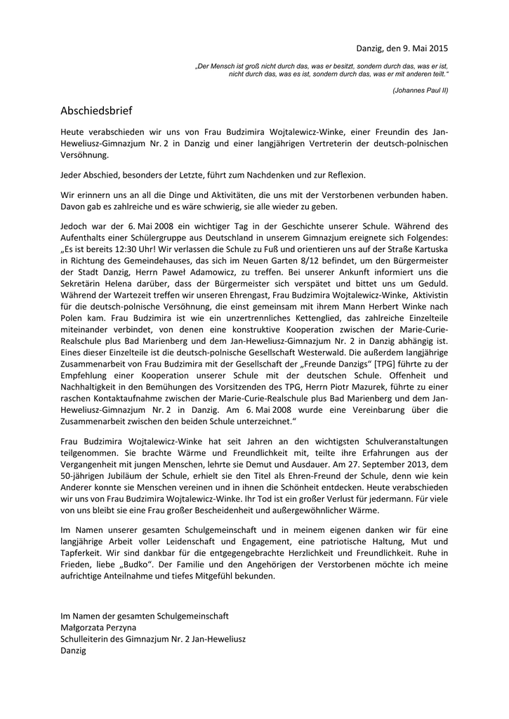 Danzig, den 9. Mai 2015 „Der Mensch ist groß nicht durch das, was er besitzt, sondern durch das, was er ist, nicht durch das, was es ist, sondern durch das, was er mit anderen teilt.“ (Johannes Paul II) Abschiedsbrief Heute verabschieden wir uns von Frau Budzimira Wojtalewicz-Winke, einer Freundin des JanHeweliusz-Gimnazjum Nr. 2 in Danzig und einer langjährigen Vertreterin der deutsch-polnischen Versöhnung. Jeder Abschied, besonders der Letzte, führt zum Nachdenken und zur Reflexion. Wir erinnern uns an all die Dinge und Aktivitäten, die uns mit der Verstorbenen verbunden haben. Davon gab es zahlreiche und es wäre schwierig, sie alle wieder zu geben. Jedoch war der 6. Mai 2008 ein wichtiger Tag in der Geschichte unserer Schule. Während des Aufenthalts einer Schülergruppe aus Deutschland in unserem Gimnazjum ereignete sich Folgendes: „Es ist bereits 12:30 Uhr! Wir verlassen die Schule zu Fuß und orientieren uns auf der Straße Kartuska in Richtung des Gemeindehauses, das sich im Neuen Garten 8/12 befindet, um den Bürgermeister der Stadt Danzig, Herrn Paweł Adamowicz, zu treffen. Bei unserer Ankunft informiert uns die Sekretärin Helena darüber, dass der Bürgermeister sich verspätet und bittet uns um Geduld. Während der Wartezeit treffen wir unseren Ehrengast, Frau Budzimira Wojtalewicz-Winke, Aktivistin für die deutsch-polnische Versöhnung, die einst gemeinsam mit ihrem Mann Herbert Winke nach Polen kam. Frau Budzimira ist wie ein unzertrennliches Kettenglied, das zahlreiche Einzelteile miteinander verbindet, von denen eine konstruktive Kooperation zwischen der Marie-CurieRealschule plus Bad Marienberg und dem Jan-Heweliusz-Gimnazjum Nr. 2 in Danzig abhängig ist. Eines dieser Einzelteile ist die deutsch-polnische Gesellschaft Westerwald. Die außerdem langjährige Zusammenarbeit von Frau Budzimira mit der Gesellschaft der „Freunde Danzigs“ [TPG] führte zu der Empfehlung einer Kooperation unserer Schule mit der deutschen Schule. Offenheit und Nachhaltigkeit in den Bemühungen des Vorsitzenden des TPG, Herrn Piotr Mazurek, führte zu einer raschen Kontaktaufnahme zwischen der Marie-Curie-Realschule plus Bad Marienberg und dem JanHeweliusz-Gimnazjum Nr. 2 in Danzig. Am 6. Mai 2008 wurde eine Vereinbarung über die Zusammenarbeit zwischen den beiden Schule unterzeichnet.“ Frau Budzimira Wojtalewicz-Winke hat seit Jahren an den wichtigsten Schulveranstaltungen teilgenommen. Sie brachte Wärme und Freundlichkeit mit, teilte ihre Erfahrungen aus der Vergangenheit mit jungen Menschen, lehrte sie Demut und Ausdauer. Am 27. September 2013, dem 50-jährigen Jubiläum der Schule, erhielt sie den Titel als Ehren-Freund der Schule, denn wie kein Anderer konnte sie Menschen vereinen und in ihnen die Schönheit entdecken. Heute verabschieden wir uns von Frau Budzimira Wojtalewicz-Winke. Ihr Tod ist ein großer Verlust für jedermann. Für viele von uns bleibt sie eine Frau großer Bescheidenheit und außergewöhnlicher Wärme. Im Namen unserer gesamten Schulgemeinschaft und in meinem eigenen danken wir für eine langjährige Arbeit voller Leidenschaft und Engagement, eine patriotische Haltung, Mut und Tapferkeit. Wir sind dankbar für die entgegengebrachte Herzlichkeit und Freundlichkeit. Ruhe in Frieden, liebe „Budko“. Der Familie und den Angehörigen der Verstorbenen möchte ich meine aufrichtige Anteilnahme und tiefes Mitgefühl bekunden. Im Namen der gesamten Schulgemeinschaft Małgorzata Perzyna Schulleiterin des Gimnazjum Nr. 2 Jan-Heweliusz Danzig Gdańsk, 9 maja 2015 r. „Człowiek jest wielki nie przez to, co posiada, lecz przez to kim jest, nie przez to, co ma, lecz przez to, czym dzieli się z innymi.” (Jan Paweł II) LIST POŻEGNALNY Żegnamy dzisiaj Panią Budzimirę Wojtalewicz – Winke – Przyjaciela Gimnazjum nr 2 im. Jana Heweliusza w Gdańsku, niezłomną rzeczniczkę pojednania polsko – niemieckiego. Każde pożegnanie, a szczególnie to ostatnie, skłania do zadumy i refleksji. Wspominamy wszystkie sprawy i działania, które łączyły nas ze zmarłą. Było ich bardzo wiele i trudno byłoby je wszystkie wymienić.. Jednak 6 maja 2008 roku to ważny dzień z historii Naszego Gimnazjum. W Kalendarium pobytu grupy młodzieży z Niemiec tak pisałam w jego fragmencie o tym szczególnym dniu „…Już godz. 12 30! Wychodzimy ze szkoły i pieszo ul. Kartuską kierujemy się do Urzędu Miejskiego przy ul. Nowe Ogrody 8/12 na spotkanie z Prezydentem Miasta Gdańska Panem Pawłem Adamowiczem .(…) Pani Helena – dyrektor biura informuje nas, że spotkanie wcześniejsze nieco się przedłuża i prosi o cierpliwość. Chwile oczekiwania wypełniło nam radosne powitanie naszego honorowego gościa – Pani Budzimiry Wojtalewicz – Winke, aktywnej działaczki na rzecz integracji polsko – niemieckiej, która przyjechała do Polski wraz z mężem Panem Herbertem Winke. Osoba Pani Budzimiry jest jak nierozerwalne ogniwo, łączy wiele podmiotów od których zależeć będzie konstruktywna współpraca między Marie-Curie-Realschule Bad Marienberg a Gimnazjum nr 2 w Gdańsku. Jednym z tych podmiotów jest Towarzystwo Polsko – Niemieckie Westerwald. Natomiast wieloletnia współpraca Pani Budzimiry z Towarzystwem Przyjaciół Gdańska zaowocowała rekomendacją naszej szkoły, jako partnera do współpracy ze szkołą niemiecką. Operatywność, otwartość i skuteczność w działaniu prezesa TPG Pana Piotra Mazurka doprowadziła do szybkiego nawiązania kontaktu między Marie-Curie-Realschule Bad Marienberg a Gimnazjum nr 2 w Gdańsku. Dnia 6 maja 2008 nastąpiło podpisanie umowy o wzajemnej współpracy obu szkół”. Pani Budzimira Wojtalewicz - Winke od lat uświetniała najważniejsze szkolne uroczystości. Wnosiła ciepło, życzliwość, dzieliła się z młodzieżą doświadczeniami z przeszłości, uczyła pokory i wytrwałości. Dnia 27 września 2013 r, podczas Jubileuszu 50 – lecia szkoły otrzymała Tytuł Honorowego Przyjaciela Szk