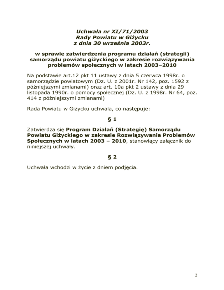 Uchwała nr XI/71/2003 Rady Powiatu w GiŜycku z dnia