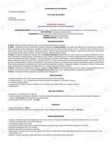 KATEGORIE DLA TEJ OFERTY ● SYLWESTER 2016/2017 TYPY DLA TEJ OFERTY ● ● Sylwester wycieczka kilkudniowa SYLWESTER W PARYŻU powitanie Nowego Roku na Polach Elizejskich ZAKWATEROWANIE: 2 noclegi, pokoje 2 - 4-os. z łazienką (sieć Premiere Classe lub podobna), na obrzeżach Paryża; WYŻYWIENIE: 2 śniadania kontynentalne TRANSPORT: autokar (wc, video, barek, klimatyzacja) lub BUS (klimatyzacja) KADRA: opieka pilota-przewodnika UBEZPIECZENIE: KL, NNW i bagaż PROGRAM RAMOWY: 1 Dzień - Wyjazdy według rozkładu jazdy, nocny przejazd przez Niemcy do Francji 2 Dzień - Przyjazd do Paryża w godzinach rannych, przejazd pod Wieżę Eiffela, czas wolny, dla chętnych rejs statkiem po Sekwanie, Pałac Inwalidów z grobem Napoleona, następnie zwiedzanie centrum historycznego Paryża, La Cite – najstarsza część i kolebka Paryża z katedrą Notre Dame i Saint Chapelle, Dzielnica Łacińska - Ogrody i Pałac Luksemburski, Panteon - miejsce spoczynku Marii i Piotra Curie oraz zasłużonych dla Francji, Sorbona. Przejazd do hotelu, zakwaterowanie, nocleg 3 Dzień -Śniadanie, pożegnanie starego roku w Eurodisneylandzie najpiękniejszym parku rozrywki w Europie. W bajkowej scenerii Parku Disneyland czekają atrakcje z różnorodnych krain Fantazji - baśniowej krainy z zamkiem Śpiącej Królewny, Pogranicza - znanego z westernów Dzikiego Zachodu, Przygody - krainy poszukiwaczy skarbów i Wynalazków - świata technologii i przyszłości. W Parku Disney Studio odkryjesz magiczny świat kina i telewizji. Każda z 4 części tematycznych oferuje wspaniałe atrakcje i zapierające dech w piersiach przedstawienia. Wspaniale oświetlone trasy parady, sympatyczni bohaterowie Disneya poprowadzą imprezę sylwestrową. Przed północą fajerwerki rozświetlą niebo niezliczoną ilością kolorów, kształtów i dźwięków. Wspólnie z turystami z różnych stron świata witamy Nowy Rok. Po przywitaniu Nowego Roku ok. 1 w nocy przejazd do hotelu, nocleg. 4 Dzień - Śniadanie, wymeldowanie z hotelu . Przejazd na Plac Pigalle, Moulin Rouge, Plac du Tertre, spacer po wzgórzu Montmartre z malownicza panoramą miasta, zwiedzanie Bazyliki Sacre Coeur, czas wolny. Wyjazd do Polski w godzinach wieczornych . 5 Dzień - Przyjazd do Polski w godzinach popołudniowych/wieczornych. CENA ZAWIERA: ● ● ● ● ● przejazd autokarem (wc, video, barek, klimatyzacja) lub busem (klimatyzacja); 2 noclegi, pokoje 2 - 4-os. z łazienką (sieć Premiere Classe lub podobna), na obrzeżach Paryża; 2 śniadania kontynentalne; ubezpieczenie TU Signal Iduna KL (10000 euro), KR (5000 euro), NNW (7000 euro) i bagażu (800 zł); opiekę pilota. CENA NIE ZAWIERA: ● ● ● świadczeń nie wymienionych w ofercie, biletów wstępu do zwiedzanych obiektów, kosztów przewodnika lokalnego oraz biletów komunikacji miejskiej podczas zwiedzania, razem ok. 85 euro/os. Ceny biletów mogą ulec zmianie. obiadokolacja w dniu 30.12.2015 - 70 zł/os DOPŁATY: ● ● pokój jednoosobowy - 150 zł zabawa sylwestrowa w dyskotece (wstęp do godz. 2.00, przejazd autokarem hotel-klub-hotel) - 130 zł/os WAŻNE INFORMACJE: ● ● ● ● ● ● ● Istnieje możliwość przesiadki w Katowicach do innego autokaru. Przejazd do/z Katowic może być realizowany innym niż autokar środkiem transportu (bus, samochód osobowy). ceny biletów mogą ulec zmianie. zwiedzanie Paryża w dużej części odbywa się pieszo, a poruszanie po mieście komunikacja miejską (metro, RER). kolejność zwiedzania może ulec zmianie. pilot nie oprowadza po wnętrzach obiektów miasto Paryż nie organizuje koncertów, zabaw, itp. Turyści z całego świata witają Nowy Rok spontanicznie na Polach Elizejskich, pod Wieżą Eiffel’a, itd. godziny i miejsca wyjazdów należy potwierdzić na 24 godziny przed planowanym wyjazdem, ● obowiązują warunki uczestnictwa organizatora imprezy Możliwe terminy wyjazdu Lp. 1. Data początku Data końca Cena Wolne miejsca 29-12-2016 02-01-2017 819 zł termin jest niedostępny Możliwe miejsca wyjazdu Lp. Miasto Adres Dopłata Wyjazd 1. Katowice Al. Górnosląska, stacja paliw BP/Mc Donald przy hotelu Campanile +20 zł 10:00 2. Kraków ul. Kałuży obok Hotelu Cracovia +60 zł 08:15 3. Opole McDonald's/Stacja BP, ul. Wrocławska +20 zł 11:30 4. Wrocław Al. karkonoska, stacja paliw BP prz Mc Donald +0 zł 15:30