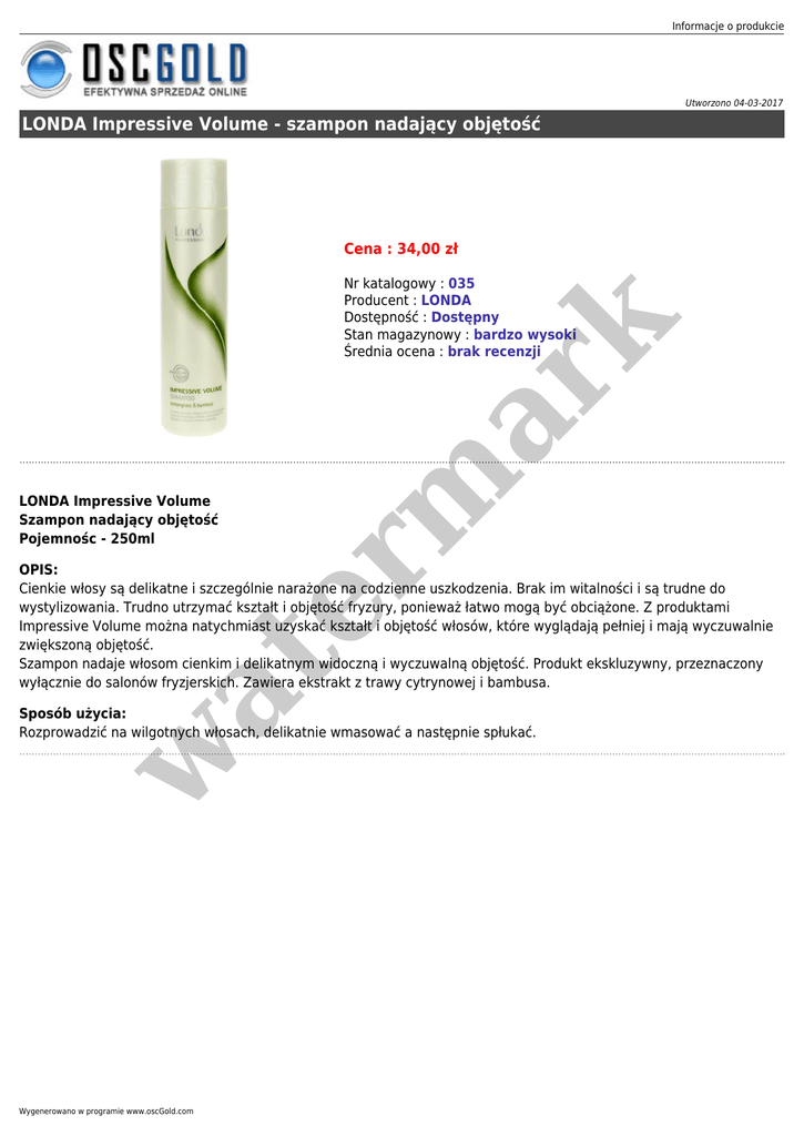 Informacje o produkcie Utworzono 04-03-2017 LONDA Impressive Volume - szampon nadający objętość Cena : 34,00 zł LONDA Impressive Volume Szampon nadający objętość Pojemnośc - 250ml er m ar k Nr katalogowy : 035 Producent : LONDA Dostępność : Dostępny Stan magazynowy : bardzo wysoki Średnia ocena : brak recenzji at OPIS: Cienkie włosy są delikatne i szczególnie narażone na codzienne uszkodzenia. Brak im witalności i są trudne do wystylizowania. Trudno utrzymać kształt i objętość fryzury, ponieważ łatwo mogą być obciążone. Z produktami Impressive Volume można natychmiast uzyskać kształt i objętość włosów, które wyglądają pełniej i mają wyczuwalnie zwiększoną objętość. Szampon nadaje włosom cienkim i delikatnym widoczną i wyczuwalną objętość. Produkt ekskluzywny, przeznaczony wyłącznie do salonów fryzjerskich. Zawiera ekstrakt z trawy cytrynowej i bambusa. w Sposób użycia: Rozprowadzić na wilgotnych włosach, delikatnie wmasować a następnie spłukać. Wygenerowano w programie www.oscGold.com