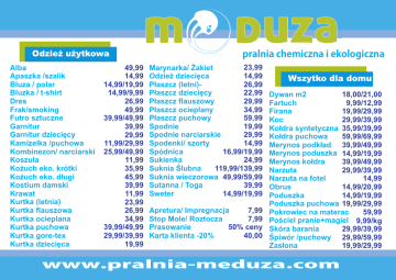 Odzież użytkowa Alba Apaszka /szalik Bluza / polar Bluzka / t-shirt Dres Frak/smoking Futro sztuczne Garnitur Garnitur dziecięcy Kamizelka /puchowa Kombinezon/ narciarski Koszula Kożuch eko. krótki Kożuch eko. długi Kostium damski Krawat Kurtka (letnia) Kurtka flauszowa Kurtka ocieplana Kurtka puchowa Kurtka gore-tex Kurtka dziecięca 49,99 14,99 14,99/19,99 14,99/9,99 26,99 49,99 39,99/49,99 39,99 29,99 11,99/29,99 25,99/49,99 11,99 35,99 45,99 39,99 11,99 23,99 26,99 34,99 39,99/49,99 29,99/39,99 19,99 pralniachemicznaiekologiczna 23,99 Marynarka/ Żakiet 14,99 Odzież dziecięca 26,99 Płaszcz (letni)22,99 Płaszcz dziecięcy 29,99 Płaszcz flauszowy 34,99 Płaszcz ocieplany 59,99 Płaszcz puchowy 19,99 Spodnie 29,99 Spodnie narciarskie 14,99 Spodenki/ szorty 16,99/19,99 Spódnica 24,99 Sukienka 119,99/139,99 Suknia Ślubna Suknia wieczorowa 49,99/59,99 39,99 Sutanna / Toga 14,99/19,99 Sweter 7,99 Apretura/ Impregnacja 7,99 Stop Mole/ Roztocza 50% ceny Prasowanie 40,00 Karta klienta -20% Wszytko dla domu Dywan m2 18,00/21,00 Fartuch 9,99/12,99 Firana 19,99/29,99 Koc 29,99/39,99 Kołdra syntetyczna 35,99/39,99 Kołdra puchowa 59,99/69,99 Merynos podkład 39,99/49,99 Merynos poduszka 14,99/19,99 Merynos kołdra 39,99/49,99 Narzuta 29,99/39,99 Narzuta na fotel 14,99 Obrus 14,99/20,99 Poduszka 14,99/19,99 Poduszka puchowa 19,99/29,99 Pokrowiec na materac 59,99 Pościel pranie+magiel 9,99/kg Skóra barania 29,99/39,99 Śpiwór /puchowy 29,99/59,99 Zasłona 19,99/29,99 www.pralnia-meduza.com pralniachemicznaiekologiczna Pranie+prasowanie Pranie+prasowanie 6,00zł Maglowanie 6,00zł *prz min.1kgpośceli *przymin.5sztukach PralniaMeduza C.H.Kaufland,ul.Bardzka1a 50-516Wrocław Godzinyotwarcie: Pon-Sob9.00-21.00 Niedziela9.00-20.00 Pranie+prasowanie Pościel wełniana 39,99zł kołdra140x180 www.pralnia-meduza.com [email protected] tel.531-565-149