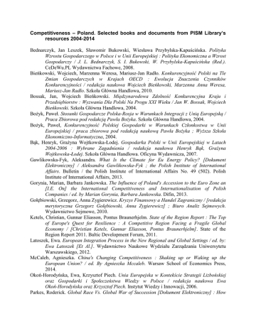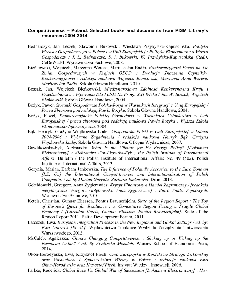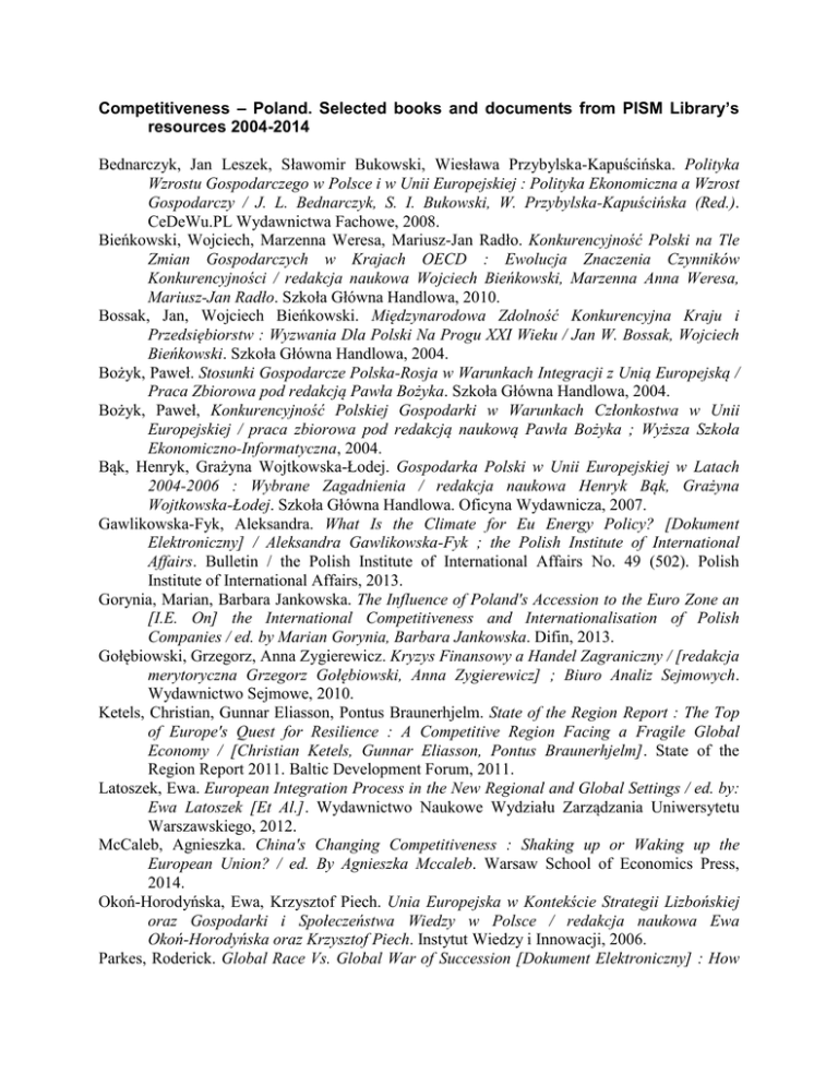 Competitiveness – Poland. Selected books and documents from PISM Library’s resources 2004-2014 Bednarczyk, Jan Leszek, Sławomir Bukowski, Wiesława Przybylska-Kapuścińska. Polityka Wzrostu Gospodarczego w Polsce i w Unii Europejskiej : Polityka Ekonomiczna a Wzrost Gospodarczy / J. L. Bednarczyk, S. I. Bukowski, W. Przybylska-Kapuścińska (Red.). CeDeWu.PL Wydawnictwa Fachowe, 2008. Bieńkowski, Wojciech, Marzenna Weresa, Mariusz-Jan Radło. Konkurencyjność Polski na Tle Zmian Gospodarczych w Krajach OECD : Ewolucja Znaczenia Czynników Konkurencyjności / redakcja naukowa Wojciech Bieńkowski, Marzenna Anna Weresa, Mariusz-Jan Radło. Szkoła Główna Handlowa, 2010. Bossak, Jan, Wojciech Bieńkowski. Międzynarodowa Zdolność Konkurencyjna Kraju i Przedsiębiorstw : Wyzwania Dla Polski Na Progu XXI Wieku / Jan W. Bossak, Wojciech Bieńkowski. Szkoła Główna Handlowa, 2004. Bożyk, Paweł. Stosunki Gospodarcze Polska-Rosja w Warunkach Integracji z Unią Europejską / Praca Zbiorowa pod redakcją Pawła Bożyka. Szkoła Główna Handlowa, 2004. Bożyk, Paweł, Konkurencyjność Polskiej Gospodarki w Warunkach Członkostwa w Unii Europejskiej / praca zbiorowa pod redakcją naukową Pawła Bożyka ; Wyższa Szkoła Ekonomiczno-Informatyczna, 2004. Bąk, Henryk, Grażyna Wojtkowska-Łodej. Gospodarka Polski w Unii Europejskiej w Latach 2004-2006 : Wybrane Zagadnienia / redakcja naukowa Henryk Bąk, Grażyna Wojtkowska-Łodej. Szkoła Główna Handlowa. Oficyna Wydawnicza, 2007. Gawlikowska-Fyk, Aleksandra. What Is the Climate for Eu Energy Policy? [Dokument Elektroniczny] / Aleksandra Gawlikowska-Fyk ; the Polish Institute of International Affairs. Bulletin / the Polish Institute of International Affairs No. 49 (502). Polish Institute of International Affairs, 2013. Gorynia, Marian, Barbara Jankowska. The Influence of Poland's Accession to the Euro Zone an [I.E. On] the International Competitiveness and Internationalisation of Polish Companies / ed. by Marian Gorynia, Barbara Jankowska. Difin, 2013. Gołębiowski, Grzegorz, Anna Zygierewicz. Kryzys Finansowy a Handel Zagraniczny / [redakcja merytoryczna Grzegorz Gołębiowski, Anna Zygierewicz] ; Biuro Analiz Sejmowych. Wydawnictwo Sejmowe, 2010. Ketels, Christian, Gunnar Eliasson, Pontus Braunerhjelm. State of the Region Report : The Top of Europe's Quest for Resilience : A Competitive Region Facing a Fragile Global Economy / [Christian Ketels, Gunnar Eliasson, Pontus Braunerhjelm]. State of the Region Report 2011. Baltic Development Forum, 2011. Latoszek, Ewa. European Integration Process in the New Regional and Global Settings / ed. by: Ewa Latoszek [Et Al.]. Wydawnictwo Naukowe Wydziału Zarządzania Uniwersytetu Warszawskiego, 2012. McCaleb, Agnieszka. China's Changing Competitiveness : Shaking up or Waking up the European Union? / ed. By Agnieszka Mccaleb. Warsaw School of Economics Press, 2014. Okoń-Horodyńska, Ewa, Krzysztof Piech. Unia Europejska w Kontekście Strategii Lizbońskiej oraz Gospodarki i Społeczeństwa Wiedzy w Polsce / redakcja naukowa Ewa Okoń-Horodyńska oraz Krzysztof Piech. Instytut Wiedzy i Innowacji, 2006. Parkes, Roderick. Global Race Vs. Global War of Succession [Dokument Elektroniczny] : How Europe Is Split About How to Compete / Roderick Parkes ; the Polish Institute of International Affairs. Bulletin / the Polish Institute of International Affairs No. 9 (604). Polish Institute of International Affairs, 2014. Pluciński, Eugeniusz Maciej. Konkurencyjność Strukturalna Polskiej Gospodarki Na Wspólnym Rynku Unii Europejskiej / Eugeniusz Maciej Pluciński ; Uniwersytet Warszawski. Instytut Stosunków Międzynarodowych ; Fundacja Studiów Międzynarodowych. Żurawia Papers Z. 4. Wydawnictwo Naukowe Scholar, 2005. Puka, Lidia. New Government, Same Track [Dokument Elektroniczny] : Norway and Its European and Energy Policies / Lidia Puka ; the Polish Institute of International Affairs. Bulletin / the Polish Institute of International Affairs No. 113 (566). Polish Institute of International Affairs, 2013. Puka, Lidia, Patryk Toporowski. Growth and Jobs in the Policies of the EU Nordic Countries [Dokument Elektroniczny] / Lidia Puka, Patryk Toporowski ; the Polish Institute of International Affairs. Bulletin / the Polish Institute of International Affairs No. 51 (384). Polish Institute of International Affairs, 2012. Szewczak, Marcin. The Competitiveness of the Central Europe in the European Union : Economic and Legal Aspects / Marcin Szewczak ; John Paul II Catholic University of Lublin. Poland Faculty of Law, Canon Law and Administration. Department of Commercial Administrative Law. Wydawnictwo KUL, 2010. Weresa, Marzenna. Polska : Raport o Konkurencyjności 2010 : Klastry Przemysłowe a Przewagi Konkurencyjne / redakcja naukowa Marzenna Anna Weresa. Raport o Konkurencyjności 2010. Szkoła Główna Handlowa, Instytut Gospodarki Światowej, 2010. Wiśniewski, Bartosz. Canada's Shale Gas Experience [Dokument Elektroniczny] / Bartosz Wiśniewski ; the Polish Insitute of International Affairs. Bulletin / the Polish Insitute of International Affairs No. 69 (286). Polish Institute of International Affairs, 2011. Wiśniewski, Bartosz. Growing Importance of Rare Earth Elements [Dokument Elektroniczny] : Background and Implications / Bartosz Wiśniewski ; the Polish Institute of International Affairs. Bulletin / the Polish Institute of International Affairs No. 47 (500). Polish Institute of International Affairs, 2013.