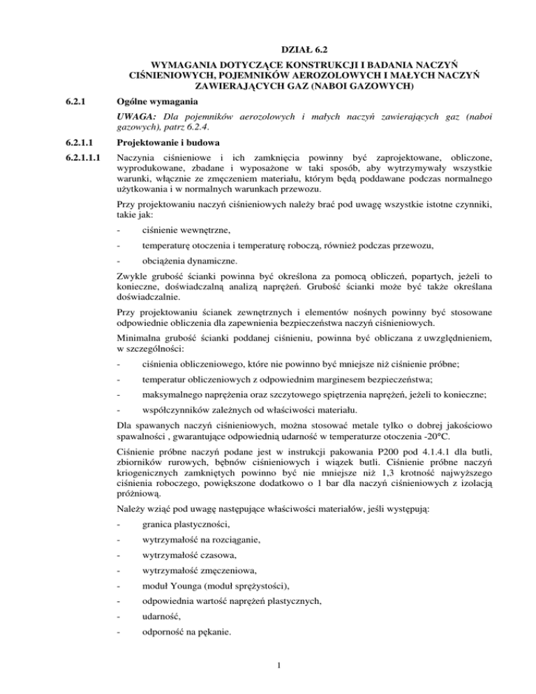 DZIAŁ 6.2 WYMAGANIA DOTYCZĄCE KONSTRUKCJI I BADANIA NACZYŃ CIŚNIENIOWYCH, POJEMNIKÓW AEROZOLOWYCH I MAŁYCH NACZYŃ ZAWIERAJĄCYCH GAZ (NABOI GAZOWYCH) 6.2.1 Ogólne wymagania UWAGA: Dla pojemników aerozolowych i małych naczyń zawierających gaz (naboi gazowych), patrz 6.2.4. 6.2.1.1 Projektowanie i budowa 6.2.1.1.1 Naczynia ciśnieniowe i ich zamknięcia powinny być zaprojektowane, obliczone, wyprodukowane, zbadane i wyposaŜone w taki sposób, aby wytrzymywały wszystkie warunki, włącznie ze zmęczeniem materiału, którym będą poddawane podczas normalnego uŜytkowania i w normalnych warunkach przewozu. Przy projektowaniu naczyń ciśnieniowych naleŜy brać pod uwagę wszystkie istotne czynniki, takie jak: - ciśnienie wewnętrzne, - temperaturę otoczenia i temperaturę roboczą, równieŜ podczas przewozu, - obciąŜenia dynamiczne. Zwykle grubość ścianki powinna być określona za pomocą obliczeń, popartych, jeŜeli to konieczne, doświadczalną analizą napręŜeń. Grubość ścianki moŜe być takŜe określana doświadczalnie. Przy projektowaniu ścianek zewnętrznych i elementów nośnych powinny być stosowane odpowiednie obliczenia dla zapewnienia bezpieczeństwa naczyń ciśnieniowych. Minimalna grubość ścianki poddanej ciśnieniu, powinna być obliczana z uwzględnieniem, w szczególności: - ciśnienia obliczeniowego, które nie powinno być mniejsze niŜ ciśnienie próbne; - temperatur obliczeniowych z odpowiednim marginesem bezpieczeństwa; - maksymalnego napręŜenia oraz szczytowego spiętrzenia napręŜeń, jeŜeli to konieczne; - współczynników zaleŜnych od właściwości materiału. Dla spawanych naczyń ciśnieniowych, moŜna stosować metale tylko o dobrej jakościowo spawalności , gwarantujące odpowiednią udarność w temperaturze otoczenia -20°C. Ciśnienie próbne naczyń podane jest w instrukcji pakowania P200 pod 4.1.4.1 dla butli, zbiorników rurowych, bębnów ciśnieniowych i wiązek butli. Ciśnienie próbne naczyń kriogenicznych zamkniętych powinno być nie mniejsze niŜ 1,3 krotność najwyŜszego ciśnienia roboczego, powiększone dodatkowo o 1 bar dla naczyń ciśnieniowych z izolacją próŜniową. NaleŜy wziąć pod uwagę następujące właściwości materiałów, jeśli występują: - granica plastyczności, - wytrzymałość na rozciąganie, - wytrzymałość czasowa, - wytrzymałość zmęczeniowa, - moduł Younga (moduł spręŜystości), - odpowiednia wartość napręŜeń plastycznych, - udarność, - odporność na pękanie. 1 6.2.1.1.2 Naczynia ciśnieniowe przeznaczone dla UN 1001 acetylenu rozpuszczonego, powinny być całkowicie wypełnione, dopuszczonym przez właściwą władzę, równomiernie rozłoŜonym materiałem porowatym, który: (a) nie uszkadza naczynia i nie wytwarza szkodliwych lub niebezpiecznych mieszanin z acetylenem lub z rozpuszczalnikiem; (b) zapobiega rozprzestrzenieniu się rozkładu acetylenu zawartego w materiale porowatym. Rozpuszczalnik nie powinien uszkadzać naczyń ciśnieniowych. PowyŜsze wymagania, wyłączając wymagania dla rozpuszczalnika, mają takie samo zastosowanie do naczyń ciśnieniowych dla UN 3374 acetylen, bez rozpuszczalnika. 6.2.1.1.3 Naczynia ciśnieniowe połączone w wiązki powinny być konstrukcyjnie wzmocnione i zestawione jako jeden zestaw. Naczynia ciśnieniowe powinny być zamocowane w taki sposób, aby uniemoŜliwić ich przemieszczanie się w stosunku do konstrukcji zestawu, w wyniku którego mogłaby wystąpić koncentracja napręŜeń lokalnych. Kolektory powinny być zaprojektowane w taki sposób, aby były zabezpieczone przed uderzeniem. Dla gazów skroplonych trujących o kodach klasyfikacyjnych 2T, 2TF, 2TC, 2TO, 2TFC lub 2TOC, zastosowane środki powinny zapewniać moŜliwość napełniania kaŜdego naczynia ciśnieniowego oddzielnie oraz powinny uniemoŜliwiać wymianę zawartości pomiędzy nimi podczas przewozu. 6.2.1.1.4 NaleŜy unikać kontaktu odmiennych metali w wyniku, którego mogłyby powstawać uszkodzenia spowodowane korozją elektrochemiczną. 6.2.1.1.5 Powinny być spełnione następujące wymagania kriogenicznych dla gazów skroplonych schłodzonych: dotyczące zamkniętych naczyń 6.2.1.1.5.1 Właściwości mechaniczne uŜytego metalu powinny być ustalane dla kaŜdego naczynia ciśnieniowego, łącznie z udarnością i wytrzymałością na zginanie, z punktu widzenia udarności patrz 6.8.5.3. 6.2.1.1.5.2 Naczynia ciśnieniowe powinny być izolowane termicznie. Izolacja termiczna powinna być zabezpieczona przed uderzeniami za pomocą płaszcza. JeŜeli przestrzeń pomiędzy izolacją a płaszczem pozbawiona jest powietrza (izolacja próŜniowa), to płaszcz powinien być tak zaprojektowany, aby wytrzymywał, bez trwałej deformacji, ciśnienie zewnętrzne co najmniej 100 kPa (1 bar), obliczone zgodnie z uznanym przepisem technicznym lub obliczone na ciśnienie krytyczne zgniatające nie niŜsze niŜ 200 kPa (2 bary) nadciśnienia. JeŜeli płaszcz jest zamknięty tak, Ŝe jest gazoszczelny (np. w przypadku izolacji próŜniowej), to powinien być zaopatrzony w urządzenie zapobiegające powstaniu niebezpiecznego ciśnienia w warstwie izolacyjnej w przypadku niedostatecznej szczelności naczynia ciśnieniowego lub jego wyposaŜenia. Urządzenie to powinno zapobiegać wnikaniu wilgoci do izolacji. 6.2.1.1.5.3 Zamknięte naczynia kriogeniczne, przeznaczone do przewozu gazów skroplonych schłodzonych o temperaturze wrzenia pod ciśnieniem atmosferycznym poniŜej -182°C, nie powinny zawierać materiałów, które mogą reagować niebezpiecznie z tlenem lub z atmosferą wzbogaconą w tlen, jeŜeli umieszczone są w częściowej lub pełnej izolacji termicznej, gdzie istnieje ryzyko kontaktu z tlenem lub z cieczą wzbogaconą w tlen. 6.2.1.1.5.4 Zamknięte naczynia kriogeniczne powinny być zaprojektowane i wyprodukowane z odpowiednim wyposaŜeniem do podnoszenia i wyposaŜeniem ochronnym. 6.2.1.2 Materiały naczyń ciśnieniowyc