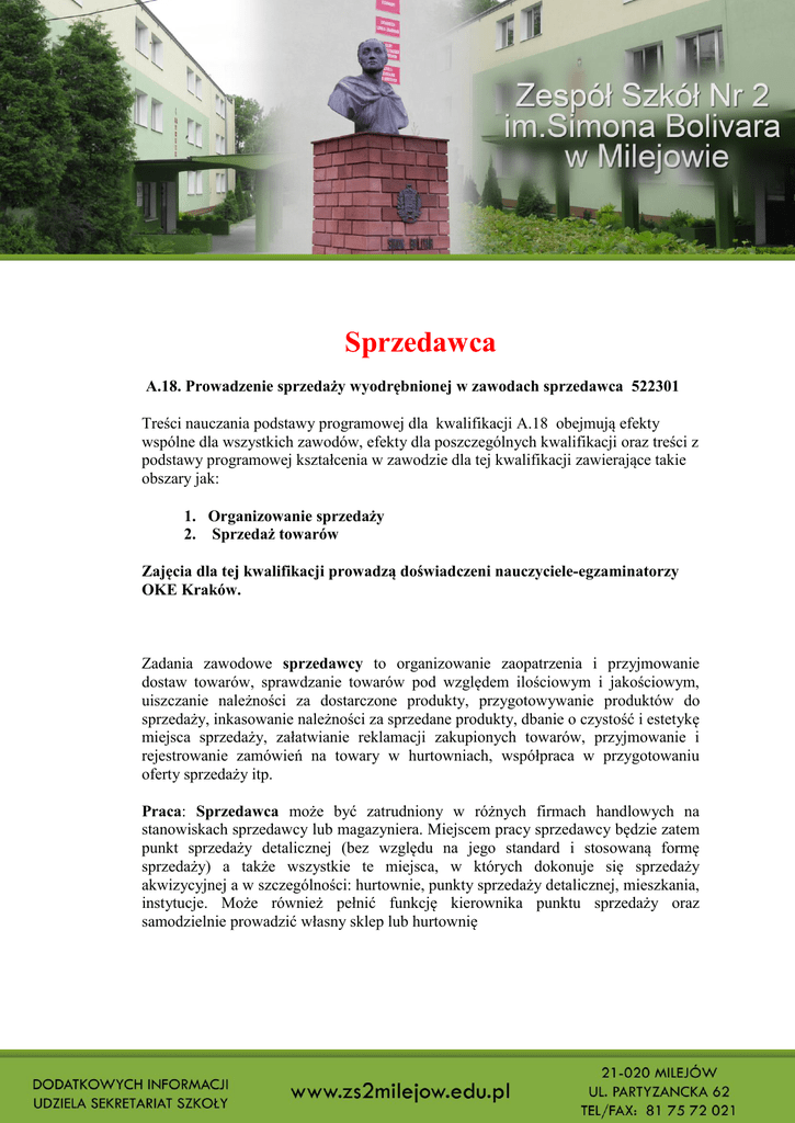 Sprzedawca A.18. Prowadzenie sprzedaży wyodrębnionej w zawodach sprzedawca 522301 Treści nauczania podstawy programowej dla kwalifikacji A.18 obejmują efekty wspólne dla wszystkich zawodów, efekty dla poszczególnych kwalifikacji oraz treści z podstawy programowej kształcenia w zawodzie dla tej kwalifikacji zawierające takie obszary jak: 1. Organizowanie sprzedaży 2. Sprzedaż towarów Zajęcia dla tej kwalifikacji prowadzą doświadczeni nauczyciele-egzaminatorzy OKE Kraków. Zadania zawodowe sprzedawcy to organizowanie zaopatrzenia i przyjmowanie dostaw towarów, sprawdzanie towarów pod względem ilościowym i jakościowym, uiszczanie należności za dostarczone produkty, przygotowywanie produktów do sprzedaży, inkasowanie należności za sprzedane produkty, dbanie o czystość i estetykę miejsca sprzedaży, załatwianie reklamacji zakupionych towarów, przyjmowanie i rejestrowanie zamówień na towary w hurtowniach, współpraca w przygotowaniu oferty sprzedaży itp. Praca: Sprzedawca może być zatrudniony w różnych firmach handlowych na stanowiskach sprzedawcy lub magazyniera. Miejscem pracy sprzedawcy będzie zatem punkt sprzedaży detalicznej (bez względu na jego standard i stosowaną formę sprzedaży) a także wszystkie te miejsca, w których dokonuje się sprzedaży akwizycyjnej a w szczególności: hurtownie, punkty sprzedaży detalicznej, mieszkania, instytucje. Może również pełnić funkcję kierownika punktu sprzedaży oraz samodzielnie prowadzić własny sklep lub hurtownię