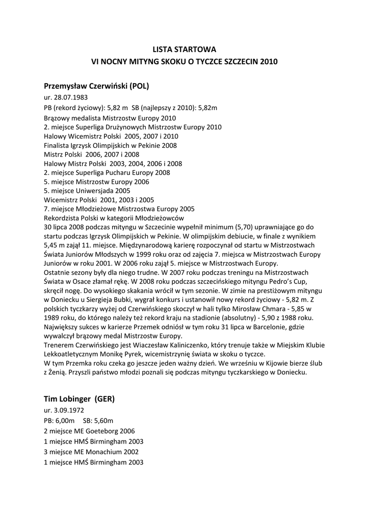 LISTA STARTOWA VI NOCNY MITYNG SKOKU O TYCZCE SZCZECIN 2010 Przemysław Czerwiński (POL) ur. 28.07.1983 PB (rekord życiowy): 5,82 m SB (najlepszy z 2010): 5,82m Brązowy medalista Mistrzostw Europy 2010 2. miejsce Superliga Drużynowych Mistrzostw Europy 2010 Halowy Wicemistrz Polski 2005, 2007 i 2010 Finalista Igrzysk Olimpijskich w Pekinie 2008 Mistrz Polski 2006, 2007 i 2008 Halowy Mistrz Polski 2003, 2004, 2006 i 2008 2. miejsce Superliga Pucharu Europy 2008 5. miejsce Mistrzostw Europy 2006 5. miejsce Uniwersjada 2005 Wicemistrz Polski 2001, 2003 i 2005 7. miejsce Młodzieżowe Mistrzostwa Europy 2005 Rekordzista Polski w kategorii Młodzieżowców 30 lipca 2008 podczas mityngu w Szczecinie wypełnił minimum (5,70) uprawniające go do startu podczas Igrzysk Olimpijskich w Pekinie. W olimpijskim debiucie, w finale z wynikiem 5,45 m zajął 11. miejsce. Międzynarodową karierę rozpoczynał od startu w Mistrzostwach Świata Juniorów Młodszych w 1999 roku oraz od zajęcia 7. miejsca w Mistrzostwach Europy Juniorów w roku 2001. W 2006 roku zajął 5. miejsce w Mistrzostwach Europy. Ostatnie sezony były dla niego trudne. W 2007 roku podczas treningu na Mistrzostwach Świata w Osace złamał rękę. W 2008 roku podczas szczecińskiego mityngu Pedro’s Cup, skręcił nogę. Do wysokiego skakania wrócił w tym sezonie. W zimie na prestiżowym mityngu w Doniecku u Siergieja Bubki, wygrał konkurs i ustanowił nowy rekord życiowy - 5,82 m. Z polskich tyczkarzy wyżej od Czerwińskiego skoczył w hali tylko Mirosław Chmara - 5,85 w 1989 roku, do którego należy też rekord kraju na stadionie (absolutny) - 5,90 z 1988 roku. Największy sukces w karierze Przemek odniósł w tym roku 31 lipca w Barcelonie, gdzie wywalczył brązowy medal Mistrzostw Europy. Trenerem Czerwińskiego jest Wiaczesław Kaliniczenko, który trenuje także w Miejskim Klubie Lekkoatletycznym Monikę Pyrek, wicemistrzynię świata w skoku o tyczce. W tym Przemka roku czeka go jeszcze jeden ważny dzień. We wrześniu w Kijowie bierze ślub z Żenią. Przyszli państwo młodzi poznali się podczas mityngu tyczkarskiego w Doniecku. Tim Lobinger (GER) ur. 3.09.1972 PB: 6,00m SB: 5,60m 2 miejsce ME Goeteborg 2006 1 miejsce HMŚ Birmingham 2003 3 miejsce ME Monachium 2002 1 miejsce HMŚ Birmingham 2003 Jeden ze starszych i bardziej doświadczonych zawodników wśród tyczkarzy, który w swojej karierze stawał na najwyższym stopniu podium na Mistrzostwach Świata i Europy. Należy do elitarnego „Klubu 6 metrów”, w którym jest tylko 17 tyczkarzy. Brał udział w trzech Igrzyskach Olimpijskich Denys Yurchenko (UKR) ur. 27.01.1978 PB: 5,85m SB: 5,72m 3 miejsce IO Pekin 2008 2 miejsce HME Birmingham 2007 2 miejsce HME Madryt 2005 3 miejsce HMŚ Budapeszt 2004 Wielokrotny Mistrz Ukrainy, dobrze znany w Szczecinie. Skakał tu podczas mityngu na Placu Zamenhofa oraz na mityngu Pedro’s Cup. Start na zakończonych niedawno ME w Barcelonie zupełnie mu nie wyszedł. Maksym Mazuryk (UKR) ur. 2.04.1983 PB: 5,82m SB: 5,80m 1 miejsce MŚJ Kingston 2002 3 miejsce MME Bydgoszcz 2003 4 miejsce MŚ Berlin 2009 2 miejsce ME Barcelona 2010 Zwycięzca IAAF World Athletics Final 2009 Fabio Gomes da Silva (BRA) ur. 4.08.1983 PB: 5,77m SB: 5,65m 1 miejsce Igrzyska Panamerykańskie 2007r. 1 miejsce Mistrzostwa Ameryki Południowej 2005, 2007 10 miejsce Mistrzostwa Świata Osaka 2007 Rekordzista Ameryki Południowej Štepăn Janacek (CZE) ur. 12.06. 1977 PB: 5,76m SB: 5,45m 2 miejsce Uniwersjada Palma de Mallorca 1999 i Pekin 2001 5 miejsce ME Monachium 2002 Sportową karierę rozpoczynał od gry w piłkę nożną i pływania. Od 2007 żonaty z polską sprinterką Grażyną Prokopek. W 2009 urodziła się im córka - Joanna. Janacek trzykrotnie reprezentował Czechy podczas Igrzysk Olimpijskich. We wszystkich swoich startach (Sydney 2000, Ateny 2004 i Pekin 2008) odpadał w eliminacjach. Aleksandr Gripich (RUS) Ur. 29.09.1986 PB: 5,75m SB: 5,70m 5 miejsce MŚ Berlin 2009 1 miejsce Uniwersjada Belgrad 2009 Jan Kudlicka (CZE) Ur. 29.04.1988 PB: 5,70m SB: 5,65m 10 zawodnik ME w Barcelonie (5,60) i konkursu olimpijskiego w Pekinie. Aleksey Kovalchuk (RUS) Ur. 22.7.1988 PB: 5,50m SB: 5,50m Paweł Wojciechowski (POL) Ur. 6.06.1989 PB: 5,50m SB: 5,50m 2 miejsce MŚJ Bydgoszcz 2008 Adam Lisiak (POL) Ur.08.05.1990 PB: 5,10