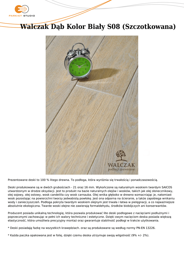Walczak Dąb Kolor Biały S08 (Szczotkowana) Prezentowane deski to 100 % litego drewna. To podłoga, która wyróżnia się trwałością i ponadczasowością. Deski produkowane są w dwóch grubościach - 21 oraz 16 mm. Wykończone są naturalnym woskiem twardym SAICOS utwardzonym w drodze oksydacji. Jest to produkt na bazie naturalnych olejów i wosków, takich jak olej słonecznikowy, olej sojowy, olej ostowy, wosk candelilla czy wosk carnauba. Olej wnika głęboko w drewno wzmacniając je, natomiast wosk pozostając na powierzchni tworzy jedwabistą powłokę. Jest ona odporna na ścieranie, a także zapobiega wnikaniu wody i zanieczyszczeń. Podłoga pokryta twardym woskiem olejnym jest trwała i łatwa w pielęgnacji, a co najważniejsze absolutnie ekologiczna. Twarde woski olejne nie zawierają formaldehydu, środków biobójczych ani konserwantów. Producent posiada unikalną technologię, która pozwala produkować lite deski podłogowe z nacięciami podłużnymi i poprzecznymi zachowując w pełni ich walory techniczne i estetyczne. Dzięki owym nacięciom deska posiada większą elastyczność, która umożliwia precyzyjny montaż oraz gwarantuje stabilność podłogi w trakcie użytkowania. * Deski posiadają fazkę na wszystkich krawędziach. oraz są produkowane są według normy PN-EN 13226. * Każda paczka opakowana jest w folię, dzięki czemu deska utrzymuje swoją wilgotność (9% +/- 2%).