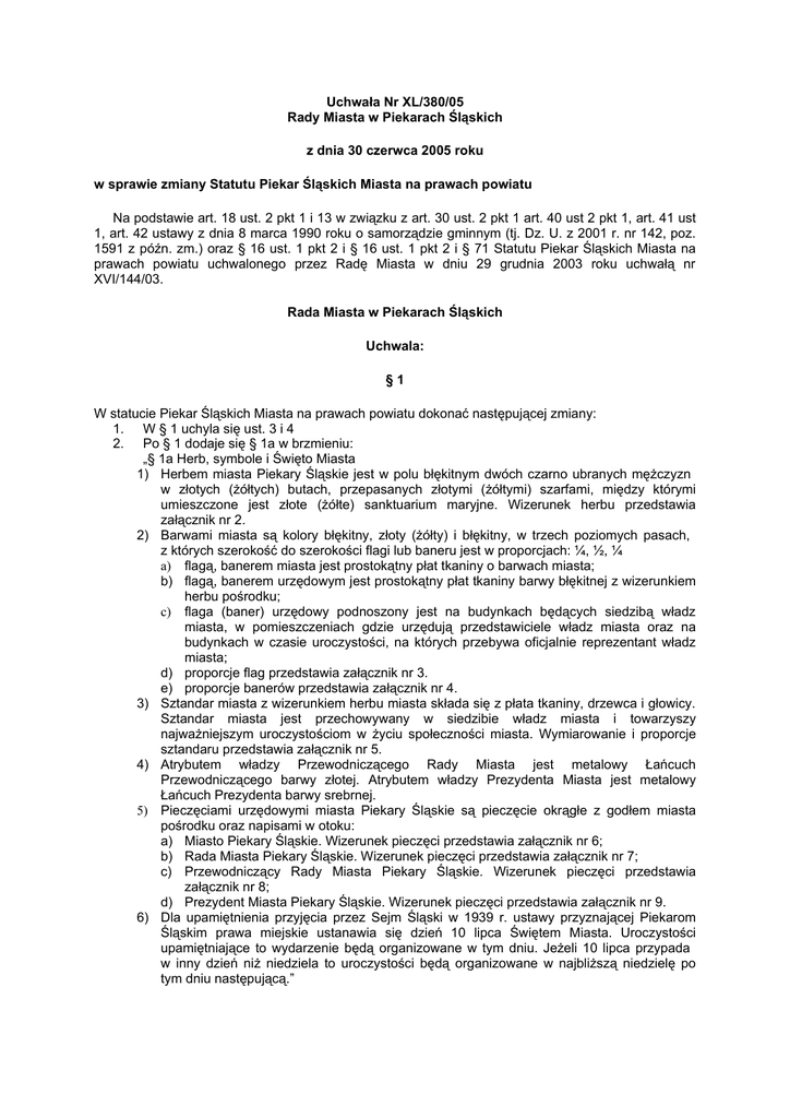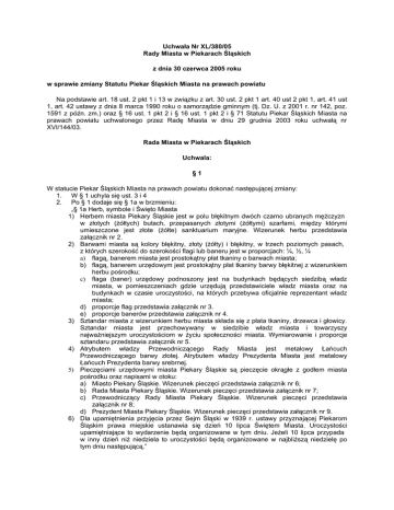 Uchwała Nr XL/380/05 Rady Miasta w Piekarach Śląskich z dnia 30 czerwca 2005 roku w sprawie zmiany Statutu Piekar Śląskich Miasta na prawach powiatu Na podstawie art. 18 ust. 2 pkt 1 i 13 w związku z art. 30 ust. 2 pkt 1 art. 40 ust 2 pkt 1, art. 41 ust 1, art. 42 ustawy z dnia 8 marca 1990 roku o samorządzie gminnym (tj. Dz. U. z 2001 r. nr 142, poz. 1591 z późn. zm.) oraz § 16 ust. 1 pkt 2 i § 16 ust. 1 pkt 2 i § 71 Statutu Piekar Śląskich Miasta na prawach powiatu uchwalonego przez Radę Miasta w dniu 29 grudnia 2003 roku uchwałą nr XVI/144/03. Rada Miasta w Piekarach Śląskich Uchwala: §1 W statucie Piekar Śląskich Miasta na prawach powiatu dokonać następującej zmiany: 1. W § 1 uchyla się ust. 3 i 4 2. Po § 1 dodaje się § 1a w brzmieniu: „§ 1a Herb, symbole i Święto Miasta 1) Herbem miasta Piekary Śląskie jest w polu błękitnym dwóch czarno ubranych mężczyzn w złotych (żółtych) butach, przepasanych złotymi (żółtymi) szarfami, między którymi umieszczone jest złote (żółte) sanktuarium maryjne. Wizerunek herbu przedstawia załącznik nr 2. 2) Barwami miasta są kolory błękitny, złoty (żółty) i błękitny, w trzech poziomych pasach, z których szerokość do szerokości flagi lub baneru jest w proporcjach: ¼, ½, ¼ a) flagą, banerem miasta jest prostokątny płat tkaniny o barwach miasta; b) flagą, banerem urzędowym jest prostokątny płat tkaniny barwy błękitnej z wizerunkiem herbu pośrodku; c) flaga (baner) urzędowy podnoszony jest na budynkach będących siedzibą władz miasta, w pomieszczeniach gdzie urzędują przedstawiciele władz miasta oraz na budynkach w czasie uroczystości, na których przebywa oficjalnie reprezentant władz miasta; d) proporcje flag przedstawia załącznik nr 3. e) proporcje banerów przedstawia załącznik nr 4. 3) Sztandar miasta z wizerunkiem herbu miasta składa się z płata tkaniny, drzewca i głowicy. Sztandar miasta jest przechowywany w siedzibie władz miasta i towarzyszy najważniejszym uroczystościom w życiu społeczności miasta. Wymiarowanie i proporcje sztandaru przedstawia załącznik nr 5. 4) Atrybutem władzy Przewodniczącego Rady Miasta jest metalowy Łańcuch Przewodniczącego barwy złotej. Atrybutem władzy Prezydenta Miasta jest metalowy Łańcuch Prezydenta barwy srebrnej. 5) Pieczęciami urzędowymi miasta Piekary Śląskie są pieczęcie okrągłe z godłem miasta pośrodku oraz napisami w otoku: a) Miasto Piekary Śląskie. Wizerunek pieczęci przedstawia załącznik nr 6; b) Rada Miasta Piekary Śląskie. Wizerunek pieczęci przedstawia załącznik nr 7; c) Przewodniczący Rady Miasta Piekary Śląskie. Wizerunek pieczęci przedstawia załącznik nr 8; d) Prezydent Miasta Piekary Śląskie. Wizerunek pieczęci przedstawia załącznik nr 9. 6) Dla upamiętnienia przyjęcia przez Sejm Śląski w 1939 r. ustawy przyznającej Piekarom Śląskim prawa miejskie ustanawia się dzień 10 lipca Świętem Miasta. Uroczystości upamiętniające to wydarzenie będą organizowane w tym dniu. Jeżeli 10 lipca przypada w inny dzień niż niedziela to uroczystości będą organizowane w najbliższą niedzielę po tym dniu następującą.” §2 Załącznik nr 2 do statutu otrzymuje brzmienie określone w załączniku nr 1 do niniejszej uchwały. §3 Obecne załączniki nr 3 i 4 do statutu otrzymują odpowiednio nowe numery 10 i 11. §4 1. Załącznik nr 3 do statutu otrzymuje brzmienie określone w załączniku nr 2 do niniejszej uchwały. 2. Załącznik nr 4 do statutu otrzymuje brzmienie określone w załączniku nr 3 do niniejszej uchwały. 3. Po załączniku nr 4 do statutu dodaje się załączniki nr 5 w brzmieniu określonym w załączniku 4 do niniejszej uchwały. 4. Po załączniku nr 5 do statutu dodaje się załączniki nr 6, 7, 8, 9 w brzmieniu określonym odpowiednio w załącznikach 5, 6, 7, 8 do niniejszej uchwały. §5 Zmiana Statutu podlega ogłoszenia w Dzienniku Urzędowym Województwa Śląskiego. §6 Wykonanie uchwały powierza się Prezydentowi Miasta Piekary Śląskie. §7 Uchwała wchodzi w życie po upływie 14 dni od dnia jej ogłoszenia w Dzienniku Urzędowym Województwa Śląskiego. Przewodniczący Rady Miasta w Piekarach Śląskich /-/ Piotr Płaczek Uzasadnienie W uchwalonej przez Radę Miasta w marcu 2004 roku „Strategii Rozwoju Miasta Piekary Śląskie do roku 2015” podkreśla się, iż „Piekary Śląskie są wspólnie z Górą Świętej Anny duchową stolicą Górnego Śląska stanowią silny ośrodek kultu religijnego posiadający także walory turystyczne. W otoczeniu, miasto Piekary Śląskie kojarzy się przede wszystkim jako ośrodek kultu maryjnego i pielgrzymek stanowych mężczyzn i kobiet. Kompleks sakralny tworzą: Bazylika i Kalwaria. (…).” Biorąc pod uwagę zapisy naszej Strategii Rozwoju Miasta oraz wolę kontynuowania kreowania wizerunku Piekar Śląskich jako miasta pielgrzymkowego Prezydent Miasta podjął w ubiegłym roku decyzję o uruchomieniu prac nad uwidocznieniem pielgrzymkowego charakteru miasta w naszym herbie. Po konsultacjach z heraldykami okazało się, że istnieje możliwość użycia symbolicznego wizerunku bazyliki piekarskiej w herbie naszego miasta. Obecny herb jest utwierdzony długą tradycją, jego zmiana może polegać tylko na odmienieniu godła. Zaproponowano umieszczenie Bazyliki koloru żółtego pomiędzy mężczyznami, oddzielając ich zarazem od siebie. Jej podstawa powinna znajdować się na wysokości ich ramion.