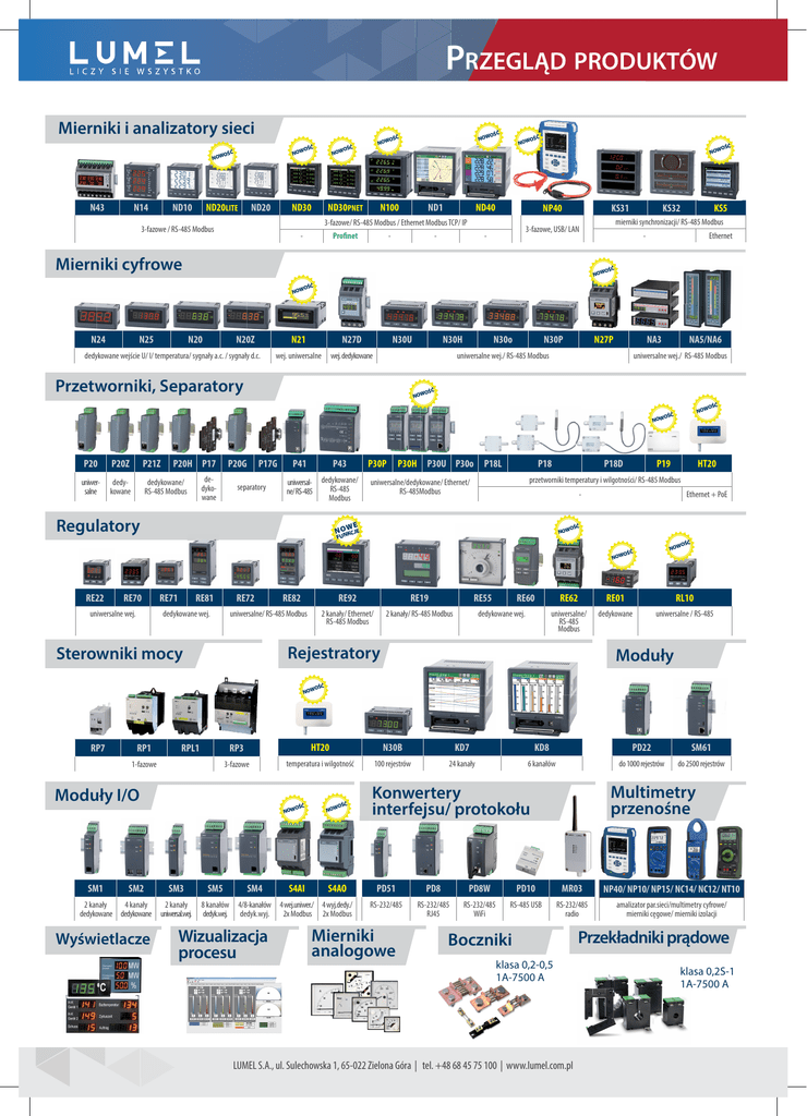 PRZEGLĄD PRODUKTÓW Mierniki i analizatory sieci OŚĆ NOW OŚĆ NOW N43 N14 ND10 ND20LITE ND20 ND30 OŚĆ NOW OŚĆ NOW OŚĆ NOW ND30PNET N100 ND1 OŚĆ NOW ND40 NP40 3-fazowe/ RS-485 Modbus / Ethernet Modbus TCP/ IP 3-fazowe / RS-485 Modbus Profinet - - - OŚĆ NOW KS31 3-fazowe, USB/ LAN - Mierniki cyfrowe KS32 KS5 mierniki synchronizacji/ RS-485 Modbus - Ethernet OŚĆ NOW OŚĆ NOW N24 N25 N20 N20Z dedykowane wejście U/ I/ temperatura/ sygnały a.c. / sygnały d.c. N21 N27D wej. uniwersalne wej. dedykowane N30U N30H N30o N30P N27P NA3 uniwersalne wej./ RS-485 Modbus Przetworniki, Separatory NA5/NA6 uniwersalne wej./ RS-485 Modbus OŚĆ NOW OŚĆ NOW OŚĆ NOW P20 P20Z P21Z uniwersalne dedykowane dedykowane/ RS-485 Modbus P20H P17 P20G dedykowane P17G separatory P41 P43 uniwersal- dedykowane/ RS-485 ne/ RS-485 Modbus Regulatory P30P P30H P30U P30o P18L P18 P18D P19 - E N ONW KCJE Ethernet + PoE OŚĆ NOW FU OŚĆ NOW OŚĆ NOW RE22 RE70 uniwersalne wej. RE71 RE81 RE72 dedykowane wej. RE82 uniwersalne/ RS-485 Modbus RE92 RE19 2 kanały/ Ethernet/ RS-485 Modbus 2 kanały/ RS-485 Modbus RE55 RE60 dedykowane wej. RE62 RE01 RL10 uniwersalne/ RS-485 Modbus dedykowane uniwersalne / RS-485 Rejestratory Sterowniki mocy HT20 przetworniki temperatury i wilgotności/ RS-485 Modbus uniwersalne/dedykowane/ Ethernet/ RS-485Modbus Moduły OŚĆ NOW RP7 RP1 RP3 HT20 N30B KD7 KD8 PD22 SM61 3-fazowe temperatura i wilgotność 100 rejestrów 24 kanały 6 kanałów do 1000 rejestrów do 2500 rejestrów RPL1 1-fazowe Moduły I/O SM1 SM2 2 kanały 4 kanały dedykowane dedykowane Wyświetlacze SM3 SM5 2 kanały uniwersal.wej. 8 kanałów dedyk.wej. SM4 OŚĆ NOW OŚĆ NOW S4AI S4AO 4/8-kanałów 4 wej.uniwer./ 4 wyj.dedy./ dedyk.wyj. 2x Modbus 2x Modbus Wizualizacja procesu Multimetry przenośne Konwertery interfejsu/ protokołu PD51 PD8 PD8W PD10 MR03 NP40/ NP10/ NP15/ NC14/ NC12/ NT10 RS-232/485 RS-232/485 RJ45 RS-232/485 WiFi RS-485 USB RS-232/485 radio amalizator par.sieci/multimetry cyfrowe/ mierniki cęgowe/ mierniki izolacji Mierniki analogowe Boczniki klasa 0,2-0,5 1A-7500 A LUMEL S.A., ul. Sulechowska 1, 65-022 Zielona Góra | tel. +48 68 45 75 100 | www.lumel.com.pl Przekładniki prądowe klasa 0,2S-1 1A-7500 A PROJEKTOWANIE I WYKONAWSTWO SYSTEMÓW AUTOMATYKI Odbiorcy AKP cenią sobie kompleksowość oferty, która dotyczy nie tylko wyrobów, ale także wykonania całego systemu na ich bazie. W odpowiedzi na oczekiwania klientów proponujemy usługi Pracowni Systemów Automatyki. Oferta nasza obejmuje tzw. realizację „pod klucz” , tzn.: • kompleksową analizę stanu obecnego u klienta, • ustalenie oczekiwań klienta, • dobór odpowiednich urządzeń i oprogramowania, • projekt i wykonawstwo szaf sterowniczych, • instalację systemu na obiekcie, • uruchomienie systemu na obiekcie, • szkolenie klientów w zakresie obsługi, • serwis gwarancyjny i pogwarancyjny. Główne obszary działalności: • systemy kontroli zużycia energii elektrycznej oraz parametrów sieci, • monitoring wydajności linii produkcyjnych, zużycia materiałów i mediów, • stacje badawcze i laboratoryjne, • systemy pomiaru i kontroli temperatury, wilgotności, jak również innych parametrów fizycznych, • przenośne zestawy pomiarowe. Projektujemy systemy automatyki dla firm przemysłowych wielu branż. Ze względu na szybki proces zwrotu inwestycji najbardziej popularne są obecnie systemy monitorujące efektywność linii produkcyjnych oraz pozwalające na kontrolę zużycia energii elektrycznej. Proponowane przez nas i cieszące się dużą popularnością systemy kontroli parametrów sieci zasilającej umożliwiają: • kontrolę zużytej energii elektrycznej na poszczególnych liniach/maszynach produkcyjnych, • uniknięcie kar umownych za przekroczenie mocy 15 minutowej, cos i tg, • pomoc w rozliczaniu kosztów, • zmniejszenie rachunków za energię elektryczną. Oferowane systemy mogą być w łatwy sposób rozbudowywane o kontrolę innych mediów np. zużycie wody, sprężonego powietrza, pary, ścieków itp. Wykonywane przez nas systemy oceny efektywności linii produkcyjnych zapewniają: • dostarczenie kompleksowych danych dotyczących: - ilości wyprodukowanych materiałów, - ilości oraz czasów planowanych i nieplanowanych przestojów produkcyjnych. • oprogramowanie do kompleksowej analizy efektywności linii produkcyjnych – zarówno programy ze standardowej oferty, jak i napisane pod zamówienie klienta zgodnie z jego specjalnymi wymaganiami. • poprawę jakości i efektywności oraz obniżenie kosztów produkcyjnych. Na rynku wyróźnia nas fakt, iż mogą Państwo zamówić kompleksową obsługę bezpośrednio u producenta aparatury i oprogramowania. Nasze urządzenia i oprogramowanie możemy dostosować do Państwa wymagań, spełniając przy tym najwyższe standardy. przykładowe szafy sterownicze przenośny zestaw pomiarowy przykładowy raport z wykonania planu produkcyjnego program napisany na życzenie klienta monitoring i sterowanie procesem produkcyjnym za pomocą programu LUMEL-PROCES O nas Usługi EMS Należymy do czołowych europejskich producentów urządzeń automatyki przemysłowej. Działamy na rynku od 1953 r. Wysoką pozycję na rynku osiągneliśmy dzięki konsekwentnie prowadzonej polityce rozwoju, kompetencjom naszych pracowników oraz nowoczesnym środkom techniki projektowania, produkcji i badań. Oferujemy: • jednostronny i dwustronny montaż elementów SMD w technologii lutowania rozpływowego • montaż elementów przewlekanych metodą lutowania na fali; • uzupełniający montaż elementów przewlekanych i mechanicznych; • montaż mieszany; • kontrolę optyczną zmontowanych płytek. Dostarczamy kompleksowe rozwiązania dla energetyki i automatyki premysłowej, jak i przemysłu motoryzacyjnego, chemicznego, hutniczego oraz HVAC. Nasza działalność koncentruje się w nastepujących obszarach biznesowych: • produkcji urządzeń a