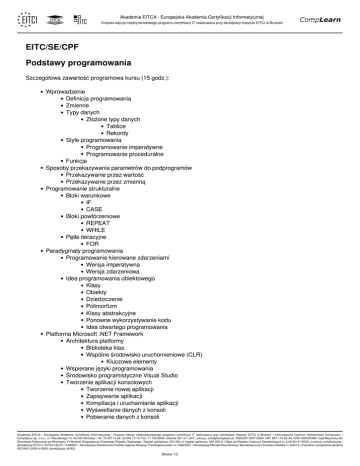 Akademia EITCA - Europejska Akademia Certyfikacji Informatycznej Krajowa edycja międzynarodowego programu certyfikacji IT realizowana przy akredytacji Instytutu EITCI w Brukseli EITC/SE/CPF Podstawy programowania Szczegółowa zawartość programowa kursu (15 godz.): Wprowadzenie Definicja programowania Zmienne Typy danych Złożone typy danych Tablice Rekordy Style programowania Programowanie imperatywne Programowanie proceduralne Funkcje Sposoby przekazywania parametrów do podprogramów Przekazywanie przez wartość Przekazywanie przez zmienną Programowanie strukturalne Bloki warunkowe IF CASE Bloki powtórzeniowe REPEAT WHILE Pętle iteracyjne FOR Paradygmaty programowania Programowanie kierowane zdarzeniami Wersja imperatywna Wersja zdarzeniowa Idea programowania obiektowego Klasy Obiekty Dziedziczenie Polimorfizm Klasy abstrakcyjne Ponowne wykorzystywanie kodu Idea otwartego programowania Platforma Microsoft .NET Framework Architektura platformy Biblioteka klas Wspólne środowisko uruchomieniowe (CLR) Kluczowe elementy Wspierane języki programowania Środowisko programistyczne Visual Studio Tworzenie aplikacji konsolowych Tworzenie nowej aplikacji Zapisywanie aplikacji Kompilacja i uruchamianie aplikacji Wyświetlanie danych z konsoli Pobieranie danych z konsoli Akademia EITCA - Europejska Akademia Certyfikacji Informatycznej | Krajowa edycja międzynarodowego programu certyfikacji IT realizowana przy akredytacji Instytutu EITCI w Brukseli | Informatyczne Centrum Szkoleniowe CompLearn | CompSecur sp. z o.o., ul. Piłsudskiego 74, 50-020 Wrocław | Tel: 79 457 14 69, 53 542 13 74, Fax: 71 722 8049, Infolinia: 801 011 647 | eitca.pl, [email protected] | REGON: 020713664, NIP: 897-173-92-49, KRS: 0000303601 Sąd Rejonowy dla Wrocławia-Fabrycznej we Wrocławiu VI Wydział Gospodarczy Krajowego Rejestru Sądowego | Kapitał zakładowy: 500 000 zł, kapitał wpłacony: 500 000 zł | Wpis do Rejestru Instytucji Szkoleniowych nr 2.02/00147/2009 | Licencja certyfikacyjna i akredytacja EITCI nr EITCI-LID-PL-11080001 | Akredytacja Szkoleniowa Polskiej Agencji Rozwoju Przedsiębiorczości nr 1588/2007 | Akredytacja Ministerstwa Edukacji Narodowej przez Kuratora Oświaty nr 8/2014 | Certyfikat zarządzania jakością ISO 9001:2008 nr 8242 (akredytacja UKAS) Strona 1/2 Akademia EITCA - Europejska Akademia Certyfikacji Informatycznej Krajowa edycja międzynarodowego programu certyfikacji IT realizowana przy akredytacji Instytutu EITCI w Brukseli Model obiektowy środowiska .NET Struktura programu w języku C# Zmienne Deklaracja zmiennej Typy danych Typy tablicowe Operatory Operatory pierwotne Operatory arytmetyczne Operatory logiczne Operatory przypisania Pierwszeństwo operatorów Przeciążanie operatorów Funkcje jako metody Wywoływanie metody Przekazywanie parametrów przez zmienną i wartość Struktury sterowania przepływem Instrukcja warunkowa Instrukcja wyboru Pętle warunkowe Iterator FOREACH Pętla FOR Klasy w języku C# Definiowanie klas Widoczność elementów składowych Metody Przeciążanie metod Metody statyczne Atrybuty Konstruktory Wywoływanie Destruktory Tworzenie i operowanie na obiektach Odwoływanie się do składowych obiektu Dziedziczenie Przykłady zastosowania Polimorfizm-metody wirtualne Klasy i metody abstrakcyjne Rzutowanie typów Model obiektowy Windows Forms Definicja środowiska typu RAD Aplikacje typu RAD Tworzenie nowej aplikacji okienkowej Struktura aplikacji Uruchamianie aplikacji Tworzenie i dodawanie kontrolek Edycja atrybutów Implementacja obsługi zdarzeń Akademia EITCA - Europejska Akademia Certyfikacji Informatycznej | Krajowa edycja międzynarodowego programu certyfikacji IT realizowana przy akredytacji Instytutu EITCI w Brukseli | Informatyczne Centrum Szkoleniowe CompLearn | CompSecur sp. z o.o., ul. Piłsudskiego 74, 50-020 Wrocław | Tel: 79 457 14 69, 53 542 13 74, Fax: 71 722 8049, Infolinia: 801 011 647 | eitca.pl, [email protected] | REGON: 020713664, NIP: 897-173-92-49, KRS: 0000303601 Sąd Rejonowy dla Wrocławia-Fabrycznej we Wrocławiu VI Wydział Gospodarczy Krajowego Rejestru Sądowego | Kapitał zakładowy: 500 000 zł, kapitał wpłacony: 500 000 zł | Wpis do Rejestru Instytucji Szkoleniowych nr 2.02/00147/2009 | Licencja certyfikacyjna i akredytacja EITCI nr EITCI-LID-PL-11080001 | Akredytacja Szkoleniowa Polskiej Agencji Rozwoju Przedsiębiorczości nr 1588/2007 | Akredytacja Ministerstwa Edukacji Narodowej przez Kuratora Oświaty nr 8/2014 | Certyfikat zarządzania jakością ISO 9001:2008 nr 8242 (akredytacja UKAS) Strona 2/2 Powered by TCPDF (www.tcpdf.org)