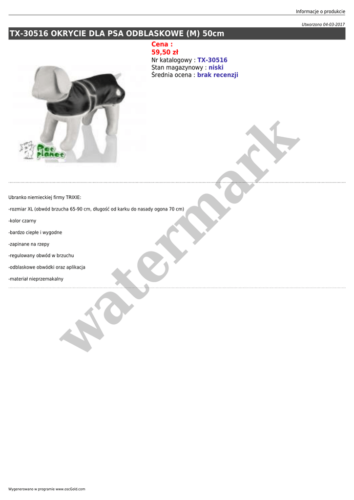 Informacje o produkcie Utworzono 04-03-2017 TX-30516 OKRYCIE DLA PSA ODBLASKOWE (M) 50cm Cena : 59,50 zł Ubranko niemieckiej firmy TRIXIE: er m ar k Nr katalogowy : TX-30516 Stan magazynowy : niski Średnia ocena : brak recenzji -rozmiar XL (obwód brzucha 65-90 cm, długość od karku do nasady ogona 70 cm) -kolor czarny -bardzo ciepłe i wygodne -zapinane na rzepy -regulowany obwód w brzuchu -odblaskowe obwódki oraz aplikacja w at -materiał nieprzemakalny Wygenerowano w programie www.oscGold.com