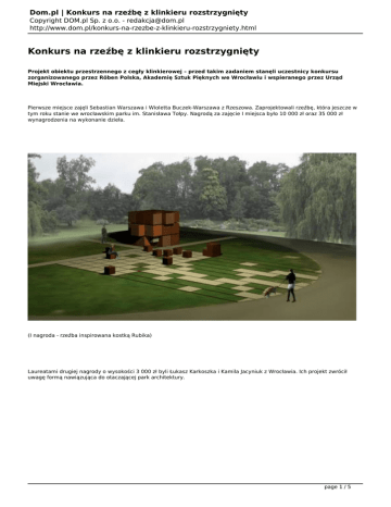 Dom.pl | Konkurs na rzeźbę z klinkieru rozstrzygnięty Copyright DOM.pl Sp. z o.o. - [email protected] http://www.dom.pl/konkurs-na-rzezbe-z-klinkieru-rozstrzygniety.html Konkurs na rzeźbę z klinkieru rozstrzygnięty Projekt obiektu przestrzennego z cegły klinkierowej – przed takim zadaniem stanęli uczestnicy konkursu zorganizowanego przez Röben Polska, Akademię Sztuk Pięknych we Wrocławiu i wspieranego przez Urząd Miejski Wrocławia. Pierwsze miejsce zajęli Sebastian Warszawa i Wioletta Buczek-Warszawa z Rzeszowa. Zaprojektowali rzeźbę, która jeszcze w tym roku stanie we wrocławskim parku im. Stanisława Tołpy. Nagrodą za zajęcie I miejsca było 10 000 zł oraz 35 000 zł wynagrodzenia na wykonanie dzieła. (I nagroda - rzeźba inspirowana kostką Rubika) Laureatami drugiej nagrody o wysokości 3 000 zł byli Łukasz Karkoszka i Kamila Jacyniuk z Wrocławia. Ich projekt zwrócił uwagę formą nawiązująca do otaczającej park architektury. page 1 / 5 Dom.pl | Konkurs na rzeźbę z klinkieru rozstrzygnięty Copyright DOM.pl Sp. z o.o. - [email protected] http://www.dom.pl/konkurs-na-rzezbe-z-klinkieru-rozstrzygniety.html (II nagroda) Trzecią nagrodę o wysokości 1500 zł otrzymali Agnieszka Borowska i Michał Walczak z Warszawy. page 2 / 5 Dom.pl | Konkurs na rzeźbę z klinkieru rozstrzygnięty Copyright DOM.pl Sp. z o.o. - [email protected] http://www.dom.pl/konkurs-na-rzezbe-z-klinkieru-rozstrzygniety.html (Laureaci III nagrody) Przyznano także dwa wyróżnienia – dla Alojzego Gryta, emerytowanego profesora wrocławskiej ASP, oraz Alexandra Smaga z Wiednia. Łącznie do konkursu zgłoszono 24 prace, z Polski i z zagranicy. page 3 / 5 Dom.pl | Konkurs na rzeźbę z klinkieru rozstrzygnięty Copyright DOM.pl Sp. z o.o. - [email protected] http://www.dom.pl/konkurs-na-rzezbe-z-klinkieru-rozstrzygniety.html (Wernisaż wystawy prac konkursowych) W jury konkursy zasiedli: prof. Adam Myjak – Rektor Elekt ASP w Warszawie – przewodniczący Jury prof. Katarzyna Koczyńska-Kielan – Wydział Ceramiki i Szkła ASP im. Eugeniusza Gepperta we Wrocławiu – sędzia referent prof. Kazimierz Raba – Dziekan Wydziału Rzeźby Uniwersytetu Artystycznego w Poznaniu prof. Christos Mandzios – Dziekan Wydziału Malarstwa i Rzeźby ASP im. Eugeniusza Gepperta we Wrocławiu page 4 / 5 Dom.pl | Konkurs na rzeźbę z klinkieru rozstrzygnięty Copyright DOM.pl Sp. z o.o. - [email protected] http://www.dom.pl/konkurs-na-rzezbe-z-klinkieru-rozstrzygniety.html Lidia Misiuna – Kierownik ds. marketingu, Röben Polska Krzysztof Omilian – Koordynator ds. kierowników regionów, Röben Polska Beata Urbanowicz - Koordynator projektu plastycznego wystroju miasta, Wydział Architektury i Budownictwa, Urząd Miejski Wrocławia Katarzyna Hawrylak-Brzezowska – Miejski Konserwator Zabytków, Urząd Miejski Wrocławia (Wystawa w auli wrocławskiej ASP) page 5 / 5