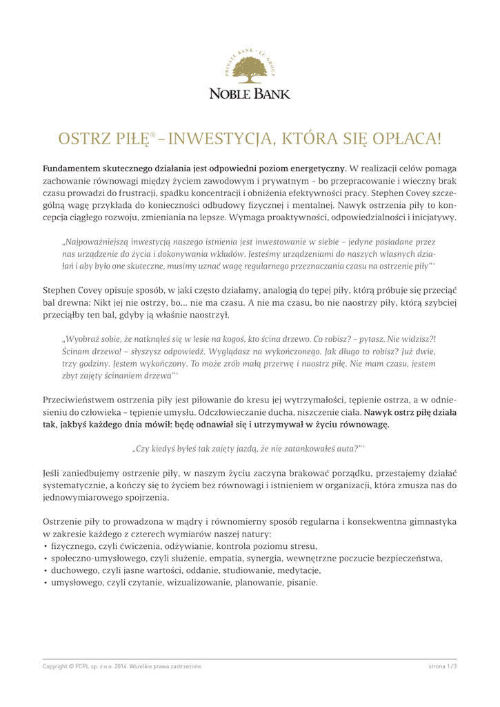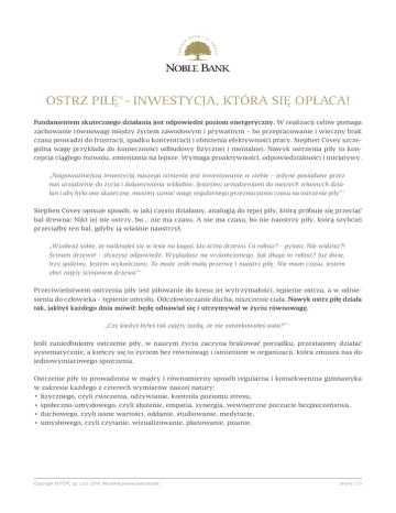 Ostrz piłę® – inwestycja, która się opłaca! Fundamentem skutecznego działania jest odpowiedni poziom energetyczny. W realizacji celów pomaga zachowanie równowagi między życiem zawodowym i prywatnym – bo przepracowanie i wieczny brak czasu prowadzi do frustracji, spadku koncentracji i obniżenia efektywności pracy. Stephen Covey szczególną wagę przykłada do konieczności odbudowy fizycznej i mentalnej. Nawyk ostrzenia piły to koncepcja ciągłego rozwoju, zmieniania na lepsze. Wymaga proaktywności, odpowiedzialności i inicjatywy. „Najpoważniejszą inwestycją naszego istnienia jest inwestowanie w siebie – jedyne posiadane przez nas urządzenie do życia i dokonywania wkładów. Jesteśmy urządzeniami do naszych własnych działań i aby było one skuteczne, musimy uznać wagę regularnego przeznaczania czasu na ostrzenie piły”* Stephen Covey opisuje sposób, w jaki często działamy, analogią do tępej piły, którą próbuje się przeciąć bal drewna: Nikt jej nie ostrzy, bo... nie ma czasu. A nie ma czasu, bo nie naostrzy piły, którą szybciej przeciąłby ten bal, gdyby ją właśnie naostrzył. „Wyobraź sobie, że natknąłeś się w lesie na kogoś, kto ścina drzewo. Co robisz? – pytasz. Nie widzisz?! Ścinam drzewo! – słyszysz odpowiedź. Wyglądasz na wykończonego. Jak długo to robisz? Już dwie, trzy godziny. Jestem wykończony. To może zrób małą przerwę i naostrz piłę. Nie mam czasu, jestem zbyt zajęty ścinaniem drzewa”* Przeciwieństwem ostrzenia piły jest piłowanie do kresu jej wytrzymałości, tępienie ostrza, a w odniesieniu do człowieka – tępienie umysłu. Odczłowieczanie ducha, niszczenie ciała. Nawyk ostrz piłę działa tak, jakbyś każdego dnia mówił: będę odnawiał się i utrzymywał w życiu równowagę. „Czy kiedyś byłeś tak zajęty jazdą, że nie zatankowałeś auta?”* Jeśli zaniedbujemy ostrzenie piły, w naszym życiu zaczyna brakować porządku, przestajemy działać systematycznie, a kończy się to życiem bez równowagi i istnieniem w organizacji, która zmusza nas do jednowymiarowego spojrzenia. Ostrzenie piły to prowadzona w mądry i równomierny sposób regularna i konsekwentna gimnastyka w zakresie każdego z czterech wymiarów naszej natury: • fizycznego, czyli ćwiczenia, odżywianie, kontrola poziomu stresu, • społeczno-umysłowego, czyli służenie, empatia, synergia, wewnętrzne poczucie bezpieczeństwa, • duchowego, czyli jasne wartości, oddanie, studiowanie, medytacje, • umysłowego, czyli czytanie, wizualizowanie, planowanie, pisanie. Copyright © FCPL sp. z o.o. 2014. Wszelkie prawa zastrzeżone. strona 1 / 3 Przyjrzyjmy się każdemu z nich! I. Obszar fizyczny Aby odnawiać się fizycznie, skorzystaj z następujących wskazówek: • dostarczaj swojemu organizmowi niezbędnej porcji snu, • wyznacz sobie konkretny cel związany z podnoszeniem kondycji organizmu (np. regularne bieganie, obniżenie poziomu cholesterolu, osiągnięcie optymalnej wagi), • do swojej diety włącz warzywa, owoce, produkty pełnoziarniste, błonnik i duże ilości wody, • ćwicz regularnie, zwiększając elastyczność mięśni, siłę oraz wydolność serca i płuc, • zredukuj poziom stresu, nie dawaj się schwytać w pułapkę rzeczy pilnych! II. Obszar społeczno-emocjonalny Aby odnawiać się w wymiarze społeczno-emocjonalnym, skorzystaj z następujących wskazówek: • staraj się stale ulepszać swoje związki z innymi poprzez regularne dokonywanie wpłat na emocjonalne konta bankowe, • doceniaj różnice poglądów i postaw, szukaj możliwości tworzenia synergii, • regularnie wykorzystuj umiejętność empatycznego słuchania w relacjach z osobami, które są dla Ciebie ważne, • poszerzaj krąg znajomych i przyjaciół, • wybaczaj sobie, i tym, którzy Cię zranili, • buduj więzi rodzinne – te bliskie i te dalekie, • zrezygnuj z destrukcyjnego zwyczaju porównywania się do innych. III. Obszar umysłowy Aby odnawiać swój umysł, skorzystaj z następujących wskazówek: • prowadź dziennik, niech Twój dziennik stanie się miejscem, w którym analizujesz i rozwiązujesz swoje problemy, • wypracuj w sobie nałóg czytania, • zbieraj cytaty i złote myśli – przemyślenia wielkich ludzi pobudzają umysł do pracy, • rozwijaj swoje hobby – to pozwoli Ci zajmować się tym, co naprawdę lubisz, • kontynuuj swoją edukację – ucz się patrzeć na siebie z innej perspektywy i odkrywać własne paradygmaty. IV. Obszar duchowy Aby odnawiać się w wymiarze duchowym, skorzystaj z następujących wskazówek: • stwórz swoją misję życiową i regularnie ją przeglądaj i rozwijaj, • naucz się czerpać radość z kontaktu z naturą, • czytaj inspirującą literaturę, szczególnie biografie ludzi, których życie i dokonania mogą być dla Ciebie źródłem natchnienia, • staraj się żyć w sposób spójny z Twoimi życiowymi priorytetami, • słuchaj muzyki, która Cię inspiruje i podnosi na duchu, Copyright © FCPL sp. z o.o. 2014. Wszelkie prawa zastrzeżone. strona 2 / 3 • zaangażuj się w działania społeczne – przeznacz na ten cel swój czas, pieniądze i energię, • praktykuj religię lub inne działania, które wzbogacają Cię duchowo. Kiedy staramy się odnawiać regularnie w czterech obszarach, napotykamy przeszkody takie jak brak czasu czy dyscypliny, które utrudniają trzymanie się własnych postanowień. Ale pamiętaj, że jeżeli uda Ci się przetrwać te trudne chwile, czekają Cię wspaniałe nagrody! „Nigdy nie zaniedbuj ostrzenia piły, nie szukaj powodów, by tego nie robić, płać tę cenę, a rezultaty będą zaskakująco cudowne.”* * Stephen Covey „7 Nawyków skutecznego działania” ® FranklinCovey swym rosnącym zasięgiem obejmuje obecnie ponad 150 krajów. Jesteśmy światowym liderem w siedmiu kluczowych obszarach: przywództwo, dyscyplina realizacji, produktywność, zaufanie, efekt
