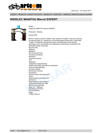 Utworzono : 04 marzec 2017 CZĘŚCI > WIDELCE I AMORTYZATORY > WIDELCE > MANITOU > WIDELEC MANITOU Marvel EXPERT WIDELEC MANITOU Marvel EXPERT Model : WIDELEC MANITOU Marvel EXPERT Producent : Manitou OPIS Mocny i sztywny bocznie widelec, który zależnie od skoku, może być używany do agresywnego XC, maratonów czy komfortowego All-Mountain. Doskonała czułość i możliwość wewnętrznej zmiany charakterystyki pracy tłumika sprawiają, że ten amortyzator jest najbardziej uniwersalnym narzędziem dla doświadczonego rowerzysty. Rozmiar koła 29" Sprężyna ISO Air (powietrzna) Tłumienie kompresji Absolute + Tłumienie powrotu TPC Regulacje naprężenie wstępne szybka kompresja (wewnętrzna regulacja) wolna kompresja tłumienie odbicia Mocowanie hamulca Post Mount Średnica goleni wewnętrznych 32mm Materiał goleni wewnetrznych aluminium Materiał goleni zewnętrznych cieniowane aluminium 7050 Średnica rury sterowej taper lub 1,1/8" Wysokość oś-korona 472mm/478mm Waga 1725g (100mm) R A K kontakt : - [email protected] S I R Strona 1/{nb} Utworzono : 04 marzec 2017 CZĘŚCI > WIDELCE I AMORTYZATORY > WIDELCE > MANITOU > WIDELEC MANITOU Marvel EXPERT WIDELEC MANITOU Marvel EXPERT 29", 100 mm, czarny, oś 9 mm 1969ZŁ 29", 100 mm, czarny, taper, oś 9 mm 5050 zł R A S I R Cena : 1.969,00 PLN Brutto ( 1.600,81 PLN Netto) K Dostępność: Produkt dostępny w naszym sklepie od 31 styczeń 2015 kontakt : - [email protected] Strona 2/{nb}