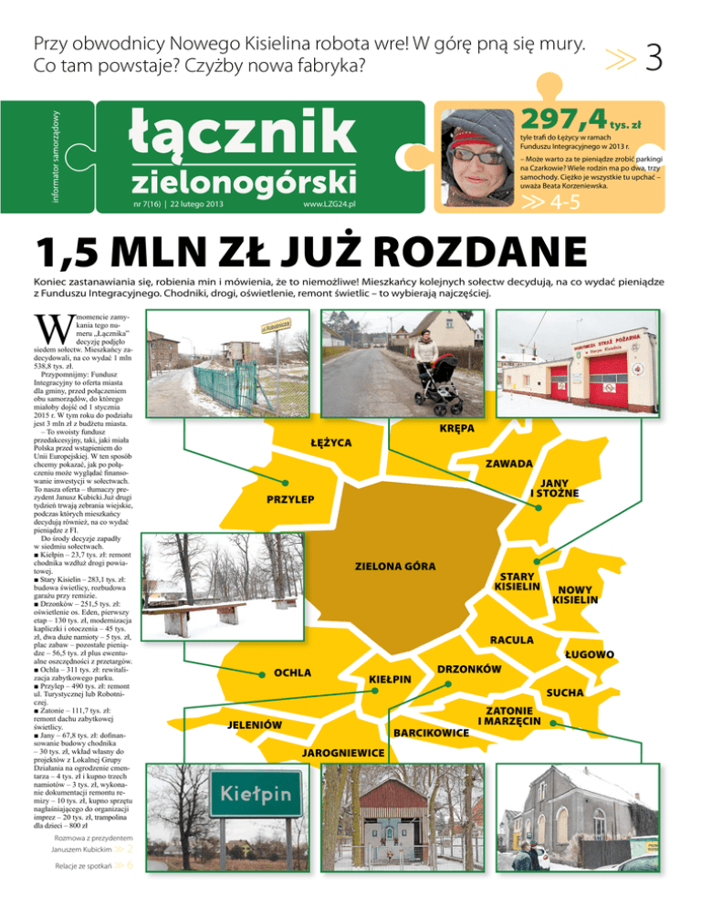 Przy obwodnicy Nowego Kisielina robota wre! W górę pną się mury. Co tam powstaje? Czyżby nowa fabryka? >> 3 297,4 tys. zł tyle trafi do Łężycy w ramach Funduszu Integracyjnego w 2013 r. – Może warto za te pieniądze zrobić parkingi na Czarkowie? Wiele rodzin ma po dwa, trzy samochody. Ciężko je wszystkie tu upchać – uważa Beata Korzeniewska. nr 7(16) | 22 lutego 2013 >> 4-5 www.LZG24.pl 1,5 mln zł już rozdane Koniec zastanawiania się, robienia min i mówienia, że to niemożliwe! Mieszkańcy kolejnych sołectw decydują, na co wydać pieniądze z Funduszu Integracyjnego. Chodniki, drogi, oświetlenie, remont świetlic – to wybierają najczęściej. W momencie zamykania tego numeru „Łącznika” decyzję podjęło siedem sołectw. Mieszkańcy zadecydowali, na co wydać 1 mln 538,8 tys. zł. Przypomnijmy: Fundusz Integracyjny to oferta miasta dla gminy, przed połączeniem obu samorządów, do którego miałoby dojść od 1 stycznia 2015 r. W tym roku do podziału jest 3 mln zł z budżetu miasta. – To swoisty fundusz przedakcesyjny, taki, jaki miała Polska przed wstąpieniem do Unii Europejskiej. W ten sposób chcemy pokazać, jak po połączeniu może wyglądać finansowanie inwestycji w sołectwach. To nasza oferta – tłumaczy prezydent Janusz Kubicki.Już drugi tydzień trwają zebrania wiejskie, podczas których mieszkańcy decydują również, na co wydać pieniądze z FI. Do środy decyzje zapadły w siedmiu sołectwach. ■ Kiełpin – 23,7 tys. zł: remont chodnika wzdłuż drogi powiatowej. ■ Stary Kisielin – 283,1 tys. zł: budowa świetlicy, rozbudowa garażu przy remizie. ■ Drzonków – 251,5 tys. zł: oświetlenie os. Eden, pierwszy etap – 130 tys. zł, modernizacja kapliczki i otoczenia – 45 tys. zł, dwa duże namioty – 5 tys. zł, plac zabaw – pozostałe pieniądze – 56,5 tys. zł plus ewentualne oszczędności z przetargów. ■ Ochla – 311 tys. zł: rewitalizacja zabytkowego parku. ■ Przylep – 490 tys. zł: remont ul. Turystycznej lub Robotniczej. ■ Zatonie – 111,7 tys. zł: remont dachu zabytkowej świetlicy. ■ Jany – 67,8 tys. zł: dofinansowanie budowy chodnika – 30 tys. zł, wkład własny do projektów z Lokalnej Grupy Działania na ogrodzenie cmentarza – 4 tys. zł i kupno trzech namiotów – 3 tys. zł, wykonanie dokumentacji remontu remizy – 10 tys. zł, kupno sprzętu nagłaśniającego do organizacji imprez – 20 tys. zł, trampolina dla dzieci – 800 zł Rozmowa z prezydentem Januszem Kubickim >> 2 Relacje ze spotkań >> 6 KRĘPA ŁĘŻYCA ZAWADA JANY I STOŻNE PRZYLEP ZIELONA GÓRA STARY KISIELIN NOWY KISIELIN RACULA ŁUGOWO OCHLA KIEŁPIN DRZONKÓW SUCHA JELENIÓW BARCIKOWICE JAROGNIEWICE ZATONIE I MARZĘCIN 2> > łącznik zielonogórski | 22 lutego 2013 Z Ż Y C I A M I A S T A I www.Lzg24.pl G M I N Y >>>>> Otwarcie nowej siedziby strażaków zbiegło się z pożegnaniem 14 zł kosztuje miniaturowa figurka Bachusika, którą można kupić Maria Lipińska, Irena Majewska i Alicja Wójcicka od dwóch lat miejskiego komendanta. – To ja? – śmiał się Waldemar Micha- w punkcie informacji turystycznej w ratuszu. – Mamy Palmiksa uprawiają wspólnie nordic walking. „Koleżanki od kijków”, jak łowski, kiedy prezydent Kubicki dał mu pamiątkową karykaturę. i Ciekawka – mówi Magdalena Żurek. o sobie mówią panie, są w wyśmienitej formie! Fot. Krzysztof Grabowski P I Ó R K I E M Fot. Krzysztof Grabowski Fot. Krzysztof Grabowski To jest pierwszy krok C E P E R A >>>>> – Cieszę się, że sołectwa decydują, na co przeznaczyć Fundusz Integracyjny. Na wtorkowej sesji, przeznaczymy na ten cel pierwsze pieniądze – zapowiada prezydent Janusz Kubicki. W ZIELONEJ GÓRZE W ZIELONEJ GÓRZE Dziś (w piątek) o 19.00 w BWA wernisaż wystawy Agnieszki Hałas i Jarka Jeschke „Patria o Muerte – Ojczyzna albo śmierć”. To swoisty zapis dwumiesięcznego pobytu artystów na Kubie. Wybrali się tam, by zobaczyć, jak funkcjonuje sztuka w systemie totalitarnym i jak wygląda życie zwykłych ludzi w komunie. Projekt zrealizowano w ramach stypendium Ministerstwa Kultury i Dziedzictwa Narodowego. (dsp) Dziś (w piątek) o 18.00 w Klubie Pro Libris w bibliotece wojewódzkiej odbędzie się promocja książki Eugeniusza Kurzawy „Andrzej K. Waśkiewicz”. W programie: dwa słowa wstępu – E. Kurzawa, film dokumentalny Justyny Dzienis o Projekcie Waśkiewicz, wiersze Andrzeja K. Waśkiewicza w interpretacji Jerzego Glapy, rozmowa o książce. Książkę będzie można też kupić. W DRZONKOWIE W DRZONKOWIE I cegły, i bramy Zobacz psie piękności Artyści na Kubie Budujesz albo remontujesz dom? Inspiracji i podpowiedzi poszukaj na Targach Budownictwa i Wyposażenia Wnętrz, które odbywają się od dziś (piątek) do niedzieli na terenie WOSiR-u w Drzonkowie. W tym roku zaprezentuje się ponad 100 wystawców z branży budowlanej. Targi, to niewątpliwie okazja, by kupić coś po atrakcyjnej cenie, skorzystać ze sporych rabatów zachęcają organizatorzy. (dsp) Poeta o poecie – W środę wieczorem mieszkańcy Kiełpina zadecydowali, że z Funduszu Integracyjnego wyremontują chodniki. To siódme sołectwo, które podjęło decyzję. Rozdysponowano już połowę z puli 3 mln zł. To sukces? Janusz Kubicki, prezydent Zielonej Góry: – Bardzo się cieszę, że mieszkańcy sołectw decydują, na co wydać pieniądze z Funduszu Integracyjnego. To pierwszy krok. Chyba najważniejszy. W pełni akceptuję ich decyzje. Bo idea funduszu polega na tym, że to mieszkańcy sami decyduj, na co wydać pieniądze. Nie prezydent, czy wójt. To nie władza ma określać, co jest najważniejsze – która ławka, lampa, chodnik czy dziurawa ulica. Nie są to łatwe decyzje. – W Starym Kisielinie mieszkańcy musieli się zbierać dwa razy. Frekwencja była tak duża, jak nigdy. Blisko 200 osób. Było kilka konkurencyjnych pomysłów. Przegłosowano – Wszyscy żyjemy z miasta. budowę św