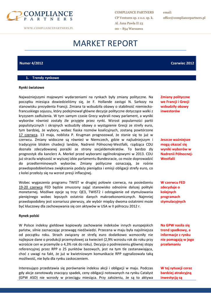 COMPLIANCE PARTNERS email: CP Ventures sp. z o.o. sp. k. [email protected] Al. Jana Pawła II 23 00 – 854 Warszawa MARKET REPORT Numer 4/2012 Czerwiec 2012 1. Trendy rynkowe Rynki światowe Najważniejszymi majowymi wydarzeniami na rynkach były zmiany polityczne. Na początku miesiąca dowiedzieliśmy się, że F. Hollande zastąpi N. Sarkozy na stanowisku prezydenta Francji. Zmiana ta wzbudziła obawy o stabilność niemieckofrancuskiego sojuszu, który podejmował główne decyzje polityczne dotyczące walki z kryzysem zadłużenia. W tym samym czasie Grecy wybrali nowy parlament, a wyniki wyborów również zostały źle przyjęte przez rynki. Wzrost popularności partii populistycznych i skrajnych wzbudziły obawy o wystąpienie Grecji ze strefy euro, tym bardziej, że wybory, wobec fiaska rozmów koalicyjnych, zostaną powtórzone 17 czerwca. 13 maja, noblista P. Krugman prognozował, że stanie się to już w czerwcu. Zmiany widoczne są również w Niemczech, gdzie w najludniejszym i tradycyjnie bliskim chadecji landzie, Nadrenii Północnej-Westfalii, rządząca CDU doznała zdecydowanej porażki ze strony socjaldemokratów. To bardzo zły prognostyk dla kanclerz A. Merkel przed wyborami ogólnokrajowymi w 2013. CDU już straciła większość w wyższej izbie parlamentu Bundesracie, co może doprowadzić do przedterminowych wyborów. Zmiany polityczne oznaczają, że rośnie prawdopodobieństwa zwiększania podaży pieniądza i emisji obligacji strefy euro, co z kolei przełoży się na wzrost presji inflacyjnej. Zmiany polityczne we Francji i Grecji wzbudziły obawy inwestorów Wobec wygaszenia programu TWIST w drugiej połowie czerwca, na posiedzeniu 19-20 czerwca FED będzie zmuszony zająć stanowisko odnośnie dalszej polityki monetarnej. Możliwe opcje są trzy: QE3, TWIST2 i odstąpienie od stymulowania pieniężnego wobec lepszych ostatnio danych makroekonomicznych. Najmniej prawdopodobny jest scenariusz pierwszy, ale wybór między dwoma ostatnimi może być kluczowy dla zachowywania się cen aktywów w USA w II półroczu 2012 r. W czerwcu FED zdecyduje o kolejnych programach stymulacyjnych Jeszcze ważniejsze mogą okazać się wyniki wyborów w Nadrenii PółnocnejWestfalii Rynek polski W Polsce indeksy giełdowe kopiowały zachowanie indeksów innych europejskich państw, silnie zaznaczając przewagę niedźwiedzi. Przecena w maju była najsilniejsza od początku roku. Strach związany ze strefą euro dodatkowo wzmocniły nie najlepsze dane o produkcji przemysłowej za kwiecień (2,9% wzrostu rok do roku przy wzroście cen w przemyśle o 4,3% rok do roku). Decyzja o podniesieniu głównej stopy referencyjnej przez RPP o 25 punktów bazowych, jest na tym tle zastanawiająca, choć z uwagi na fakt, że już w kwietniowym komunikacie RPP sygnalizowała taką możliwość, nie była dla rynku zaskoczeniem. Na GPW nasila się trend spadkowy, a informacje z rynku nie pomagają w jego przełamaniu Interesująco przedstawia się porównanie indeksu akcji i obligacji w maju. Podczas gdy akcje zanotowały znaczący spadek, ceny obligacji notowanych na rynku Catalyst (GPW ASO) nie wzrosły w przeciągu miesiąca. Przy założeniu, że są to aktywa W tej sytuacji coraz bardziej atrakcyjną inwestycją są COMPLIANCE PARTNERS email: CP Ventures sp. z o.o. sp. k. [email protected] Al. Jana Pawła II 23 00 – 854 Warszawa bezpieczniejsze niż akcje, może to oznaczać pewną nieefektywność na rynku, spowodowaną przede wszystkim niską płynnością na rynku Catalyst. Powoduje to możliwość poprawy stopy zwrotu z tytułu alokacji przez inwestorów o niedużych, elastycznych portfelach. 1020 1000 980 960 940 920 900 880 860 obligacje korporacyjne… … które posiadają potencjał do wzrostów Indeks obligacji Subindeks obligacji (tylko ceny netto obligacji) WIG Porównanie zmiany cen obligacji notowanych na GPW ASO oraz wartości indeksu WIG (metodologia obliczania indeksu obligacji znajduje się w załączniku). 2. ..Informacje branżowe Stopy procentowe Jak wspomniano powyżej, w maju RPP zdecydowała się na podniesienie poziomu stóp procentowych o 25 p.b. Miało to zróżnicowany wpływ na kształtowanie się rynkowych stóp procentowych. Przykładowo, wzrost oprocentowania WIBOR 1M wyniósł 18 p.b., natomiast WIBOR 1Y 12 p.b. Decyzja Rady miała więc znikomy wpływ w szczególności na wzrost długoterminowych stóp, najistotniejszych dla realnej gospodarki. Na rynek stopy procentowej decydujący wpływ miała podwyżka stóp o 25 p.b. przez RPP… Oprocentowanie WIBOR 5,4 5,2 5 4,8 4,6 4,4 4,2 4 ON TN 1W 2W 1M 3M 6M 9M 1Y Tenor 9 maja 9 maja + 25 p.b. 10 maja Porównanie krzywej rentowności WIBOR z 9 i 10 maja. Linia przerywana obrazuje teoretyczny przebieg krzywej rentowności z 9 maja powiększony o 25 punktów bazowych, co odpowiada podwyżce stopy referencyjnej przez RPP. … która jednak nie przełożyła się na znaczący wzrost stóp rynkowych COMPLIANCE PARTNERS email: CP Ventures sp. z o.o. sp. k. [email protected] Al. Jana Pawła II 23 00 – 854 Warszawa Spółki zagraniczne na GPW 4 maja pierwsze urodziny obchodził drugi (obok WIG-Poland) narodowy indeks warszawskiej giełdy – WIG-Ukraine. Od tego dnia stracił on na wartości aż 22,5% i zanotował historyczne minimum poniżej 600 punktów (1/3 wartości z pierwszego dnia notowania). W maju bardzo słabo zachowywał się subindeks WIG-Ukraine… … który zanotował historyczne minimum Indeks skupia 10 ukraińskich spółek notowanych na GPW, spośród których dominują spółki w sektora produkcji rolnej i górnictwa. Ostatnie spadki to efekt słabszych od oczekiwanych (i prognozowanych przez zarządy) wyników, pogarszającej się komunikacji spółek z inwestorami oraz wzrost ryzyka politycznego na Ukrainie. Wszystko to może negatywnie wpływać na możliwość kolejnych udanych emisji papierów, nie tylko ukraińskich, ale również innych zagranicznych spółek. W konsekwencji zagranicz