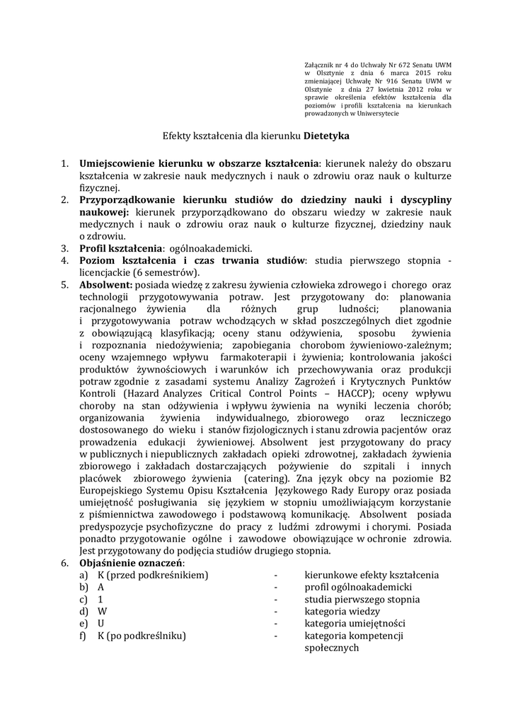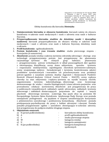 Załącznik nr 4 do Uchwały Nr 672 Senatu UWM w Olsztynie z dnia 6 marca 2015 roku zmieniającej Uchwałę Nr 916 Senatu UWM w Olsztynie z dnia 27 kwietnia 2012 roku w sprawie określenia efektów kształcenia dla poziomów i profili kształcenia na kierunkach prowadzonych w Uniwersytecie Efekty kształcenia dla kierunku Dietetyka 1. 2. 3. 4. 5. 6. Umiejscowienie kierunku w obszarze kształcenia: kierunek należy do obszaru kształcenia w zakresie nauk medycznych i nauk o zdrowiu oraz nauk o kulturze fizycznej. Przyporządkowanie kierunku studiów do dziedziny nauki i dyscypliny naukowej: kierunek przyporządkowano do obszaru wiedzy w zakresie nauk medycznych i nauk o zdrowiu oraz nauk o kulturze fizycznej, dziedziny nauk o zdrowiu. Profil kształcenia: ogólnoakademicki. Poziom kształcenia i czas trwania studiów: studia pierwszego stopnia licencjackie (6 semestrów). Absolwent: posiada wiedzę z zakresu żywienia człowieka zdrowego i chorego oraz technologii przygotowywania potraw. Jest przygotowany do: planowania racjonalnego żywienia dla różnych grup ludności; planowania i przygotowywania potraw wchodzących w skład poszczególnych diet zgodnie z obowiązującą klasyfikacją; oceny stanu odżywienia, sposobu żywienia i rozpoznania niedożywienia; zapobiegania chorobom żywieniowo-zależnym; oceny wzajemnego wpływu farmakoterapii i żywienia; kontrolowania jakości produktów żywnościowych i warunków ich przechowywania oraz produkcji potraw zgodnie z zasadami systemu Analizy Zagrożeń i Krytycznych Punktów Kontroli (Hazard Analyzes Critical Control Points – HACCP); oceny wpływu choroby na stan odżywienia i wpływu żywienia na wyniki leczenia chorób; organizowania żywienia indywidualnego, zbiorowego oraz leczniczego dostosowanego do wieku i stanów fizjologicznych i stanu zdrowia pacjentów oraz prowadzenia edukacji żywieniowej. Absolwent jest przygotowany do pracy w publicznych i niepublicznych zakładach opieki zdrowotnej, zakładach żywienia zbiorowego i zakładach dostarczających pożywienie do szpitali i innych placówek zbiorowego żywienia (catering). Zna język obcy na poziomie B2 Europejskiego Systemu Opisu Kształcenia Językowego Rady Europy oraz posiada umiejętność posługiwania się językiem w stopniu umożliwiającym korzystanie z piśmiennictwa zawodowego i podstawową komunikację. Absolwent posiada predyspozycje psychofizyczne do pracy z ludźmi zdrowymi i chorymi. Posiada ponadto przygotowanie ogólne i zawodowe obowiązujące w ochronie zdrowia. Jest przygotowany do podjęcia studiów drugiego stopnia. Objaśnienie oznaczeń: a) K (przed podkreśnikiem) kierunkowe efekty kształcenia b) A profil ogólnoakademicki c) 1 studia pierwszego stopnia d) W kategoria wiedzy e) U kategoria umiejętności f) K (po podkreślniku) kategoria kompetencji społecznych g) M1A - efekty kształcenia w obszarze kształcenia w zakresie nauk medycznych, nauk o zdrowiu oraz nauk o kulturze fizycznej dla studiów pierwszego stopnia h) 01, 02, 03 i kolejne numer efektu kształcenia Symbol efektu kształcenia w obszarze Kierunkowe efekty kształcenia dla kierunku Symbol kształcenia studiów dietetyka – efektu w zakresie nauk po ukończeniu studiów pierwszego stopnia kierunkowego medycznych i nauk absolwent: o zdrowiu oraz nauk o kulturze fizycznej WIEDZA Opisuje biochemiczne i fizjologiczne mechanizmy M1A_W01 K1A_W01 funkcjonowania zdrowego i chorego organizmu M1A_W02 człowieka Zna podstawowe procesy metaboliczne na poziomie komórkowym, narządowym, układowym, M1A_W01 K1A_W02 w tym mechanizmy i efekty regulacji M1A_W02 hormonalnych, rozrodczych i procesów starzenia się organizmu oraz ich związek z chorobami Zna podstawy fizjologii przewodu pokarmowego i trawienia, w szczególności enzymy biorące udział M1A_W01 w trawieniu, rolę żółci, przebieg wchłaniania K1A_W03 M1A_W02 produktów trawienia oraz zaburzenia z nimi M1A_W03 związane a także wybrane profile metaboliczne podstawowych narządów i układów Zna mianownictwo anatomiczne oraz budowę ciała człowieka w ujęciu opisowym, w szczególności w zakresie budowy układu pokarmowego, K1A_W04 M1A_W02 wydzielniczego, moczowo-płciowego, krwionośnego i nerwowego oraz w układzie topograficznym Opisuje budowę mikroskopową oraz właściwości M1A_W01 K1A_W05 i funkcje komórek, tkanek i narządów człowieka M1A_W02 Zna ogólne zasady tworzenia i rozwoju form M1A_W12 K1A_W06 indywidualnej przedsiębiorczości M1A_W02 Wskazuje metody oceny zaburzeń strukturalnych M1A_W03 K1A_W07 i funkcjonalnych wywołanych chorobą oraz M1A_W04 podstawowe reakcje człowieka na chorobę M1A_W05 Zna wybrane testy i metody oceny stanu M1A_W03 K1A_W08 odżywienia organizmu człowieka M1A_W05 K1A_W09 Charakteryzuje zmiany patologiczne w różnych schorzeniach oraz zaburzeniach strukturalnych wywołanych chorobą, urazem lub inną formą K1A_W10 Definiuje podstawowe pojęcia z zakresu zdrowia w wymiarze społecznym K1A_W11 K1A_W12 K1A_W13 K1A_W14 K1A_W15 K1A_W16 K1A_W17 K1A_W18 K1A_W19 K1A_W20 K1A_W21 K1A_W22 Zna główne problemy zdrowotne w zakresie chorób zakaźnych i nie zakaźnych o znaczeniu społecznym Zna i rozumie rolę psychologii w sytuacji choroby, kalectwa oraz problemach ze zdrowiem psychicznym Zna zasady przedlekarskiej udzielania medycznej pomocy Wskazuje i objaśnia podstawy edukacji zdrowotnej, promocji zdrowia, profilaktyki i edukacji żywieniowej Zna zasady racjonalnego żywienia oraz konsekwencje zdrowotne nieprawidłowego odżywiania, w szczególności stosowania niezbilansowanej diety, długotrwałego głodowania czy objadania się Zna choroby związane z nieprawidłową dietą w tym związane z zaburzeniami gospodarki wodnoelektrolitowej, kwasowo-zasadowej, lipidowej, węglowodanowej i białkowej oraz będące skutkami ubocznymi działań i zabiegów medycznych i niemedycznych Zna zasady żywienia dzieci zdrowych i chorych w różnym wieku, w szczególności dzieci z alergiami pokarmowymi 