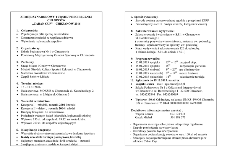 1. XI MIĘDZYNARODOWY TURNIEJ PIŁKI RĘCZNEJ CHŁOPCÓW „CABAN CUP” CHRZANÓW 2016 7. Sposób rywalizacji Zawody zostaną przeprowadzone zgodnie z przepisami ZPRP Przewidujemy start 12 drużyn w każdej kategorii wiekowej Cel zawodów Popularyzacja piłki ręcznej wśród dzieci Dostarczenie radości ze współzawodnictwa Wyłonienie najlepszych zespołów 8. Zakwaterowanie i wyżywienie: Zakwaterowanie i wyżywienie w S.P.1 w Chrzanowie ul. Borelowskiego 1 ( uczestnicy przywożą własne śpiwory, materace ew. poduszkę; trenerzy i opiekunowie tylko śpiwory, ew. poduszkę) Koszt wyżywienia i zakwaterowania 120 zł. od osoby. ( obiado-kolacja 15.01. do obiadu 17.01.) 2. Organizatorzy: ● Szkoła Podstawowa Nr 1 w Chrzanowie Powiatowy Międzyszkolny Ośrodek Sportowy w Chrzanowie 3. Partnerzy Urząd Miasta i Gminy w Chrzanowie Miejski Ośrodek Kultury Sportu i Rekreacji w Chrzanowie Starostwo Powiatowe w Chrzanowie Zespół Szkół w Libiążu 4. Termin i miejsce: 15 – 17.01.2016. Hala sportowa MOKSiR w Chrzanowie ul. Kusocińskiego 2 Hala sportowa w Libiążu ul. Górnicza 3 5. Warunki uczestnictwa: Kategoria I - młodzik, rocznik 2001 i młodsi Kategoria II – dzieci , rocznik 2004 i młodsi Drużyny liczą max. 16 zawodników. Posiadanie ważnych badań lekarskich, legitymacji szkolnej Wpisowe 150 zł. od zespołu do 19.12. na konto klubu. Wpisowe 250 zł. Od zespołów dojeżdżających 6. Klasyfikacja i nagrody: Wszystkie drużyny otrzymują pamiątkowe dyplomy i puchary Każdy uczestnik turnieju pamiątkową koszulkę Najlepszy bramkarz, zawodnik i król strzelców – statuetki 3 najlepsze drużyny – medale w kategorii dzieci Najlepsi zawodnicy poszczególnych drużyn – statuetki 9. 10. Program zawodów: 15.01.2015 (piątek) 1300 – 1500 przyjazd ekip, 15.01.2015 (piątek) 1500 rozpoczęcie gier elim. 00 00 16.01.2015 (sobota) 9 – 20 gry eliminacyjne 17.01.2015 (niedziela) 900 – 1400 mecze finałowe 17.01.2015 (niedziela) 1430 zakończenie turnieju Zgłoszenia do 19.12.2015. na adres: Wójcik Leszek mail: [email protected] Szkoła Podstawowa Nr 1 z Oddziałami Integracyjnymi w Chrzanowie ul. Borelowskiego 1 32-500 Chrzanów, tel. 0326232844 Fax: 0326240069 Wpisowe 150 zł. Od drużyny na konto: UMKS -PMOS Chrzanów B S w Chrzanowie: 75 8444 0008 0000 0080 4679 0001 Dodatkowe informacje można uzyskać : Wójcik Leszek Gacek Michał - 503 194 972 501 188 573 Organizator zastrzega sobie prawo interpretacji regulaminu Zespoły przyjeżdżają na własny koszt Uczestnicy powinni być ubezpieczeni Organizator pobiera kaucję zwrotną w wys. 100 zł. od zespołu Szczegóły dotyczące turnieju na stronie: pmos-chrzanow.pl w zakładce Caban Cup XI MIĘDZYNARODOWY TURNIEJ PIŁKI RĘCZNEJ CHŁOPCÓW Chrzanowski Rynek Plac Tysiąclecia w Chrzanowie „CABAN CUP - 2016” Plac Tysiąclecia Zalew „Chechło” CHRZANÓW – Libiąż 15–17 Styczeń 2016 Zamek Lipowiec Gmach Biblioteki w Chrzanowie Powiat Chrzanowski Obiekty Sportowe Turnieju Caban – Cup 2016 hala w Chrzanowie hala w Libiążu Gmina Chrzanów
