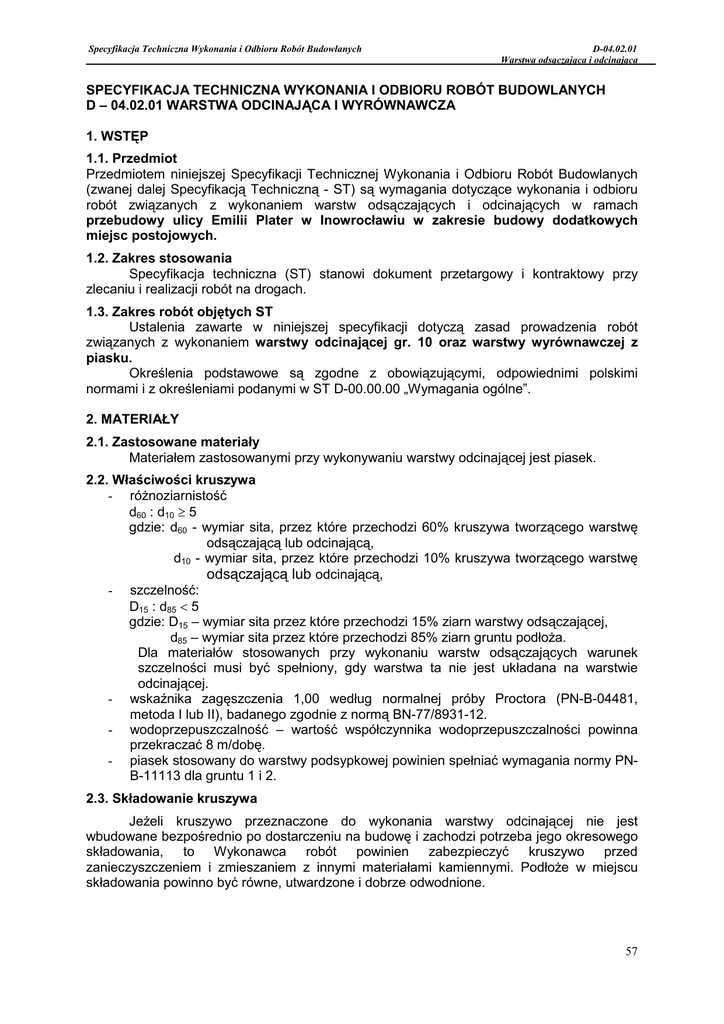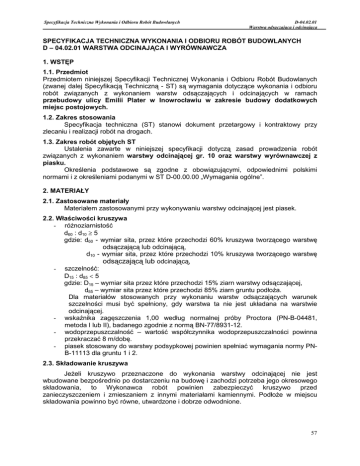Specyfikacja Techniczna Wykonania i Odbioru Robót Budowlanych D-04.02.01 Warstwa odsączająca i odcinająca SPECYFIKACJA TECHNICZNA WYKONANIA I ODBIORU ROBÓT BUDOWLANYCH D – 04.02.01 WARSTWA ODCINAJĄCA I WYRÓWNAWCZA 1. WSTĘP 1.1. Przedmiot Przedmiotem niniejszej Specyfikacji Technicznej Wykonania i Odbioru Robót Budowlanych (zwanej dalej Specyfikacją Techniczną - ST) są wymagania dotyczące wykonania i odbioru robót związanych z wykonaniem warstw odsączających i odcinających w ramach przebudowy ulicy Emilii Plater w Inowrocławiu w zakresie budowy dodatkowych miejsc postojowych. 1.2. Zakres stosowania Specyfikacja techniczna (ST) stanowi dokument przetargowy i kontraktowy przy zlecaniu i realizacji robót na drogach. 1.3. Zakres robót objętych ST Ustalenia zawarte w niniejszej specyfikacji dotyczą zasad prowadzenia robót związanych z wykonaniem warstwy odcinającej gr. 10 oraz warstwy wyrównawczej z piasku. Określenia podstawowe są zgodne z obowiązującymi, odpowiednimi polskimi normami i z określeniami podanymi w ST D-00.00.00 „Wymagania ogólne”. 2. MATERIAŁY 2.1. Zastosowane materiały Materiałem zastosowanymi przy wykonywaniu warstwy odcinającej jest piasek. 2.2. Właściwości kruszywa - róŜnoziarnistość d60 : d10 ≥ 5 gdzie: d60 - wymiar sita, przez które przechodzi 60% kruszywa tworzącego warstwę odsączającą lub odcinającą, d10 - wymiar sita, przez które przechodzi 10% kruszywa tworzącego warstwę odsączającą lub odcinającą, - szczelność: D15 : d85 < 5 gdzie: D15 – wymiar sita przez które przechodzi 15% ziarn warstwy odsączającej, d85 – wymiar sita przez które przechodzi 85% ziarn gruntu podłoŜa. Dla materiałów stosowanych przy wykonaniu warstw odsączających warunek szczelności musi być spełniony, gdy warstwa ta nie jest układana na warstwie odcinającej. - wskaźnika zagęszczenia 1,00 według normalnej próby Proctora (PN-B-04481, metoda I lub II), badanego zgodnie z normą BN-77/8931-12. - wodoprzepuszczalność – wartość współczynnika wodoprzepuszczalności powinna przekraczać 8 m/dobę. - piasek stosowany do warstwy podsypkowej powinien spełniać wymagania normy PNB-11113 dla gruntu 1 i 2. 2.3. Składowanie kruszywa JeŜeli kruszywo przeznaczone do wykonania warstwy odcinającej nie jest wbudowane bezpośrednio po dostarczeniu na budowę i zachodzi potrzeba jego okresowego składowania, to Wykonawca robót powinien zabezpieczyć kruszywo przed zanieczyszczeniem i zmieszaniem z innymi materiałami kamiennymi. PodłoŜe w miejscu składowania powinno być równe, utwardzone i dobrze odwodnione. 57 Specyfikacja Techniczna Wykonania i Odbioru Robót Budowlanych D-04.02.01 Warstwa odsączająca i odcinająca 3. SPRZĘT Wykonawca przystępujący do wykonania warstwy odcinającej powinien wykazać się moŜliwością korzystania z następującego sprzętu: - równiarek, - walców, - płyt wibracyjnych lub ubijaków mechanicznych. 4. TRANSPORT Kruszywa moŜna przewozić dowolnymi środkami transportu w warunkach zabezpieczających je przed zanieczyszczeniem, zmieszaniem z innymi materiałami, nadmiernym wysuszeniem i zawilgoceniem. 5. WYKONANIE ROBÓT 5.1. Zasady ogólne Wykonanie warstwy odcinającej i wyrównawczej naleŜy poprzedzić wykonaniem profilowania dna koryta oraz badaniem jego zagęszczenia. Profilowanie podłoŜa powinno być wykonane w korzystnych warunkach atmosferycznych i skoordynowane z kompleksowym wykonaniem wszystkich elementów nawierzchni. 5.2. Rozkładanie kruszywa Kruszywo powinno być rozkładane w warstwie o grubości wynikającej z konieczności lokalnego wyrównania z zachowaniem wymaganych spadków i rzędnych wysokościowych. Grubość rozłoŜonej warstwy luźnego kruszywa powinna być taka, aby po jej zagęszczeniu osiągnięto grubość projektowaną. W miejscach, w których widoczna jest segregacja kruszywa naleŜy przed zagęszczeniem wymienić kruszywo na materiał o odpowiednich właściwościach. 5.3. Zagęszczenie kruszywa Natychmiast po końcowym wyprofilowaniu warstwy naleŜy przystąpić do jej zagęszczania. Zagęszczanie nawierzchni o jednostronnym spadku naleŜy rozpoczynać od dolnej krawędzi i przesuwać pasami podłuŜnymi częściowo nakładającymi się, w kierunku jej górnej krawędzi. Nierówności lub zagłębienia powstałe w czasie zagęszczania powinny być wyrównywane na bieŜąco przez spulchnienie warstwy kruszywa i dodanie lub usunięcie materiału, aŜ do otrzymania równej powierzchni. Zagęszczanie naleŜy kontynuować do osiągnięcia wskaźnika zagęszczenia nie mniejszego od 1,0 według normalnej próby Proctora, przeprowadzonej według PN-B-04481. Wilgotność kruszywa podczas zagęszczania powinna być równa wilgotności optymalnej z tolerancją od -20% do +10% jej wartości. W przypadku, gdy wilgotność kruszywa jest wyŜsza od wilgotności optymalnej, kruszywo naleŜy osuszyć przez mieszanie i napowietrzanie. W przypadku, gdy wilgotność kruszywa jest niŜsza od wilgotności optymalnej, kruszywo naleŜy zwilŜyć określoną ilością wody i równomiernie wymieszać. 5.4. Utrzymanie warstwy odcinającej i wyrównawczej Warstwa odsączająca i odcinająca po wykonaniu, a przed ułoŜeniem następnej warstwy powinny być utrzymywane w dobrym stanie. Nie dopuszcza się ruchu budowlanego po wykonanej warstwie. W przypadku warstwy z kruszywa dopuszcza się ruch pojazdów koniecznych dla wykonania wyŜej leŜącej warstwy nawierzchni. Koszt napraw wynikłych z niewłaściwego utrzymania warstwy obciąŜa Wykonawcę robót. 58 Specyfikacja Techniczna Wykonania i Odbioru Robót Budowlanych D-04.02.01 Warstwa odsączająca i odcinająca 6. KONTROLA JAKOŚCI ROBÓT 6.1. Ogólne zasady kontroli W czasie wykonywania robót Wykonawca powinien prowadzić systematycznie badania kontrolne i dostarczać kopie ich wyników InŜynierowi. 6.2. Badania przed przystąpieniem do robót Przed przystąpieniem do robót Wykonawca powinien wykonać bad