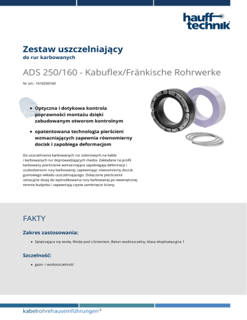 Zestaw uszczelniający do rur karbowanych ADS 250/160 - Kabuflex/Fränkische Rohrwerke Nr art.: 1610250160 Optyczna i dotykowa kontrola poprawności montażu dzięki zabudowanym otworom kontrolnym opatentowana technologia pierścieni wzmacniających zapewnia równomierny docisk i zapobiega deformacjom Do uszczelniania karbowanych rur osłonowych na kable i karbowanych rur doprowadzających media. Zakładane na profil karbowany pierścienie wzmacniające zapobiegają deformacji i uszkodzeniom rury karbowanej, zapewniając równomierny docisk gumowego wkładu uszczelniającego. Dołączone pierścienie izolacyjne służą do wyśrodkowania rury karbowanej po wewnętrznej stronie budynku i zapewniają czyste zamknięcie ściany. FAKTY Zakres zastosowania: Spiętrzająca się woda, Woda pod ciśnieniem, Beton wodoszczelny, klasa eksploatacyjna 1 Szczelność: gazo- i wodoszczelność Tworzywo: wszystkie części metalowe: stal nierdzewna V2A (AISI 304L) Uszczelka gumowa: EPDM Pierścień izolacyjny: styrodur (EPS) Właściwości: Pierścienie wzmacniające są produkowane w wersjach dostosowanych do profili rur karbowanych poszczególnych producentów Wymiary: szerokość uszczelnienia: 40, 60 lub 80 mm (w zależności od rury karbowanej) Zakres dostawy: Standardowy gumowy wkład uszczelniający HSD Pierścienie wzmacniające ze stali nierdzewnej Pierścień izolacyjny dzielony DANE TECHNICZNE Rura przepustowa/przewiert ∅wew. (mm): 250 Średnica zewnętrzna: ZDJĘCIA APLIKACJI 160