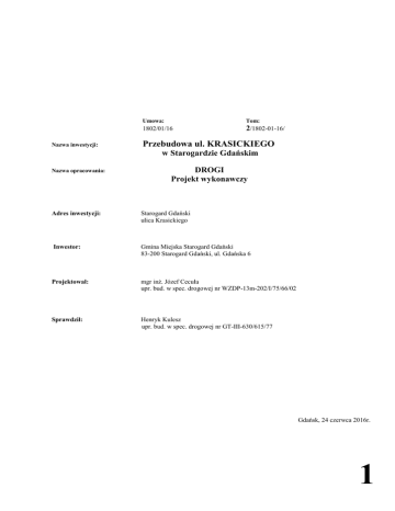 Nazwa inwestycji: Umowa: Tom: 1802/01/16 2/1802-01-16/ Przebudowa ul. KRASICKIEGO w Starogardzie Gdańskim Nazwa opracowania: DROGI Projekt wykonawczy Adres inwestycji: Starogard Gdański ulica Krasickiego Inwestor: Gmina Miejska Starogard Gdański 83-200 Starogard Gdański, ul. Gdańska 6 Projektował: mgr inż. Józef Cecuła upr. bud. w spec. drogowej nr WZDP-13m-202/I/75/66/02 Sprawdził: Henryk Kulesz upr. bud. w spec. drogowej nr GT-III-630/615/77 Gdańsk, 24 czerwca 2016r. 1 „Przebudowa ul. KRASICKIEGO w Starogardzie Gdańskim” 1802/01/16 ZAWARTOŚĆ OPRACOWANIA do projektu wykonawczego drogowego przebudowy ul. Krasickiego w Starogardzie Gdańskim I. OŚWIADCZENIA PROJEKTANTÓW II. UZGODNIENIA MIĘDZYBRANŻOWE III. WYKAZ UZGODNIEŃ, OPINII I MATERIAŁÓW WYJŚCIOWYCH DO PROJEKTOWANIA IV. CZEŚĆ OPISOWA 1.0. Dane ogólne 1.1. Podstawa opracowania 1.2. Przedmiot i zakres opracowania 3.0. Dokumentacja badań podłoża 2.0. Inwentaryzacja istniejących obiektów drogowych 3.0. Infrastruktura komunalna pobocza 4.0. Warunki geotechniczne 4.1. Opis warunków gruntowych 4.2. Wnioski geotechniczne 5.0. Projektowane rozwiązania techniczne 5.1. Charakterystyczne parametry 5.2. Konstrukcja 5.2.1. Bilans terenu 5.3. Sposób układania geotkaniny 5.4. Odwodnienie 5.5. Oświetlenie 5.6. Oznakowanie 5.7. Wytyczenie 5.8. Roboty ziemne 6.0. Inne roboty 7.0. Uwagi końcowe 8.0. Informacje dotyczące bezpieczeństwa i ochrony zdrowia – drogi V. KOPIE UPRAWNIEŃ PROJEKTANTÓW I PRZYNALEŻNOŚĆ DO IZB ZAWODOWYCH VI. KOPIE UZGODNIEŃ, OPINII, MATERIAŁÓW WYJŚCIOWYCH DO PROJEKTOWANIA VII. CZĘŚĆ GRAFICZNA 1. Plan sytuacyjny drogowy 2. Profil podłużny ul.Borowieckiej 3. Przekroje konstrukcyjne 4. Przekrój normalny skala 1:500 skala 1: 500/1:100 skala 1:10 skala 1:50 DIOGENES STUDIO sp. z o.o. 80-430 Gdańsk, ul. Mierosławskiego 27/1 tel.fax. (0-58) 341-95-31 tel. (0-58) 344-16-00 email: [email protected] http://www.diogenesstudio.pl rys. D-1 rys. D-2 rys. D-3 rys. D-4 str. 2 „Przebudowa ul. KRASICKIEGO w Starogardzie Gdańskim” 1802/01/16 Gdańsk, 24 czerwca 2016r. I. OŚWIADCZENIA PROJEKTANTÓW dot. projektu wykonawczego drogowego dla przebudowy ul. Krasickiego w Starogardzie Gdańskim Ja niżej podpisany oświadczam, że wykonałem niniejszy projekt zgodnie z obowiązującymi przepisami oraz zasadami wiedzy technicznej. Projektant: mgr inż. Józef Cecuła upr. bud. w spec. drogowej nr WZDP-13m-202/I/75/66/02 Sprawdzający: Henryk Kulesz upr. bud. w spec. drogowej nr GT-III-630/615/77 DIOGENES STUDIO sp. z o.o. 80-430 Gdańsk, ul. Mierosławskiego 27/1 tel.fax. (0-58) 341-95-31 tel. (0-58) 344-16-00 email: [email protected] http://www.diogenesstudio.pl str. 3 „Przebudowa ul. KRASICKIEGO w Starogardzie Gdańskim” 1802/01/16 Gdańsk, 24 czerwca 2016r. II. UZGODNIENIA MIĘDZYBRANŻOWE dot. przebudowy ul. Krasickiego w Starogardzie Gdańskim Branża Imię i nazwisko Podpis Zespół projektowy: zagospodarowanie terenu: mgr inż. arch. Maria Krystyna Sikorska upr. bud. w spec. arch. nr 1397/Gd/84 drogi: mgr inż. Józef Cecuła upr. bud. nr WZDP-13m-202/I/75/66 sieci sanitarne: inż. Sławomir Szurman upr. bud. w spec. sanit. nr 287/Gd/02 sieci elektryczne: inż. Jerzy Kulawiak upr. bud. w spec. elektr. nr 215/Gd/2002 Zespół sprawdzający: architektura: mgr inż. arch. Hanna Kleszczewska upr. bud. w spec. arch. nr 377/68 drogi: Henryk Kulesz upr. bud. w spec. drogowej nr GT-III-630/615/77 sieci sanitarne: mgr inż. Janusz Wróblewski upr. bud. w spec. sanit. nr 3937/Gd/89 sieci elektryczne: inż. Henryk Pszczołowski upr. bud w spec. elektr. nr 790/66 DIOGENES STUDIO sp. z o.o. 80-430 Gdańsk, ul. Mierosławskiego 27/1 tel.fax. (0-58) 341-95-31 tel. (0-58) 344-16-00 email: [email protected] http://www.diogenesstudio.pl str. 4 „Przebudowa ul. KRASICKIEGO w Starogardzie Gdańskim” 1802/01/16 III. WYKAZ UZGODNIEŃ, OPINII I MATERIAŁÓW WYJŚCIOWYCH DO PROJEKTOWANIA 1/3 Opinia Prezydenta Miasta Starogard Gdański dot. zamierzenia inwestycyjnego Nr WTI.7230.UDP-O.60.2016 ID 681453 z dn. 29.03.2016r. 2/4 Opinia dot. zamierzenia inwestycyjnego Zarządu Powiatu Starogardzkiego Nr GG.V.680.18.2016 z dn. 29.03.2016r. 3/10 Uzgodnienie projektu drogowego z Urzędu Miasta Starogard Gdański Nr WTI.7230.UDP-O.139.2016 z dn. 30.06.2016r. 4/15 Uzgodnienie projektu zagospodarowania terenu z Orange Polska SA Nr 42019/TODDROU/P/2016 z dn. 23.06.2016r. 5/16 Uzgodnienie projektu zagospodarowania terenu z UPC Polska sp. z o.o. Nr UPC/TECH/80/2016/TT z dn. 09.07.2016r. 6/17 Uzgodnienie projektu zagospodarowania terenu z NETIA SA Nr DUU-U-145/16/OT z dn. 05.07.2016r. DIOGENES STUDIO sp. z o.o. 80-430 Gdańsk, ul. Mierosławskiego 27/1 tel.fax. (0-58) 341-95-31 tel. (0-58) 344-16-00 email: [email protected] http://www.diogenesstudio.pl str. 5 „Przebudowa ul. KRASICKIEGO w Starogardzie Gdańskim” 1802/01/16 IV. CZĘŚĆ OPISOWA 1.0.Dane ogólne 1.1. Dane formalne Nazwa inwestycji: „Przebudowa ul. Krasickiego w Starogardzie Gdańskim” Inwestor: Urząd Miasta Starogard Gdański, 83-200 Starogard Gdański, ul. Gdańska 6 Jednostka Projektowa: Diogenes Studio Sp. z o.o., 80-351 Gdańsk, ul.Tysiąclecia 4 Biuro: 80-430 Gdańsk, ul. Mierosławskiego 27/1 1.2. Podstawa opracowania - umowa z inwestorem wytyczne inwestora badania geologiczne wizja w terenie mapa do celów projektowych dokumentacja formalno-prawna patrz pkt. III 1.3. Przedmiot i zakres opracowania Przedmiotem przedsięwzięcia inwestycyjnego jest przebudowa ul. Krasickiego. Zakres opracowania obejmuje przebudowę i budowę n/w elementów drogowych: jezdni, chodnika, ścieżki rowerowej, zatok i przystanków autobusowych oraz oświetlenia, kanalizacji deszczowej i kolizji z uzbrojeniem. 2.0.Inwentaryzacja istniejących obiektów drogowych Odcinek ulicy Krasickiego jest jezdnią o nawierzchni asfaltowej szerokości jezdni ok. 7,0 m i szerokości pasa drogowego od 17m do 21m z jednostronnym chodnikiem oraz zjazdami na posesje. Od strony zach