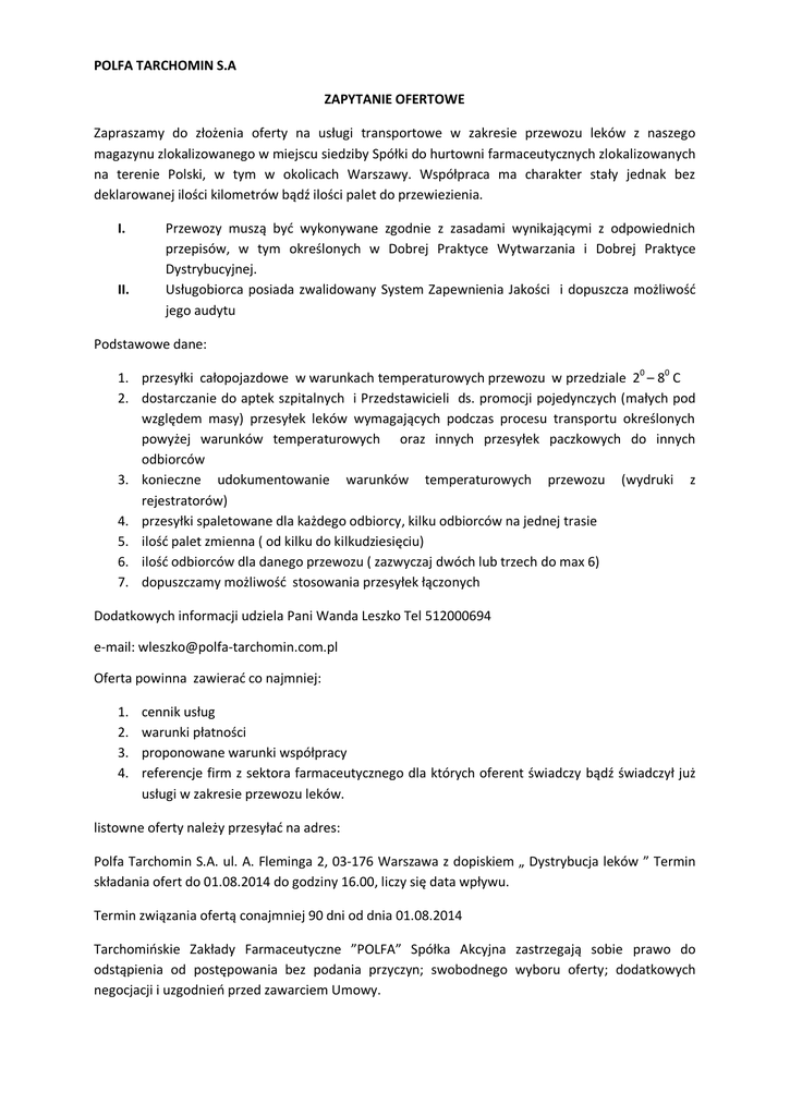 POLFA TARCHOMIN S.A ZAPYTANIE OFERTOWE Zapraszamy do złożenia oferty na usługi transportowe w zakresie przewozu leków z naszego magazynu zlokalizowanego w miejscu siedziby Spółki do hurtowni farmaceutycznych zlokalizowanych na terenie Polski, w tym w okolicach Warszawy. Współpraca ma charakter stały jednak bez deklarowanej ilości kilometrów bądź ilości palet do przewiezienia. I. II. Przewozy muszą być wykonywane zgodnie z zasadami wynikającymi z odpowiednich przepisów, w tym określonych w Dobrej Praktyce Wytwarzania i Dobrej Praktyce Dystrybucyjnej. Usługobiorca posiada zwalidowany System Zapewnienia Jakości i dopuszcza możliwość jego audytu Podstawowe dane: 1. przesyłki całopojazdowe w warunkach temperaturowych przewozu w przedziale 20 – 80 C 2. dostarczanie do aptek szpitalnych i Przedstawicieli ds. promocji pojedynczych (małych pod względem masy) przesyłek leków wymagających podczas procesu transportu określonych powyżej warunków temperaturowych oraz innych przesyłek paczkowych do innych odbiorców 3. konieczne udokumentowanie warunków temperaturowych przewozu (wydruki z rejestratorów) 4. przesyłki spaletowane dla każdego odbiorcy, kilku odbiorców na jednej trasie 5. ilość palet zmienna ( od kilku do kilkudziesięciu) 6. ilość odbiorców dla danego przewozu ( zazwyczaj dwóch lub trzech do max 6) 7. dopuszczamy możliwość stosowania przesyłek łączonych Dodatkowych informacji udziela Pani Wanda Leszko Tel 512000694 e-mail: [email protected] Oferta powinna zawierać co najmniej: 1. 2. 3. 4. cennik usług warunki płatności proponowane warunki współpracy referencje firm z sektora farmaceutycznego dla których oferent świadczy bądź świadczył już usługi w zakresie przewozu leków. listowne oferty należy przesyłać na adres: Polfa Tarchomin S.A. ul. A. Fleminga 2, 03-176 Warszawa z dopiskiem „ Dystrybucja leków ” Termin składania ofert do 01.08.2014 do godziny 16.00, liczy się data wpływu. Termin związania ofertą conajmniej 90 dni od dnia 01.08.2014 Tarchomińskie Zakłady Farmaceutyczne ”POLFA” Spółka Akcyjna zastrzegają sobie prawo do odstąpienia od postępowania bez podania przyczyn; swobodnego wyboru oferty; dodatkowych negocjacji i uzgodnień przed zawarciem Umowy.