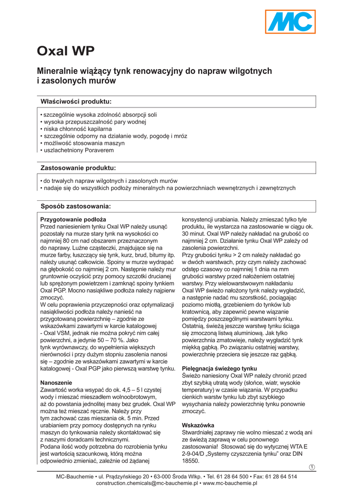 Oxal WP Mineralnie wiążący tynk renowacyjny do napraw wilgotnych i zasolonych murów Właściwości produktu: •szczególnie wysoka zdolność absorpcji soli • wysoka przepuszczalność pary wodnej • niska chłonność kapilarna • szczególnie odporny na działanie wody, pogodę i mróz • możliwość stosowania maszyn • uszlachetniony Poraverem Zastosowanie produktu: •do trwałych napraw wilgotnych i zasolonych murów • nadaje się do wszystkich podłoży mineralnych na powierzchniach wewnętrznych i zewnętrznych Sposób zastosowania: Przygotowanie podłoża Przed naniesieniem tynku Oxal WP należy usunąć pozostały na murze stary tynk na wysokości co najmniej 80 cm nad obszarem przeznaczonym do naprawy. Luźne cząsteczki, znajdujące się na murze farby, łuszczący się tynk, kurz, brud, bitumy itp. należy usunąć całkowicie. Spoiny w murze wydrapać na głębokość co najmniej 2 cm. Następnie należy mur gruntownie oczyścić przy pomocy szczotki drucianej lub sprężonym powietrzem i zamknąć spoiny tynkiem Oxal PGP. Mocno nasiąkliwe podłoża należy najpierw zmoczyć. W celu poprawienia przyczepności oraz optymalizacji nasiąkliwości podłoża należy nanieść na przygotowaną powierzchnię – zgodnie ze wskazówkami zawartymi w karcie katalogowej - Oxal VSM, jednak nie można pokryć nim całej powierzchni, a jedynie 50 – 70 %. Jako tynk wyrównawczy, do wypełnienia większych nierówności i przy dużym stopniu zasolenia nanosi się – zgodnie ze wskazówkami zawartymi w karcie katalogowej - Oxal PGP jako pierwszą warstwę tynku. Nanoszenie Zawartość worka wsypać do ok. 4,5 – 5 l czystej wody i mieszać mieszadłem wolnoobrotowym, aż do powstania jednolitej masy bez grudek. Oxal WP można też mieszać ręcznie. Należy przy tym zachować czas mieszania ok. 5 min. Przed urabianiem przy pomocy dostępnych na rynku maszyn do tynkowania należy skontaktować się z naszymi doradcami technicznymi. Podana ilość wody potrzebna do rozrobienia tynku jest wartością szacunkową, którą można odpowiednio zmieniać, zależnie od żądanej konsystencji urabiania. Należy zmieszać tylko tyle produktu, ile wystarcza na zastosowanie w ciągu ok. 30 minut. Oxal WP należy nakładać na grubość co najmniej 2 cm. Działanie tynku Oxal WP zależy od zasolenia powierzchni. Przy grubości tynku > 2 cm należy nakładać go w dwóch warstwach, przy czym należy zachować odstęp czasowy co najmniej 1 dnia na mm grubości warstwy przed nałożeniem ostatniej warstwy. Przy wielowarstwowym nakładaniu Oxal WP świeżo nałożony tynk należy wygładzić, a następnie nadać mu szorstkość, pociągając poziomo miotłą, grzebieniem do tynków lub kratownicą, aby zapewnić pewne wiązanie pomiędzy poszczególnymi warstwami tynku. Ostatnią, świeżą jeszcze warstwę tynku ściąga się zmoczoną listwą aluminiową. Jak tylko powierzchnia zmatowieje, należy wygładzić tynk miękką gąbką. Po związaniu ostatniej warstwy, powierzchnię przeciera się jeszcze raz gąbką. Pielęgnacja świeżego tynku Świeżo naniesiony Oxal WP należy chronić przed zbyt szybką utratą wody (słońce, wiatr, wysokie temperatury) w czasie wiązania. W przypadku cienkich warstw tynku lub zbyt szybkiego wysychania należy powierzchnię tynku ponownie zmoczyć. Wskazówka Stwardniałej zaprawy nie wolno mieszać z wodą ani ze świeżą zaprawą w celu ponownego zastosowania! Stosować się do wytycznej WTA E 2-9-04/D „Systemy czyszczenia tynku” oraz DIN 18550. MC-Bauchemie • ul. Prądzyńskiego 20 • 63-000 Środa Wlkp. • Tel. 61 28 64 500 • Fax: 61 28 64 514 [email protected] • www.mc-bauchemie.pl 1 Techniczne właściwości produktu Oxal WP: Parametr Jednostka miary Wartość Uwagi Zużycie kg/m² ok. 10 na ok. 10 mm grubości warstwy Proporcje mieszania kg : l 20 : 4,8 Oxal WP : woda Warunki podczas zastosowania °C ≥ +5 temperatura powietrza i podłoża przed użyciem składować 24 h w temp. > +5°C Czas obróbki min. ok. 30 przy +20°C i względnej wilgotności powietrza 65% Zwartości porów powietrza Obj.-% > 25 Współczynnik przepuszczalności pary wodnej ų -- < 15 Wytrzymałość na ściskanie ßd N/mm² 2 - 4 Absorpcja wody W24 kg/m > 0,3 Głębokość wnikania wody h mm < 5 Porowatość Obj.-% > 40 3 Właściwości produktu Oxal WP: Forma dostawy Worek 20 kg 1 Paleta (54 worki po 20 kg) Składowanie W suchych pomieszczeniach w oryginalnie zamkniętych opakowaniach przechowywać maksymalnie przez 6 miesięcy. Usuwanie odpadów Ze względu na ochronę środowiska naturalnego opakowania trzeba całkowicie opróżnić z zawartości. Podane informacje, dotyczące właściwości produktu są wynikiem badań laboratoryjnych i mogą różnić się w praktyce. Właściwe zastosowanie musi być ściśle określone na podstawie badań kontrolnych stanu konkretnego obiektu. Uwaga! Wszelkie informacje zawarte w niniejszej karcie oparte są na naszym doświadczeniu i najlepszej wiedzy, jednakże nie mogą być traktowane jako prawnie wiążące. Należy bezwzględnie każdorazowo stosować się do prawodawstwa miejscowego, w zakresie przeznaczenia oraz zastosowania w obiektach budowlanych. Przy spełnieniu powyższych wymogów odpowiadamy za poprawność przekazanych informacji w ramach naszych Ogólnych Warunków Sprzedaży, Dostaw i Płatności. Wszelkie doradztwo ze strony naszych Współpracowników, odbiegające od treści naszych kart technicznych, jest wiążące jedynie w przypadku pisemnego ich potwierdzenia. W każdym przypadku należy stosować się do ogólnie obowiązujących zasad sztuki budowlanej. Wydanie 12/13. Niniejszy druk został zaktualizowany pod względem technicznym. Tym samym unieważnia się dotychczasowe wydania i nie wolno ich stosować. W przypadku wydania nowej karty, zaktualizowanej pod względem technicznym, niniejsze wydanie traci ważność. MC-Bauchemie • ul. Prądzyńskiego 20 • 63-000 Środa Wlkp. • Tel. 