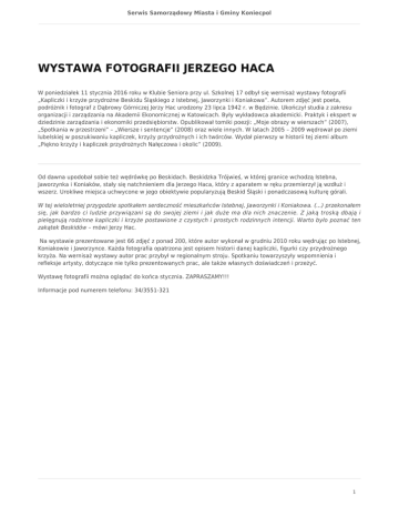 Serwis Samorządowy Miasta i Gminy Koniecpol WYSTAWA FOTOGRAFII JERZEGO HACA W poniedziałek 11 stycznia 2016 roku w Klubie Seniora przy ul. Szkolnej 17 odbył się wernisaż wystawy fotografii „Kapliczki i krzyże przydrożne Beskidu Śląskiego z Istebnej, Jaworzynki i Koniakowa”. Autorem zdjęć jest poeta, podróżnik i fotograf z Dąbrowy Górniczej Jerzy Hac urodzony 23 lipca 1942 r. w Będzinie. Ukończył studia z zakresu organizacji i zarządzania na Akademii Ekonomicznej w Katowicach. Były wykładowca akademicki. Praktyk i ekspert w dziedzinie zarządzania i ekonomiki przedsiębiorstw. Opublikował tomiki poezji: „Moje obrazy w wierszach” (2007), „Spotkania w przestrzeni” – „Wiersze i sentencje” (2008) oraz wiele innych. W latach 2005 – 2009 wędrował po ziemi lubelskiej w poszukiwaniu kapliczek, krzyży przydrożnych i ich twórców. Wydał pierwszy w historii tej ziemi album „Piękno krzyży i kapliczek przydrożnych Nałęczowa i okolic” (2009). Od dawna upodobał sobie też wędrówkę po Beskidach. Beskidzka Trójwieś, w której granice wchodzą Istebna, Jaworzynka i Koniaków, stały się natchnieniem dla Jerzego Haca, który z aparatem w ręku przemierzył ją wzdłuż i wszerz. Urokliwe miejsca uchwycone w jego obiektywie popularyzują Beskid Śląski i ponadczasową kulturę górali. W tej wieloletniej przygodzie spotkałem serdeczność mieszkańców Istebnej, Jaworzynki i Koniakowa. (...) przekonałem się, jak bardzo ci ludzie przywiązani są do swojej ziemi i jak duże ma dla nich znaczenie. Z jaką troską dbają i pielęgnują rodzinne kapliczki i krzyże postawione z czystych i prostych rodzinnych intencji. Warto było poznać ten zakątek Beskidów – mówi Jerzy Hac. Na wystawie prezentowane jest 66 zdjęć z ponad 200, które autor wykonał w grudniu 2010 roku wędrując po Istebnej, Koniakowie i Jaworzynce. Każda fotografia opatrzona jest opisem historii danej kapliczki, figurki czy przydrożnego krzyża. Na wernisaż wystawy autor prac przybył w regionalnym stroju. Spotkaniu towarzyszyły wspomnienia i refleksje artysty, dotyczące nie tylko prezentowanych prac, ale także własnych doświadczeń i przeżyć. Wystawę fotografii można oglądać do końca stycznia. ZAPRASZAMY!!! Informacje pod numerem telefonu: 34/3551-321 1
