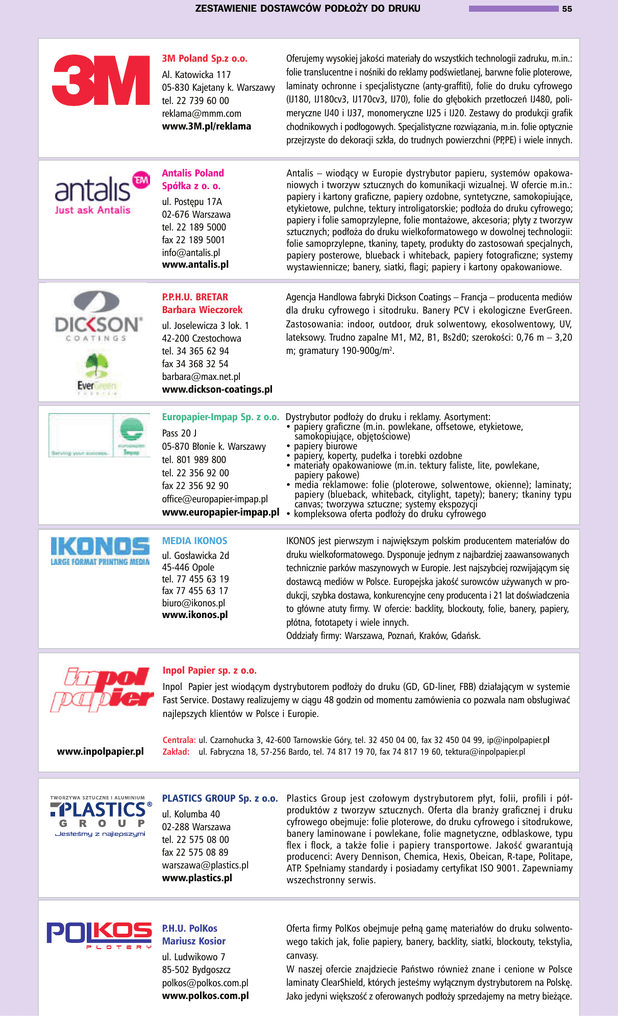 ZESTAWIENIE DOSTAWCóW PODŁOżY DO DRUKU 3M Poland Sp.z o.o. Al. Katowicka 117 05-830 Kajetany k. Warszawy tel. 22 739 60 00 [email protected] www.3M.pl/reklama Antalis Poland Spółka z o. o. ul. Postępu 17A 02-676 Warszawa tel. 22 189 5000 fax 22 189 5001 [email protected] www.antalis.pl P.P.H.U. BRETAR Barbara Wieczorek ul. Joselewicza 3 lok. 1 42-200 Czestochowa tel. 34 365 62 94 fax 34 368 32 54 [email protected] www.dickson-coatings.pl 55 Oferujemy wysokiej jakości materiały do wszystkich technologii zadruku, m.in.: folie translucentne i nośniki do reklamy podświetlanej, barwne folie ploterowe, laminaty ochronne i specjalistyczne (anty-graffiti), folie do druku cyfrowego (IJ180, IJ180cv3, IJ170cv3, IJ70), folie do głębokich przetłoczeń IJ480, polimeryczne IJ40 i IJ37, monomeryczne IJ25 i IJ20. Zestawy do produkcji grafik chodnikowych i podłogowych. Specjalistyczne rozwiązania, m.in. folie optycznie przejrzyste do dekoracji szkła, do trudnych powierzchni (PP,PE) i wiele innych. Antalis – wiodący w Europie dystrybutor papieru, systemów opakowaniowych i tworzyw sztucznych do komunikacji wizualnej. W ofercie m.in.: papiery i kartony graficzne, papiery ozdobne, syntetyczne, samokopiujące, etykietowe, pulchne, tektury introligatorskie; podłoża do druku cyfrowego; papiery i folie samoprzylepne, folie montażowe, akcesoria; płyty z tworzyw sztucznych; podłoża do druku wielkoformatowego w dowolnej technologii: folie samoprzylepne, tkaniny, tapety, produkty do zastosowań specjalnych, papiery posterowe, blueback i whiteback, papiery fotograficzne; systemy wystawiennicze; banery, siatki, flagi; papiery i kartony opakowaniowe. Agencja Handlowa fabryki Dickson Coatings – Francja – producenta mediów dla druku cyfrowego i sitodruku. Banery PCV i ekologiczne EverGreen. Zastosowania: indoor, outdoor, druk solwentowy, ekosolwentowy, UV, lateksowy. Trudno zapalne M1, M2, B1, Bs2d0; szerokości: 0,76 m – 3,20 m; gramatury 190-900g/m2. Europapier-Impap Sp. z o.o. Dystrybutor podłoży do druku i reklamy. Asortyment: • papiery graficzne (m.in. powlekane, offsetowe, etykietowe, Pass 20 J samokopiujące, objętościowe) • papiery biurowe 05-870 Błonie k. Warszawy • papiery, koperty, pudełka i torebki ozdobne tel. 801 989 800 • materiały opakowaniowe (m.in. tektury faliste, lite, powlekane, tel. 22 356 92 00 papiery pakowe) • media reklamowe: folie (ploterowe, solwentowe, okienne); laminaty; fax 22 356 92 90 papiery (blueback, whiteback, citylight, tapety); banery; tkaniny typu [email protected] canvas; tworzywa sztuczne; systemy ekspozycji www.europapier-impap.pl • kompleksowa oferta podłoży do druku cyfrowego MEDIA IKONOS ul. Gosławicka 2d 45-446 Opole tel. 77 455 63 19 fax 77 455 63 17 [email protected] www.ikonos.pl IKONOS jest pierwszym i największym polskim producentem materiałów do druku wielkoformatowego. Dysponuje jednym z najbardziej zaawansowanych technicznie parków maszynowych w Europie. Jest najszybciej rozwijającym się dostawcą mediów w Polsce. Europejska jakość surowców używanych w produkcji, szybka dostawa, konkurencyjne ceny producenta i 21 lat doświadczenia to główne atuty firmy. W ofercie: backlity, blockouty, folie, banery, papiery, płótna, fototapety i wiele innych. Oddziały firmy: Warszawa, Poznań, Kraków, Gdańsk. Inpol Papier sp. z o.o. Inpol Papier jest wiodącym dystrybutorem podłoży do druku (GD, GD-liner, FBB) działającym w systemie Fast Service. Dostawy realizujemy w ciągu 48 godzin od momentu zamówienia co pozwala nam obsługiwać najlepszych klientów w Polsce i Europie. Centrala:ul. Czarnohucka 3, 42-600 Tarnowskie Góry, tel. 32 450 04 00, fax 32 450 04 99, [email protected] 56 www.inpolpapier.plM A Zakład: I N TZESTAWIENIE P I C S 18, DOSTAWCóW N E WBardo, S DO ul.O Fabryczna 57-256 tel. PODŁOżY 74 817 19 70, faxDRUKU 74 817 19 60, [email protected] ś W I A T D R U K U 1/2 0 1 4 PLASTICS GROUP Sp. z o.o. Plastics Group jest czołowym dystrybutorem płyt, folii, profili i półproduktów z tworzyw sztucznych. Oferta dla branży graficznej i druku ul. Kolumba 40 cyfrowego obejmuje: folie ploterowe, do druku cyfrowego i sitodrukowe, 02-288 Warszawa banery laminowane i powlekane, folie magnetyczne, odblaskowe, typu tel. 22 575 08 00 flex i flock, a także folie i papiery transportowe. Jakość gwarantują fax 22 575 08 89 producenci: Avery Dennison, Chemica, Hexis, Obeican, R-tape, Politape, [email protected] ATP. Spełniamy standardy i posiadamy certyfikat ISO 9001. Zapewniamy www.plastics.pl wszechstronny serwis. P.H.U. PolKos Mariusz Kosior ul. Ludwikowo 7 85-502 Bydgoszcz [email protected] www.polkos.com.pl Oferta firmy PolKos obejmuje pełną gamę materiałów do druku solwentowego takich jak, folie papiery, banery, backlity, siatki, blockouty, tekstylia, canvasy. W naszej ofercie znajdziecie Państwo również znane i cenione w Polsce laminaty ClearShield, których jesteśmy wyłącznym dystrybutorem na Polskę. Jako jedyni większość z oferowanych podłoży sprzedajemy na metry bieżące.