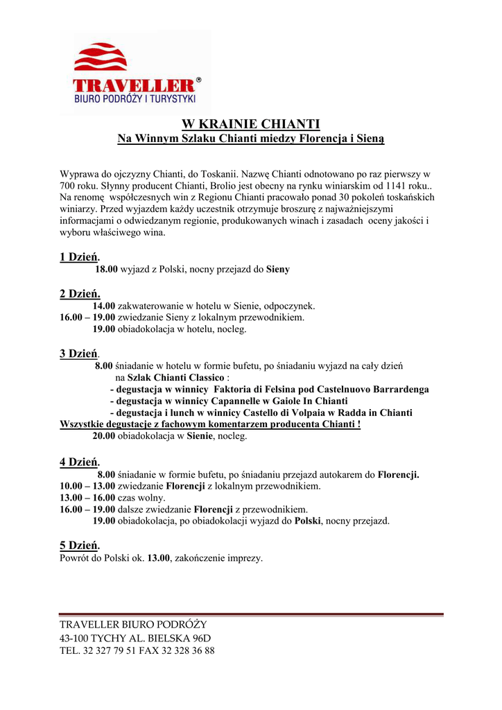 W KRAINIE CHIANTI Na Winnym Szlaku Chianti miedzy Florencja i Sieną Wyprawa do ojczyzny Chianti, do Toskanii. Nazwę Chianti odnotowano po raz pierwszy w 700 roku. Słynny producent Chianti, Brolio jest obecny na rynku winiarskim od 1141 roku.. Na renomę współczesnych win z Regionu Chianti pracowało ponad 30 pokoleń toskańskich winiarzy. Przed wyjazdem kaŜdy uczestnik otrzymuje broszurę z najwaŜniejszymi informacjami o odwiedzanym regionie, produkowanych winach i zasadach oceny jakości i wyboru właściwego wina. 1 Dzień. 18.00 wyjazd z Polski, nocny przejazd do Sieny 2 Dzień. 14.00 zakwaterowanie w hotelu w Sienie, odpoczynek. 16.00 – 19.00 zwiedzanie Sieny z lokalnym przewodnikiem. 19.00 obiadokolacja w hotelu, nocleg. 3 Dzień. 8.00 śniadanie w hotelu w formie bufetu, po śniadaniu wyjazd na cały dzień na Szlak Chianti Classico : - degustacja w winnicy Faktoria di Felsina pod Castelnuovo Barrardenga - degustacja w winnicy Capannelle w Gaiole In Chianti - degustacja i lunch w winnicy Castello di Volpaia w Radda in Chianti Wszystkie degustacje z fachowym komentarzem producenta Chianti ! 20.00 obiadokolacja w Sienie, nocleg. 4 Dzień. 8.00 śniadanie w formie bufetu, po śniadaniu przejazd autokarem do Florencji. 10.00 – 13.00 zwiedzanie Florencji z lokalnym przewodnikiem. 13.00 – 16.00 czas wolny. 16.00 – 19.00 dalsze zwiedzanie Florencji z przewodnikiem. 19.00 obiadokolacja, po obiadokolacji wyjazd do Polski, nocny przejazd. 5 Dzień. Powrót do Polski ok. 13.00, zakończenie imprezy. TRAVELLER BIURO PODRÓŻY 43-100 TYCHY AL. BIELSKA 96D TEL. 32 327 79 51 FAX 32 328 36 88 Cena standardowej Imprezy obejmuje : - podróŜ autokarem - opiekę pilota - 2 noclegi w hotelu w Sienie w pokojach 2osobowych - 2 śniadania w hotelu w formie bufetu - 3 obiadokolacje - 1 lunch w trakcie degustacji - 3 degustacje Chianti w znanych winnicach na Szlaku Chianti - zwiedzanie Sieny z przewodnikiem - zwiedzanie Florencji z przewodnikiem - opłaty drogowe i parkingowe - ubezpieczenie KL i NW - podatek VAT Cena standardowa nie zawiera kosztów wstępów do muzeów i obiektów zabytkowych. . TRAVELLER BIURO PODRÓŻY 43-100 TYCHY AL. BIELSKA 96D TEL. 32 327 79 51 FAX 32 328 36 88
