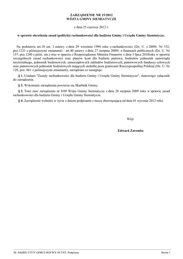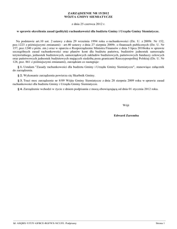 ZARZĄDZENIE NR 15/2012 WÓJTA GMINY SIEMIATYCZE z dnia 25 czerwca 2012 r. w sprawie określenia zasad (polityki) rachunkowości dla budżetu Gminy i Urzędu Gminy Siemiatycze. Na podstawie art.10 ust. 2 ustawy z dnia 29 września 1994 roku o rachunkowości (Dz. U. z 2009r. Nr 152, poz.1223 z późniejszymi zmianami) : art.40 ustawy z dnia 27 sierpnia 2009r. o finansach publicznych (Dz. U. Nr 157, poz.1240 z późn. zm.) oraz w oparciu o Rozporządzenie Ministra Finansów z dnia 5 lipca 2010roku w sprawie szczególnych zasad rachunkowości oraz planów kont dla budżetu państwa, budżetów jednostek samorządu terytorialnego, jednostek budżetowych, samorządowych zakładów budżetowych, państwowych funduszy celowych oraz państwowych jednostek budżetowych mających siedzibę poza granicami Rzeczypospolitej Polskiej (Dz. U. Nr 128, poz. 861 z późniejszymi zmianami), zarządzam co następuje: § 1. Ustalam "Zasady rachunkowości dla budżetu Gminy i Urzędu Gminy Siemiatycze", stanowiące załącznik do zarządzenia. § 2. Wykonanie zarządzenia powierza się Skarbnik Gminy. § 3. Traci moc zarządzenie nr 8/09 Wójta Gminy Siemiatycze z dnia 28 sierpnia 2009 roku w sprawie zasad rachunkowości dla budżetu Gminy i Urzędu Gminy Siemiatycze. § 4. Zarządzenie wchodzi w życie z dniem podpisania z mocą obowiązującą od dnia 01 stycznia 2012 roku. Wójt Edward Zaremba ————————————————————————————————————————————————————————— Id: ASQBX-YJTJY-GFBCE-RGFWX-NCUFE. Podpisany Strona 1 Załącznik do Zarządzenia Nr 15/2012 Wójta Gminy Siemiatycze z dnia 25 czerwca 2012 r. ZASADY RACHUNKOWOŚCI DLA BUDŻETU GMINY I URZĘDU GMINY SIEMIATYCZE Rozdział 1. Ogólne zasady rachunkowości § 1. Zadaniem rachunkowości jest stosowanie określonych zasad aby w sposób prawidłowy, rzetelny i jasny przedstawić w księgach rachunkowych i sporządzonych na ich podstawie sprawozdaniach sytuację majątkową i finansową Gminy § 2. 1. Rokiem obrotowym jest rok kalendarzowy od 1 stycznia do 31 grudnia 2. Przyjmuje się, że salda bilansu zamknięcia zawsze są saldami początkowymi roku następnego. 3. Okresami sprawozdawczymi są miesiące, kwartały, półrocze lub rok, zgodnie z obowiązującymi w tym zakresie przepisami. § 3. W księgach rachunkowych danego roku budżetowego ujmuje się wszystkie operacje finansowe i gospodarcze, niezależnie od terminu zapłaty. § 4. Wycena składników majątkowych dokonywana jest na podstawie poniesionych kosztów ich utrzymania uwzględniając odpisy umorzeniowe i okresy użytkowania. § 5. Zasady ewidencji powinny charakteryzować się ciągłością na przestrzeni dłuższego okresu czasu. § 6. Szczególne znaczenie w rachunkowości Gminy ma ewidencja dochodów i wydatków budżetowych. Prowadzić je należy według jednostek organizacyjnych Gminy. § 7. Dokonywanie okresowych inwentaryzacji aktywów i pasywów w celu doprowadzania danych wynikających z ksiąg rachunkowych do zgodności ze stanem rzeczywistym. Rozliczanie osób odpowiedzialnych za dokonania oceny przydatności składników majątkowych i przeciwdziałaniu nieprawidłowości w gospodarowaniu majątkiem Gminy, przestrzegając zasady istotności. § 8. Księgi rachunkowe prowadzone są w języku polskim i walucie polskiej, w złotych i groszach. Dowód księgowy opiewający na waluty obce powinien zawierać przeliczenie ich wartości na walutę polską według średniego kursu bankowego obowiązującego w dniu dokonania operacji gospodarczej. Rozdział 2. Księgi rachunkowe § 9. 1. Księgi rachunkowe prowadzone są w Urzędzie Gminy z wykorzystaniem systemu informatycznego. 2. System informatyczny rachunkowości budżetu Gminy i Urzędu Gminy obejmujące następujące programy: 1) "Księgowość Budżetowa" opracowanego przez Usługi Informatyczne INFO-SYSTEM Romana i Tadeusza Groszek, zam. Legionowo ul.Piłsudskiego31/40, wdrożony i konserwowany przez Przedsiębiorstwo UsługowoHandlowe Informatyki ”ZETO w Białymstoku ulica Skorupska 9 2) "Kadry i płace" opracowanego przez Usługi Informatyczne INFO-SYSTEM Romana i Tadeusza Groszek, wdrożony i konserwowany przez Przedsiębiorstwo Usługowo-Handlowe Informatyki ”ZETO w Białymstoku ulica Skorupska 9. 3) Urząd Gminy posiada licencje ( świadectwa legalności) oprogramowania oraz oświadczenia o zgodności programu "Księgowość Budżetowa" i programu "kadry i płace" autorstwa firmy Usługi Informatyczne INFOSystem Romana i Tadeusza Groszek S.C. 05.120 Legionowo, który jest zgodny z wymogami ustawy o rachunkowości. Nową wersję programu „Księgowość Budżetowa” dla Windows stosuje się od 1 stycznia 2004roku. Program działa na nowoczesnej bazie danych SQL. InterBase i spełnia wymogi ustawy o rachunkowości. ————————————————————————————————————————————————————————— Id: ASQBX-YJTJY-GFBCE-RGFWX-NCUFE. Podpisany Strona 1 3. Przelewy bankowe dotyczące działalności budżetowej sporządzane są w systemie "Home Banking". Producentem systemu jest System Manufacturery ( nazwa systemu operacyjnego- Microsoft Windows XP Professional). 4. Dla potrzeb rozliczeń z Zakładem Ubezpieczeń Społecznych stosowany jest program "Płatnik ". 5. Programy, o których mowa w ust. 2,3,4 powinny spełniać wymogi ustawy o rachunkowości i innych aktów prawnych. § 10. Wykorzystywany w Urzędzie Gminy system informatyczny zapewnia automatyczną kontrolę ciągłości zapisów oraz przenoszenia obrotów i sald. Księgi rachunkowe prowadzone są na bieżąco, z odzwierciedleniem stanu rzeczywistego i zapewnieniem kompletności ujęcia wszystkich operacji gospodarczych, zgodnie z ich treścią ekonomiczną. § 11. Wydruk komputerowy zawierać powinien następujące elementy: 1) nazwę jednostki, 2) wyraźnie określony