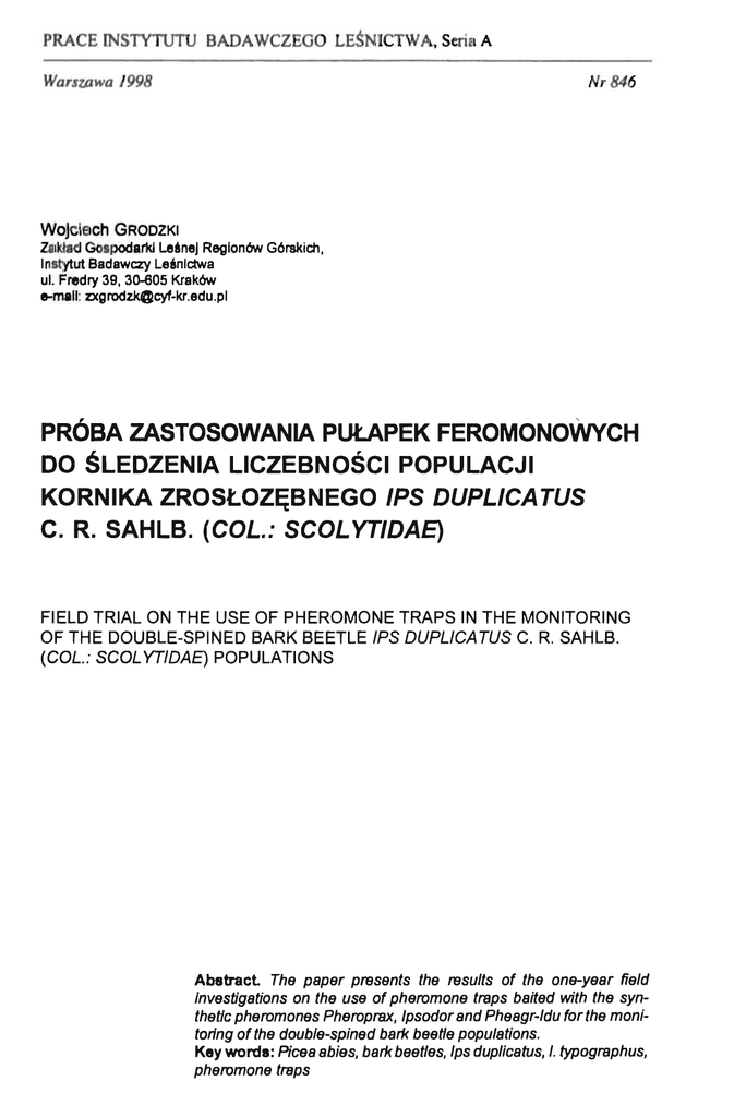 PRACE INSTYnJTU BADAWCZEOO LEŚNICTW At Seria A WQTllQWQ /998 Nr 846 Wojciech GRODZKI Zakład GoapodarteJ Leśnej Regionów Górskich, Instytut Badawczy Lełnlctwa ul. Fredry 39, 30-805 Kraków e-mail: zxgrodzkQcyf-kr.edu.pl PRÓBA ZASTOSOWANIA PUŁAPEK FEROMONOWvCH DO ŚLEDZENIA LICZEBNOŚCI POPULACJI KORNIKA ZROSŁOZĘBNEGO IPS DUPLICA rus C. R. SAHLB. (COL.: SCOL YTIDAE) FIELD TRIAL ON THE USE OF PHEROMONE TRAPS IN THE MONITORING OF THE DOUBLE-SPINED BARK BEETLE IPS DUPLlCATUS C. R. SAHLB. (COL. : SCOL YTIDAE) POPULATIONS Abatracl The paper presents the resu/ts of the one-year field InvestJgations on the use of pheromone traps baited with the synthetJc pheromones Pheroprax, /psodor and Pheagr-/du for the monitoring the doub/e-spined barle beetle popu/ations. Key word.: Picea abies, barle beetfes, /ps dupllcatus, I. typographus, pheromone traps o, 1. WSTĘP Śledzenie liczebności populacji owadów kambiofagicznych, mimo znacznej ilości istniejących opracowań, nadal pozostaje zagadnieniem wymagającym dalszych badań. Wynika to zarówno z okresowych zmian j akościowych w zagrożeniu drzewostanów, jak i właściwości biologicznych poszczególnych gatunków owadów, stwarzających to zagrożenie. Wśród kambiofagów świerka pospolitego, których ogólny stopień poznania jest znaczny, gatunkiem takim jest m.in. komik zrosłozębny Ips duplicatus C. R. SahIb. - dotkliwy z gospodarczego punktu widzenia szkodnik leśny o okresowym i lokalnym znaczeniu. Masowy pojaw tego komika, który w ostatnich latach obserwowany jest w świerczynach Wyżyny Śląskiej, stworzył okazję do przeanalizowania możliwości kontroli liczebności jego populacji (GRODZKI 1996, 1997). Po dokonaniu przeglądu dotychczas stosowany~h metod prognozowania i zwalczania szkodników wtórnych wybrano spośród nich dwie, które poddano jednorocznym testom terenowym, mającym ocenić ich skuteczność w stosunku do kornika zrosłozębnego. Jedną z nich jest stosowanie pułapek feromonowych, czemu poświęcona jest niniejsza praca*. 2. PRZEGLĄD LITERATURY Problematyką prognozowania i zwalczania kornika zrosłozębnego zajmowano się w naszym kraju głównie w latach pięćdziesiątych, podczas gradacyjnych wystąpień tego szkodnika na terenie północno-wschodniej Polski (SCHNAIDER 1952, SIERPIŃSKI 1958). Wyniki ówczesnych obserwacji zgodne sąz powtarzającymi się w literaturze informacjami o braku przydatności leżących drzew pułapkowych, które komik zrosłozębny zasiedla bardzo niechętnie (KARPIŃSKI, STRA WIŃSKI 1948; NUNBERG 1981; BURAKOWSKI i in. 1992). SIERPIŃSKI (1958) proponuje, na podstawie informacji z literatury, stosowanie do zwalczania szkodnika stojących drzew pułapkowych, jednak własne jego doświadczenia w tym zakresie nie dały pozytywnych rezultatów. Zachęcające efekty stosowania podobnych drzew pułapkowych uzyskał natomiast MRKVA (1995). Wszyscy autorzy stwierdzają przy tym zgodnie, że przy zwalczaniu szkodnika najlepsze efekty daje wyszukiwanie i terminowe usuwanie drzew zasiedlonych. Brak jednak metod służących obserwacji wahań liczebności populacji szkodnika. * Badania wykonano w ramach programu BLP-760 finansowanego przez Dyrekcję Generalną Lasów Państwowych Próba zastosowania pułapekferomonowych 97 . Wykorzystanie syntetycznych feromonów do śledzenia dynamiki populacji komika zrosłozębnego zapoczątkował BAKKE (1975), uzyskując pozytywne efekty wabienia tego owada przy zastosowaniu ipsdienolu. SELANDER i NUORTEVA (1980) stwierdzili silne wabiące działanie syntetycznego atraktantu komika drukarza (Ipslure) na komika zr.osłozębnego (stosunek odłowionych gatunków wynosił 6:4). KRÓL i BAKKE (1985, 1986) testując pułapki feromonowe na komika drukarza odławiali znaczne ilości chrząszczy komika zrosłozębnego, zaś ZOTOV A (1987) stwierdziła, że efekt wabienia 1. duplicatus jest silniejszy na powierzchni zrębu zupełnego niż w drzewostanie. Także GAVYALIS i in. (1981) oraz Y AKAITIS i Y AKAITIS (1988) podczas badań nad działaniem syntetycznych atraktantów o zróżnicowanym składzie na korniki świerka odławiali znaczne ilości 1. duplicatus łącznie z 1. typographus (L.). W ostatnich latach stwierdzono, że 1. duplicatus produkuje własną, specyficzną substancję wabiącą, opisanąjako E-myrcenol (BYERS i in. 1990). Badania biochemiczne (IVARSSON i jn. 1993; IvARSSON, BIRGERSSON 1995) i terenowe (SCHL YTER i in. 1992) przy użyciu jej syntetycznego analogu wykazały znaczną efektywność a zarazem selektywność wabienia tego gatunku komika. 3. CEL I ZAKRES BADAŃ Celem pracy było wstępne sprawdzenie w praktyce możliwości śledzenia dynamiki liczebności populacji komika zrosłozębnego za pomocą dwu typów pułapek feromon owych i dwu syntetycznych feromonów komika drukarza. Dodatkowo wstępnie testowano w warunkach terenowych nowy preparat Pheagr-Idu produkcji czeskiej na kornika zrosłozębnego . Skuteczność testowanych feromonów i pułapek w odłowach kornika zrosłozębnego porównano z ich skutecznością w odłowach komika drukarza. 4. TEREN I METODYKA BADAŃ Badania prowadzono na Wyżynie Śląskiej, na terenie nadleśnictwa Strzelce Opolskie (RDLP Katowice), w drzewostanach świerkowych objętych gradacyjnym występowaniem komika zrosłozębnego. Doświadczenia zlokalizowano w trzech drzewostanach: _~ -leśno Zimna Wódka oddz. 5, drzewostan świerkowy ok. 70-letni o zwarciu przerywanym, rosnący na siedlisku Lśw, dotknięty występowaniem choroby opieńkowej; 98 W Grodzki - leśno Szymiszów oddz. 94, drzewostan świerkowy ok 100-letni o zwarciu umiarkowanym, rosnący na siedlisku BMśw; - leśn o Klucze oddz. 21, drzewostan o składzie 6So 4Św i zwarciu przerywanym, rosnący na siedlisku Lśw, świerk w wieku ok. 90 lat. Doświadczenia prowadzono w 5 grupach pułapek, z zastosowaniem pułapek rurowych (Borregarda) i ekranowych (IBL-2). W każdej grupie złożonej z 3 pułapek testowano działanie syntetyc