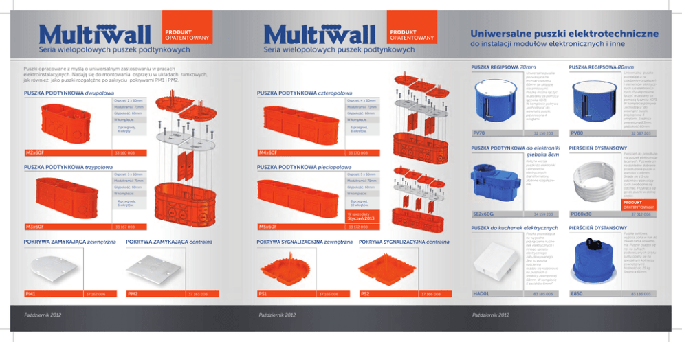 PRODUKT OPATENTOWANY Seria wielopolowych puszek podtynkowych PRODUKT OPATENTOWANY Seria wielopolowych puszek podtynkowych Osprzęt: 2 x 60mm Osprzęt: 4 x 60mm Moduł ramki: 71mm Moduł ramki: 71mm Głębokość: 60mm Głębokość: 60mm W komplecie: W komplecie: 6 przegród, 8 wkrętów. PUSZKA PODTYNKOWA trzypolowa PV70 33 170 008 Osprzęt: 3 x 60mm Osprzęt: 5 x 60mm Moduł ramki: 71mm Moduł ramki: 71mm Głębokość: 60mm Głębokość: 60mm W komplecie: W komplecie: Październik 2012 M5x60F 33 167 008 37 162 006 POKRYWA ZAMYKAJĄCA centralna PM2 Pierścień do przedłużenia puszek elektroinstalacyjnych. Pozwala on na dokładne dobranie przedłużenia puszki o wartości co 6mm. Składa się z 5-ciu odcinków pozwalających swobodnie się odcinać. Przykręca się go do puszki w dolnej części. PRODUKT OPATENTOWANY SE2x60G 37 163 006 33 172 008 POKRYWA SYGNALIZACYJNA zewnętrzna PS1 Październik 2012 37 165 008 34 159 203 PUSZKA do kuchenek elektrycznych 37 166 008 PD60x30 HAD01 Październik 2012 83 185 006 37 012 006 PIERŚCIEŃ DYSTANSOWY Puszka sufitowa, wyposa żona w hak do zawieszania oświetlenia. Puszkę osadza się np. na sufitach podwieszanych (z tyłu sufitu opiera się na specjalnym kołnierzu zewnętrznym). Nośność do 25 kg. Srednica 61mm. Puszka pozwalająca na wygodne przyłączenie kuchenek elektrycznych i innego sprzętu elektrycznego zabudowywanego. Jest to puszka naścienna osadza się rozporowo na puszkach o średnicy zewnętrznej 68mm. W komplecie 5 zacisków 6mm2 POKRYWA SYGNALIZACYJNA centralna PS2 32 087 203 PIERŚCIEŃ DYSTANSOWY 8 przegród, 10 wkrętów. Styczeń 2013 PM1 PV80 Kolejna wersja puszki do elektroniki i elmenetów elektrycznych (transformatory, złożone rozgałęzienia). W sprzedaży POKRYWA ZAMYKAJĄCA zewnętrzna Uniwersalna puszka pozwalająca na osadzenie rozgałęzień i elementów elektrycznych lub elektronicznych. Puszkę można łączyć w zestawy za pomocą łącznika KD71. W komplecie pokrywa „wchodząca” do wewnątrz puszki, przykręcona 4 wkrętami. Srednica zewnętrzna 83mm, głębokość 60mm. głęboka 8cm PUSZKA PODTYNKOWA pięciopolowa 4 przegrody, 6 wkrętów. M3x60F 32 150 203 PUSZKA PODTYNKOWA do elektroniki M4x60F 33 160 008 PUSZKA REGIPSOWA 80mm Uniwersalna puszka pozwalająca na montaż osprzętu 60mm (w układzie nieramkowym). Puszkę można łączyć w zestawy za pomocą łącznika KD71. W komplecie pokrywa „wchodząca” do wewnątrz puszki, przykręcona 4 wkrętami. PUSZKA PODTYNKOWA czteropolowa 2 przegrody, 4 wkręty. M2x60F do instalacji modułów elektronicznych i inne PUSZKA REGIPSOWA 70mm Puszki opracowane z myślą o uniwersalnym zastosowaniu w pracach elektroinstalacyjnych. Nadają się do montowania osprzętu w układach ramkowych, jak również jako puszki rozgałęźne po zakryciu pokrywami PM1 i PM2. PUSZKA PODTYNKOWA dwupolowa Uniwersalne puszki elektrotechniczne E850 83 186 003