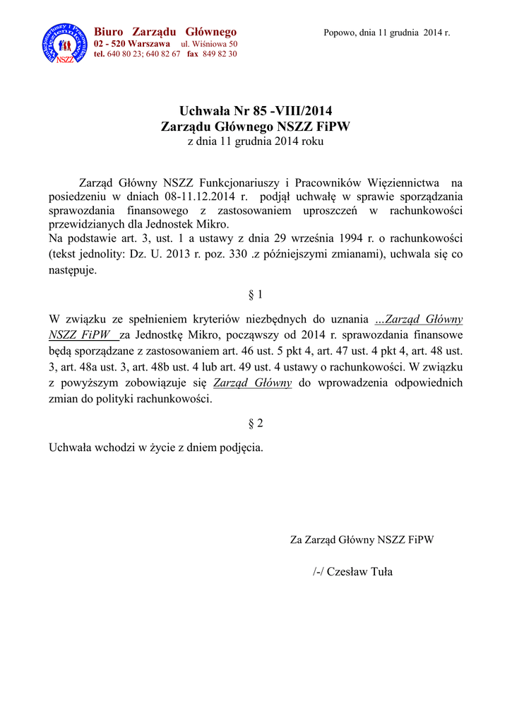 Biuro Zarządu Głównego Popowo, dnia 11 grudnia 2014 r. ul. Wiśniowa 50 tel. 640 80 23; 640 82 67 fax 849 82 30 02 - 520 Warszawa Uchwała Nr 85 -VIII/2014 Zarządu Głównego NSZZ FiPW z dnia 11 grudnia 2014 roku Zarząd Główny NSZZ Funkcjonariuszy i Pracowników Więziennictwa na posiedzeniu w dniach 08-11.12.2014 r. podjął uchwałę w sprawie sporządzania sprawozdania finansowego z zastosowaniem uproszczeń w rachunkowości przewidzianych dla Jednostek Mikro. Na podstawie art. 3, ust. 1 a ustawy z dnia 29 września 1994 r. o rachunkowości (tekst jednolity: Dz. U. 2013 r. poz. 330 .z późniejszymi zmianami), uchwala się co następuje. §1 W związku ze spełnieniem kryteriów niezbędnych do uznania …Zarząd Główny NSZZ FiPW za Jednostkę Mikro, począwszy od 2014 r. sprawozdania finansowe będą sporządzane z zastosowaniem art. 46 ust. 5 pkt 4, art. 47 ust. 4 pkt 4, art. 48 ust. 3, art. 48a ust. 3, art. 48b ust. 4 lub art. 49 ust. 4 ustawy o rachunkowości. W związku z powyższym zobowiązuje się Zarząd Główny do wprowadzenia odpowiednich zmian do polityki rachunkowości. §2 Uchwała wchodzi w życie z dniem podjęcia. Za Zarząd Główny NSZZ FiPW /-/ Czesław Tuła