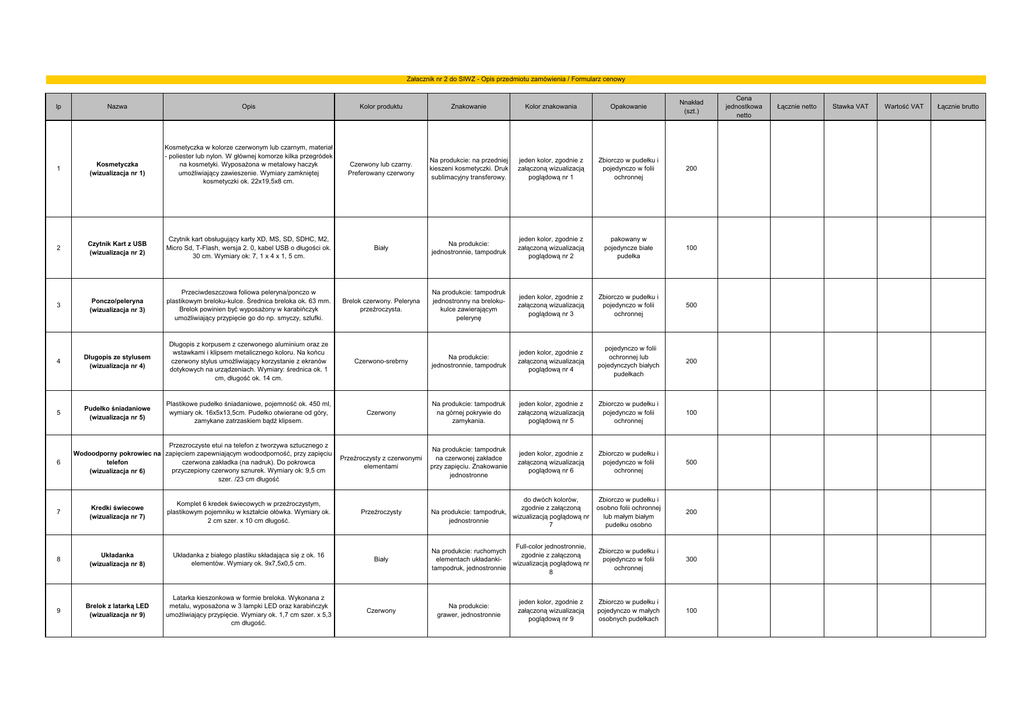 Załacznik nr 2 do SIWZ - Opis przedmiotu zamówienia / Formularz cenowy lp Nazwa Opis Kosmetyczka w kolorze czerwonym lub czarnym, materiał - poliester lub nylon. W głównej komorze kilka przegródek na kosmetyki. Wyposażona w metalowy haczyk umożliwiający zawieszenie. Wymiary zamkniętej kosmetyczki ok. 22x19,5x8 cm. Kolor produktu Znakowanie Kolor znakowania Opakowanie Nnakład (szt.) Czerwony lub czarny. Preferowany czerwony Na produkcie: na przedniej kieszeni kosmetyczki. Druk sublimacyjny transferowy. jeden kolor, zgodnie z załączoną wizualizacją poglądową nr 1 Zbiorczo w pudełku i pojedynczo w folii ochronnej 200 1 Kosmetyczka (wizualizacja nr 1) 2 Czytnik Kart z USB (wizualizacja nr 2) Czytnik kart obsługujący karty XD, MS, SD, SDHC, M2, Micro Sd, T-Flash, wersja 2. 0, kabel USB o długości ok. 30 cm. Wymiary ok: 7, 1 x 4 x 1, 5 cm. Biały Na produkcie: jednostronnie, tampodruk jeden kolor, zgodnie z załączoną wizualizacją poglądową nr 2 pakowany w pojedyncze białe pudełka 100 3 Ponczo/peleryna (wizualizacja nr 3) Przeciwdeszczowa foliowa peleryna/ponczo w plastikowym breloku-kulce. Średnica breloka ok. 63 mm. Brelok powinien być wyposażony w karabińczyk umożliwiający przypięcie go do np. smyczy, szlufki. Brelok czerwony. Peleryna przeźroczysta. Na produkcie: tampodruk jednostronny na brelokukulce zawierającym pelerynę jeden kolor, zgodnie z załączoną wizualizacją poglądową nr 3 Zbiorczo w pudełku i pojedynczo w folii ochronnej 500 4 Długopis ze stylusem (wizualizacja nr 4) Długopis z korpusem z czerwonego aluminium oraz ze wstawkami i klipsem metalicznego koloru. Na końcu czerwony stylus umożliwiający korzystanie z ekranów dotykowych na urządzeniach. Wymiary: średnica ok. 1 cm, długość ok. 14 cm. Czerwono-srebrny Na produkcie: jednostronnie, tampodruk jeden kolor, zgodnie z załączoną wizualizacją poglądową nr 4 pojedynczo w folii ochronnej lub pojedynczych białych pudełkach 200 5 Pudełko śniadaniowe (wizualizacja nr 5) Plastikowe pudełko śniadaniowe, pojemność ok. 450 ml, wymiary ok. 16x5x13,5cm. Pudełko otwierane od góry, zamykane zatrzaskiem bądź klipsem. Czerwony Na produkcie: tampodruk na górnej pokrywie do zamykania. jeden kolor, zgodnie z załączoną wizualizacją poglądową nr 5 Zbiorczo w pudełku i pojedynczo w folii ochronnej 100 Przeźroczysty z czerwonymi elementami Na produkcie: tampodruk na czerwonej zakładce przy zapięciu. Znakowanie jednostronne jeden kolor, zgodnie z załączoną wizualizacją poglądową nr 6 Zbiorczo w pudełku i pojedynczo w folii ochronnej 500 Zbiorczo w pudełku i osobno folii ochronnej lub małym białym pudełku osobno 200 6 Przezroczyste etui na telefon z tworzywa sztucznego z Wodoodporny pokrowiec na zapięciem zapewniającym wodoodporność, przy zapięciu czerwona zakładka (na nadruk). Do pokrowca telefon przyczepiony czerwony sznurek. Wymiary ok: 9,5 cm (wizualizacja nr 6) szer. /23 cm długość do dwóch kolorów, zgodnie z załączoną Na produkcie: tampodruk, wizualizacją poglądową nr jednostronnie 7 7 Kredki świecowe (wizualizacja nr 7) Komplet 6 kredek świecowych w przeźroczystym, plastikowym pojemniku w kształcie ołówka. Wymiary ok. 2 cm szer. x 10 cm długość. Przeźroczysty 8 Układanka (wizualizacja nr 8) Układanka z białego plastiku składająca się z ok. 16 elementów. Wymiary ok. 9x7,5x0,5 cm. Biały Na produkcie: ruchomych elementach układankitampodruk, jednostronnie Full-color jednostronnie, zgodnie z załączoną wizualizacją poglądową nr 8 Zbiorczo w pudełku i pojedynczo w folii ochronnej 300 9 Brelok z latarką LED (wizualizacja nr 9) Latarka kieszonkowa w formie breloka. Wykonana z metalu, wyposażona w 3 lampki LED oraz karabińczyk umożliwiający przypięcie. Wymiary ok. 1,7 cm szer. x 5,3 cm długość. Czerwony Na produkcie: grawer, jednostronnie jeden kolor, zgodnie z załączoną wizualizacją poglądową nr 9 Zbiorczo w pudełku i pojedynczo w małych osobnych pudełkach 100 Cena jednostkowa netto Łącznie netto Stawka VAT Wartość VAT Łącznie brutto Skrobaczka samochodowa, materiał chroniący rękę z Niebieski materiał. Plastikowa zewnątrz niebieski, wewnątrz ocieplony. W środku skrobaczka - przeźroczysty ocieplacza rączka od skrobaczki. Skrobaczka plastikowa plastik. przeźroczysta. Wymiary ok. 28 x 16 x 1,5 cm. Na produkcie: jednostronnie druk sublimacyjny transferowy Kolorystyka zgodnie z załączoną wizualizacją poglądową nr 10 Zbiorczo w pudełku i pojedynczo w folii ochronnej 500 Papier biały Nadruk jednostronnie na każdej kartce. Kolorystyka zgodnie z załączoną wizualizacją poglądową nr 11 Zbiorczo w pudełku i pojedynczo w folii ochronnej 500 Odblaskowa zawieszka z miękkiego plastiku w rozmiarach 6x6cm, wyposażona w karabińczyk umożliwiający przypięcie. zgodnie z wizualizacją nr 12 Na produkcie: tampodruk, dwustronnie Kolorystyka zgodnie z załączoną wizualizacją poglądową nr 12 Zbiorczo w pudełku i pojedynczo w folii ochronnej 500 Tekturowa zawieszka zapachowa do samochodu w wymiarach ok. 7 cm szer. x 9 cm długość. zgodnie z wizualizacją nr 13 Nadruk dwustronny. Kolorystyka zgodnie z załączoną wizualizacją nr 13 Zbiorczo w pudełku i pojedynczo w folii ochronnej 500 10 Skrobaczka do auta (wizualizacja nr 10) 11 Notes kartkowy A6 (wizualizacja nr 11) Notes kartkowy format A6. Papier offset 90g. 52 kartki. Górna krawędź klejona, karton na spodzie na całej powierzchni. 12 Zawieszka odblaskowa (wizualizacja nr 12) 13 Zawieszka zapachowa do auta (wizualizacja nr 13) ŁĄCZNIE:
