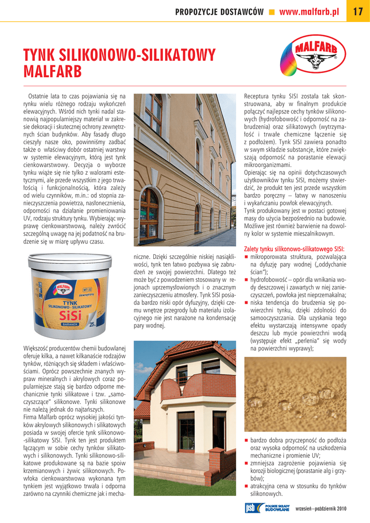 PROPOZYCJE DOSTAWCÓW O www.malfarb.pl TYNK SILIKONOWO-SILIKATOWY MALFARB Receptura tynku SISI została tak skonstruowana, aby w finalnym produkcie połączyć najlepsze cechy tynków silikonowych (hydrofobowość i odporność na zabrudzenia) oraz silikatowych (wytrzymałość i trwałe chemiczne łączenie się z podłożem). Tynk SISI zawiera ponadto w swym składzie substancje, które zwiększają odporność na porastanie elewacji mikroorganizmami. Opierając się na opinii dotychczasowych użytkowników tynku SISI, możemy stwierdzić, że produkt ten jest przede wszystkim bardzo poręczny – łatwy w nanoszeniu i wykańczaniu powłok elewacyjnych. Tynk produkowany jest w postaci gotowej masy do użycia bezpośrednio na budowie. Możliwe jest również barwienie na dowolny kolor w systemie mieszalnikowym. Ostatnie lata to czas pojawiania się na rynku wielu różnego rodzaju wykończeń elewacyjnych. Wśród nich tynki nadal stanowią najpopularniejszy materiał w zakresie dekoracji i skutecznej ochrony zewnętrznych ścian budynków. Aby fasady długo cieszyły nasze oko, powinniśmy zadbać także o właściwy dobór ostatniej warstwy w systemie elewacyjnym, którą jest tynk cienkowarstwowy. Decyzja o wyborze tynku wiąże się nie tylko z walorami estetycznymi, ale przede wszystkim z jego trwałością i funkcjonalnością, która zależy od wielu czynników, m.in.: od stopnia zanieczyszczenia powietrza, nasłonecznienia, odporności na działanie promieniowania UV, rodzaju struktury tynku. Wybierając wyprawę cienkowarstwową, należy zwrócić szczególną uwagę na jej podatność na brudzenie się w miarę upływu czasu. niczne. Dzięki szczególnie niskiej nasiąkliwości, tynk ten łatwo pozbywa się zabrudzeń ze swojej powierzchni. Dlatego też może być z powodzeniem stosowany w rejonach uprzemysłowionych i o znacznym zanieczyszczeniu atmosfery. Tynk SISI posiada bardzo niski opór dyfuzyjny, dzięki czemu wnętrze przegrody lub materiału izolacyjnego nie jest narażone na kondensację pary wodnej. Większość producentów chemii budowlanej oferuje kilka, a nawet kilkanaście rodzajów tynków, różniących się składem i właściwościami. Oprócz powszechnie znanych wypraw mineralnych i akrylowych coraz popularniejsze stają się bardzo odporne mechanicznie tynki silikatowe i tzw. „samoczyszczące” silikonowe. Tynki silikonowe nie należą jednak do najtańszych. Firma Malfarb oprócz wysokiej jakości tynków akrylowych silikonowych i silikatowych posiada w swojej ofercie tynk silikonowo-silikatowy SISI. Tynk ten jest produktem łączącym w sobie cechy tynków silikatowych i silikonowych. Tynki silikonowo-silikatowe produkowane są na bazie spoiw krzemianowych i żywic silikonowych. Powłoka cienkowarstwowa wykonana tym tynkiem jest wyjątkowo trwała i odporna zarówno na czynniki chemiczne jak i mecha- Zalety tynku silikonowo - silikatowego SISI: # mikroporowata struktura, pozwalająca na dyfuzję pary wodnej („oddychanie ścian”); # hydrofobowość – opór dla wnikania wody deszczowej i zawartych w niej zanieczyszczeń, powłoka jest nieprzemakalna; # niska tendencja do brudzenia się powierzchni tynku, dzięki zdolności do samooczyszczania. Dla uzyskania tego efektu wystarczają intensywne opady deszczu lub mycie powierzchni wodą (występuje efekt „perlenia” się wody na powierzchni wyprawy); # bardzo dobra przyczepność do podłoża oraz wysoka odporność na uszkodzenia mechaniczne i promienie UV; # zmniejsza zagrożenie pojawienia się korozji biologicznej (porastanie alg i grzybów); # atrakcyjna cena w stosunku do tynków silikonowych. wrzesień–październik 2010 17