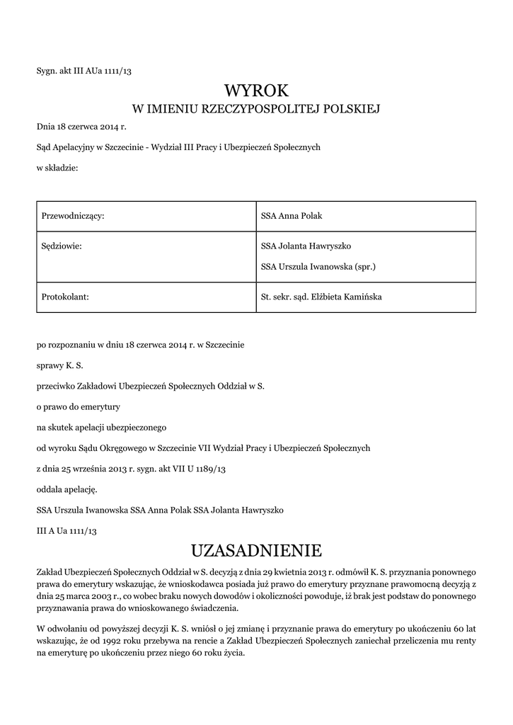 Sygn. akt III AUa 1111/13 WYROK W IMIENIU RZECZYPOSPOLITEJ POLSKIEJ Dnia 18 czerwca 2014 r. Sąd Apelacyjny w Szczecinie - Wydział III Pracy i Ubezpieczeń Społecznych w składzie: Przewodniczący: SSA Anna Polak Sędziowie: SSA Jolanta Hawryszko SSA Urszula Iwanowska (spr.) Protokolant: St. sekr. sąd. Elżbieta Kamińska po rozpoznaniu w dniu 18 czerwca 2014 r. w Szczecinie sprawy K. S. przeciwko Zakładowi Ubezpieczeń Społecznych Oddział w S. o prawo do emerytury na skutek apelacji ubezpieczonego od wyroku Sądu Okręgowego w Szczecinie VII Wydział Pracy i Ubezpieczeń Społecznych z dnia 25 września 2013 r. sygn. akt VII U 1189/13 oddala apelację. SSA Urszula Iwanowska SSA Anna Polak SSA Jolanta Hawryszko III A Ua 1111/13 UZASADNIENIE Zakład Ubezpieczeń Społecznych Oddział w S. decyzją z dnia 29 kwietnia 2013 r. odmówił K. S. przyznania ponownego prawa do emerytury wskazując, że wnioskodawca posiada już prawo do emerytury przyznane prawomocną decyzją z dnia 25 marca 2003 r., co wobec braku nowych dowodów i okoliczności powoduje, iż brak jest podstaw do ponownego przyznawania prawa do wnioskowanego świadczenia. W odwołaniu od powyższej decyzji K. S. wniósł o jej zmianę i przyznanie prawa do emerytury po ukończeniu 60 lat wskazując, że od 1992 roku przebywa na rencie a Zakład Ubezpieczeń Społecznych zaniechał przeliczenia mu renty na emeryturę po ukończeniu przez niego 60 roku życia. W piśmie złożonym 26 sierpnia 2013 r. ubezpieczony podniósł ponadto, że posiada staż ubezpieczeniowy wynoszący 35 lat i 10 miesięcy okresów składkowych i 2 miesiące okresów nieskładkowych. W odpowiedzi na odwołanie organ rentowy wniósł o jego oddalenie w całości, podtrzymując argumentację, jak w uzasadnieniu zaskarżonej decyzji. Wyrokiem z dnia 25 września 2013 r. Sąd Okręgowy w Szczecinie VII Wydział Pracy i Ubezpieczeń Społecznych oddalił odwołanie. Powyższe orzeczenie Sąd Okręgowy oparł o następujące ustalenia faktyczne i rozważania prawne: K. S. urodził się dnia (...) Prawo do renty inwalidzkiej trzeciej grupy przyznano ubezpieczonemu od 1 lutego 1992 r. decyzją z dnia 16 marca 1992 r. W czasie pobierania renty ubezpieczony (w szczególności w 1998 roku) prowadził działalność gospodarczą. W dniu 4 lutego 2003 r. K. S. złożył w organie rentowym wniosek o przyznanie mu prawa do emerytury. Decyzją z dnia 25 marca 2003 r. Zakład Ubezpieczeń Społecznych przyznał ubezpieczonemu prawo do emerytury od 20 lutego 2003 r. (od osiągnięcia wieku). Przyznając wskazane prawo organ rentowy uznał wnioskodawcy staż ubezpieczeniowy wynoszący 34 lata i 10 miesięcy okresów składkowych i 2 miesiące okresów nieskładkowych. W dniu 11 marca 2013 r. K. S. złożył w organie rentowym wniosek o przeliczenie jego renty stałej na emeryturę po ukończeniu 60 roku życia. Pismem złożonym 15 kwietnia 2013 r. ubezpieczony ponaglił organ rentowy do rozpoznania wniosku. Decyzją z dnia 29 kwietnia 2013 r., po rozpatrzeniu wniosku K. S. z dnia 11 marca 2013 r., Zakład Ubezpieczeń Społecznych Oddział w S. odmówił przyznania ubezpieczonemu ponownego prawa do emerytury. W uzasadnieniu decyzji organ rentowy wskazał, że wnioskodawca posiada prawo do emerytury, które zostało mu przyznane prawomocną decyzją z dnia 25 marca 2003 r., co wobec braku nowych dowodów i okoliczności powoduje, iż brak jest podstaw do ponownego przyznawania prawa do wnioskowanego świadczenia. Na podstawie ustalonego stanu faktycznego oraz podstaw prawnych przywołanych poniżej Sąd Okręgowy uznał odwołanie za bezzasadne. W pierwszej kolejności sąd meriti podniósł, że wprowadzona ustawą z dnia 17 grudnia 1998 r. o emeryturach i rentach z Funduszu Ubezpieczeń Społecznych (j. t. Dz. U. z 2009 r., nr 153, poz. 1227; powoływana dalej jako ustawa emerytalna) reforma systemu emerytalno-rentowego miała na celu, między innymi, ograniczenie zakresu podmiotowego wcześniejszego przechodzenia na emeryturę i ujednolicenie wieku emerytalnego. Konieczność rozwiązań przejściowych spowodowała, że warunki przechodzenia na emeryturę zostały zróżnicowane według kryterium urodzenia: dla ubezpieczonych urodzonych po dniu 31 grudnia 1948 r. oraz dla ubezpieczonych urodzonych przed dniem 1 stycznia 1949 r. oraz dla niektórych ubezpieczonych urodzonych po dniu 31 grudnia 1948 r., a przed dniem 1 stycznia 1969 r. Dalej sąd pierwszej instancji wskazał, że zgodnie z dyspozycją art. 27 ust. 1 cytowanej ustawy ubezpieczonym urodzonym przed dniem 1 stycznia 1949 r. przysługuje emerytura, jeżeli spełnili łącznie następujące warunki: 1) osiągnęli wiek emerytalny określony w ust. 2 albo 3; 2) mają okres składkowy i nieskładkowy wynoszący co najmniej 20 lat dla kobiet i 25 lat dla mężczyzn, z zastrzeżeniem art. 27a. Przy czym, wiek emerytalny dla mężczyzn urodzonych w okresie do dnia 31 grudnia 1947 r. wynosi co najmniej 65 lat (ust. 3 pkt 1 art. 27 ustawy emerytalnej). Następnie Sąd Okręgowy podniósł, że w realiach sprawy niespornym jest, iż ubezpieczony wiek 65 lat osiągnął (...) i że decyzją z dnia 25 marca 2003 r. Zakład Ubezpieczeń Społecznych przyznał K. S. prawo do emerytury od wskazanej daty (od osiągnięcia wieku 65 lat). Przyznając wskazane prawo organ rentowy uznał przy tym wnioskodawcy staż ubezpieczeniowy wynoszący 34 lata i 10 miesięcy okresów składkowych i 2 miesiące okresów nieskładkowych. Sąd pierwszej instancji wskazał także, że zgodnie z art. 27a ustawy emeryturę przyznaje się z urzędu zamiast pobieranej renty z tytułu niezdolności do pracy osobie, która osiągnęła wiek emerytalny, o którym mowa w art. 27 ust. 2 i 3, oraz podlegała ubezpieczeniu społecznemu albo ubezpieczeniom emerytalnemu i rentowym. Przepis art. 24a ust. 2 stosuje się odpowiednio. Sąd meriti zwrócił uwagę, że z przywołanego przepisu jednoznacznie wynika więc, iż organ rentowy ma obowiązek pr