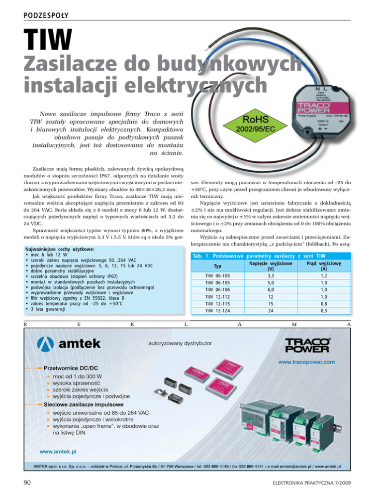 PODZESPOŁY TIW Zasilacze do budynkowych instalacji elektrycznych Nowe zasilacze impulsowe firmy Traco z serii TIW zostały opracowane specjalnie do domowych i biurowych instalacji elektrycznych. Kompaktowa obudowa pasuje do podtynkowych puszek instalacyjnych, jest też dostosowana do montażu na ścianie. Zasilacze mają formę płaskich, zalewanych żywicą epoksydową modułów o stopniu szczelności IP67, odpornych na działanie wody i kurzu, z wyprowadzeniami wejściowymi i wyjściowymi w postaci niezakończonych przewodów. Wymiary obudów to 48×48×26,3 mm. Jak większość produktów firmy Traco, zasilacze TIW mają uniwersalne wejścia akceptujące napięcia przemienne z zakresu od 93 do 264 VAC. Seria składa się z 6 modeli o mocy 6 lub 12 W, dostarczających pojedynczych napięć o typowych wartościach od 3,3 do 24 VDC. Sprawność większości typów wynosi typowo 80%, z wyjątkiem modeli o napięciu wyjściowym 3,3 V i 5,5 V, które są o około 5% gor- sze. Elementy mogą pracować w temperaturach otoczenia od –25 do +50°C, przy czym przed przegrzaniem chroni je wbudowany wyłącznik termiczny. Napięcie wyjściowe jest ustawione fabrycznie z dokładnością ±2% i nie ma możliwości regulacji. Jest dobrze stabilizowane: zmienia się co najwyżej o ±1% w całym zakresie zmienności napięcia wejściowego i o ±2% przy zmianach obciążenia od 0 do 100% obciążenia nominalnego. Wyjścia są zabezpieczone przed zwarciami i przeciążeniami. Zabezpieczenie ma charakterystykę „z podcięciem” (foldback). Po ustą- Najważniejsze cechy użytkowe: • moc 6 lub 12 W • szeroki zakres napięcia wejściowego 93...264 VAC • pojedyncze napięcie wyjściowe: 5, 6, 12, 15 lub 24 VDC • dobre parametry stabilizacyjne • szczelna obudowa (stopień ochrony IP67) • montaż w standardowych puszkach instalacyjnych • podwójna izolacja (podłączenie bez przewodu ochronnego) • wyprowadzone przewody wejściowe i wyjściowe • filtr wejściowy zgodny z EN 55022, klasa B • zakres temperatur pracy od –25 do +50°C • 3 lata gwarancji R 90 E K Tab. 1. Podstawowe parametry zasilaczy z serii TIW Napięcie wyjściowe [V] 3,3 5,0 6,0 12 15 24 Typ TIW TIW TIW TIW TIW TIW L 06-103 06-105 06-106 12-112 12-115 12-124 A M Prąd wyjściowy [A] 1,2 1,0 1,0 1,0 0,8 0,5 A ELEKTRONIKA PRAKTYCZNA 7/2009 Zasilacze do budynkowych instalacji elektrycznych alternatywę dla kosztownych urządzeń zasilających różnego rodzaju aktory i sensory wykorzystywane w systemach inteligentnych budynków. Potwierdzeniem ich jakości i niezawodności jest 3-letnia gwarancja producenta. pieniu przeciążenia zasilacz automatycznie powraca do normalnej pracy. Zasilacze TIW spełniają europejskie normy bezpieczeństwa wymagane w aplikacjach komercyjnych i mieszkaniowych: IEC/EN 60950-1, EN 50178 i EN 60335-1. Są również zgodne z normami EMC odnośnie emisji (EN 61000-6-3 i EN 55022, class B) i odporności (EN 61000-6-2 i EN 61000-4-2, -3, -4, -5, -6, -11). Typowe zastosowania to różnego rodzaju układy sterowania silników DC, czujników i wskaźników. Dzięki temu, że mogą być montowane w podtynkowych puszkach instalacyjnych, nawet pod typowymi łącznikami klawiszowymi lub gniazdami, stanowią znakomitą R E K Krzysztof Trzaska Dodatkowe informacje Dystrybutorem jest Amtek spol. s r.o. Sp. z o.o. tel. 022 866 41 40, e-mail: [email protected], www.amtek.pl Szczegółowe informacje o zasilaczach TIW są dostępne pod adresem: http://dsb.tracopower.com/upload/DSBUserFile/CPN_TracoPower/0_tiw.pdf L A M A K O N K U R S WIĘCEJ ŚWIATŁA Diody superluminescencyjne mają tak intensywne światło i są tak tanie (w ofercie www.sklep.avt.pl), że każdemu elektronikowi serce się rwie żeby coś fajnego z nimi zrobić, np. światła dyskotekowe, podświetlenia, dekoracje, reklamy świetlne, światła ostrzegawcze itd. I Ty powinieneś coś zrobić. Włącz się. Weź udział w nieustającym konkursie WIĘCEJ ŚWIATŁA. Zrób zdjęcia uzyskanych efektów świetlnych i zamieść je na specjalnej stronie konkursowej (wiecejswiatla. ep.com.pl). Opisy i schematy układów prześlij pod adresem redakcji [email protected]. NAGRODY: za materiał zdjęciowy umieszczony na wiecejswiatla.ep.com.pl dostaniesz darmową prenumeratę 2 numerów EP (prenumeratorom przedłużamy ich prenumeratę o 2 gratisowe numery). Opisy i schematy układów mają szansę publikacji na łamach EP – honorarium 250 zł/stronę. ELEKTRONIKA PRAKTYCZNA 7/2009 91