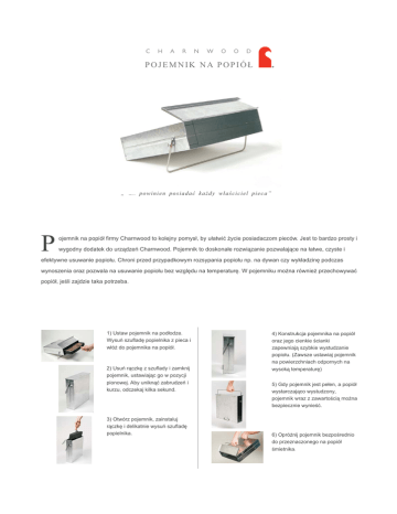 C H A R N W O O D POJEMNIK NA POPIÓŁ „ … . powinien posiadać każdy w łaściciel pieca ” P ojemnik na popiół firmy Charnwood to kolejny pomysł, by ułatwić życie posiadaczom pieców. Jest to bardzo prosty i wygodny dodatek do urządzeń Charnwood. Pojemnik to doskonałe rozwiązanie pozwalające na łatwe, czyste i efektywne usuwanie popiołu. Chroni przed przypadkowym rozsypania popiołu np. na dywan czy wykładzinę podczas wynoszenia oraz pozwala na usuwanie popiołu bez względu na temperaturę. W pojemniku można również przechowywać popiół, jeśli zajdzie taka potrzeba. 1) Ustaw pojemnik na podłodze. Wysuń szufladę popielnika z pieca i włóż do pojemnika na popiół. 2) Usuń rączkę z szuflady i zamknij pojemnik, ustawiając go w pozycji pionowej. Aby uniknąć zabrudzeń i kurzu, odczekaj kilka sekund. 3) Otwórz pojemnik, zainstaluj rączkę i delikatnie wysuń szufladę popielnika. 4) Konstrukcja pojemnika na popiół oraz jego cienkie ścianki zapewniają szybkie wystudzanie popiołu. (Zawsze ustawiaj pojemnik na powierzchniach odpornych na wysoką temperaturę) 5) Gdy pojemnik jest pełen, a popiół wystarczająco wystudzony, pojemnik wraz z zawartością można bezpiecznie wynieść. 6) Opróżnij pojemnik bezpośrednio do przeznaczonego na popiół śmietnika. C H A R N W O O D POJEMNIK NA POPIÓŁ POJEMNIK NA POPIÓŁ ROZMIAR 1 (Produkt nr . 010/EW51) POJEMNIK NA POPIÓŁ ROZMIAR 2 (Produkt nr . 010/FW51) POJEMNIK NA POPIÓŁ ROZMIAR 3 (Produkt nr . 010/BW51) POJEMNIK NA POPIÓŁ W ZESTAWIE (Produkt nr . 010/RW52) Odpowiedni dla modelów CHARNWOOD: Odpowiedni dla modelów CHARNWOOD: Odpowiedni dla modelów CHARNWOOD: Odpowiedni dla modelów CHARNWOOD: COVE 1 C-FOUR, FIVE, SIX, EIGHT ISLAND I COUNTRY 4, 6, 8, 8b, 12 SLX 20 LA 10, 20i, 30ib CW 40, 40b DX 20i SLX 45 LA 45ib, 50ib CW 45ib, 50ib DX 45ib, 50Ib COVE 2, 2B, 3 ISLAND II, IICT, III, IIIB C-SEVEN COUNTRY 14b. 15b CW 50, 50b LA 45ib, 50ib CW 45ib, 50ib DX 45ib, 50ib W zestawie z dwoma szufladami ułatwiającymi usuwanie popiołu Nasze pojemniki na popiół są przeznaczone głównie dla poszczególnych modelów pieców Charnwood, choć mogą być wykorzystywane do innych urządzeń grzewczych, jeśli wielkość szuflady popielnika jest odpowiednia. Jeśli chcielibyście Państwo złożyć zamówienie lub uzyskać więcej informacji o produkcje, prosimy o kontakt z lokalnym dealerem produktów Charnwood. Możecie Państwo również skontaktować się bezpośrednio z działem Części Zamiennych pod numerem telefonu +44 1983 537799 lub na poniższy adres. C H A R N WO O D B i s h o p s Wa y, N e w p o r t , I s l e o f W i g h t PO30 5WS, United Kingdom T: + 4 4 ( 0 ) 19 8 3 5 37 7 9 9 • F : + 4 4 ( 0 ) 19 8 3 5 37 7 8 8 • c h a r n w o o d @ a j w e l l s . c o . u k • w w w . c h a r n w o o d . c o m A D i v i s i o n o f A . J . We l l s & S o n s L i m i te d Re g i s t e re d i n E n g l a n d N o . 0 3 8 0 9 371 ®
