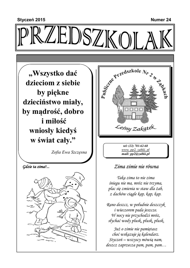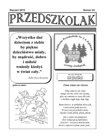 Styczeń 2015 Numer 24 „Wszystko dać dzieciom z siebie by piękne dzieciństwo miały, by mądrość, dobro i miłość wniosły kiedyś w świat cały.” tel: (22) 781-62-68 Zofia Ewa Szczęsna Gdzie ta zima?... www. pp2. zabki. pl mail: [email protected] Zima zimie nie równa Taka zima to nie zima śniegu nie ma, mróz nie trzyma, plac się zmienia w staw dla żab, z dachów ciągle kap, kap, kap. Rano deszcz, w południe deszczyk i wieczorem pada jeszcze. W nocy nie przychodzi mróz, słychać wody plusk, plusk, plusk. Już o zimie nie pamiętasz choć wskazuje ją kalendarz. Styczeń – wszyscy mówią nam, deszcz zaprzecza pam, pam, pam… PRZEDSZKOLAK 2 PRZEDSZKOLAK Mnogość rozwijających zajęć I już jesteśmy na półmetku. Jak to się dzieje, że tak szybko mija czas? Nieustannie zadaję sobie to pytanie i tym razem również pozostawię je bez odpowiedzi. Przypomnę jednak, że dzieciństwo minie równie szybko – jak mrugnięcie oka. Dlatego należy jak najlepiej wykorzystać ten czas zwłaszcza, że jest to okres kształtowania się osobowości człowieka. Jedyny i niepowtarzalny moment przejawiający się zdolnością niezwykle szybkiej nauki, przyswajania wiedzy i umiejętności. Dziecko jest najważniejsze Nie ma gotowej recepty czy przepisu, jak dobrze wychować dziecko. Wiadomo jednak, że to rodzina jest miejscem, w którym przebiega proces kształtowania się człowieka. Niezbędna jest w niej bezwarunkowa miłość, akceptacja, szacunek do dziecka, ale także mądre stawianie granic i wymagań, a przede wszystkim poświęcony dziecku czas. Przedszkole pełni funkcję wspierającą działania rodziny i pokazuje prawa rządzące światem fizycznym i społecznym, kształtuje u dziecka pożądane społecznie zachowania, rozbudza poznawczo, uczy nowych umiejętności, ale także często wskazuje właściwe kierunki rodzicom, którzy niejednokrotnie mozolnie uczą się swojej nowej roli społecznej. W tym roku szkolnym tematem przewodnim jest „dawniej i dziś”. Dzieci poznają historię swojego kraju, życie ludzi na przestrzeni wieków, architekturę, sztukę, odkrycia i wynalazki człowieka, dowiadują się wielu ciekawostek o sławnych Polakach. Bynajmniej nie chodzi nam o to, by recytowały z pamięci daty historyczne i wydarzenia czy też zapamiętywały kolejne epoki. Te nasze oddziaływania poparte wieloma zajęciami, imprezami, wycieczkami, spotkaniami i doświadczeniami niewątpliwie zapadną w ich świadomość i przyczyniają się do kształtowania człowieka wrażliwego, mającego jasny i czytelny system wartości, szanującego siebie, drugiego człowieka i ojczyznę. Istotnym i jednym głównych zadań przedszkola jest również przygotowanie do kolejnego etapu edukacyjnego, jakim jest podjęcie nauki w szkole. Najważniejsza jest sfera emocjonalna i społeczna. Pewne swej wartości dziecko, z właściwą samooceną, wychowane w poczuciu bezpieczeństwa, z łatwością poradzi sobie z nowymi wyzwaniami i problemami. Dlatego staramy się o dobrą atmosferę sprzyjającą kształtowaniu w dziecku pozytywnego obrazu siebie. Każde dziecko otoczone jest naszą szczególną troska, obdarzone zaufaniem, szacunkiem do jego uczuć i potrzeb. Dostrzegamy starania i mocne strony. Nie mniej ważne są inne sfery. Już od pierwszych dni dzieci ćwiczą duże i małe grupy mięśniowe przygotowujące do nauki pisania poprzez: właściwe mycie rąk, trzymanie sztućców i narzędzia pisarskiego, ogrom prac plastycznych i technicznych, wszelkie zajęcia taneczne, ruchowe, gimnastyczne czy sportowe, samodzielne ubieranie się i rozbieranie czy wreszcie sznurowanie butów. Wszelkie zabawy ćwiczące percepcję wzrokową i słuchową przygotowują do nauki czytania: labirynty, loteryjki i historyjki obrazkowe, wyszukiwanie różnic i podobieństw, wysłuchiwanie i odtwarzanie dźwięków i inne. Słuchanie opowiadań, wierszy i ich analiza przygotowują do cichego czytania ze zrozumieniem. Natomiast do rozumienia w przyszłości systemu dziesiątkowego wstępem jest rozumienie rymów i rytmów, np. rytmiczny, uporządkowany rozkład dnia. Liczenie, grupowanie przedmiotów według cech, mierzenie, ważenie, manipulowanie klockami rozwija intuicję matematyczna i geometryczną. Każdego dnia dzieci ćwiczą też swoją pamięć, kompetencje językowe i komunikacyjne poprzez kontakty społeczne, naukę piosenek, wierszy, rymowanek, układanie własnych opowiadań i baśni. Na wszelkich występach rozwijają niezwykle ważną umiejętność autoprezentacji, dzięki której np. bez stresu podejdą do tablicy w szkole bądź zgłoszą się do odpowiedzi. Wycieczki, spacery, rozmowy, spotkania z ludźmi różnych zawodów w przedszkolu i w ich miejscach pracy pomogą dzieciom prawidłowo funkcjonować w świecie społecznym. Natomiast nasze proekologiczne działania rozbudzają szacunek do przyrody, która z dnia na dzień staje się im bliższa i bardziej znana. Współpraca z rodzicami Opisaną tu w wielkim skrócie naszą pracę z dziećmi można przekuć w sukces wychowawczy tylko wówczas, gdy Państwo jako rodzice włączą się w nią, do czego z całego serca nakłaniam. Taka aktywność nie tylko podnosi jakość wychowania, ale również sprawia, że dziecko staje się szczęśliwe, a przecież to właśnie jest główną wartością, do której wszyscy dążymy. My ze swej strony nieustannie staramy się ulepszać i modyfikować jakość pracy przedszkola. Wszelkie państwa sugestie, propozycje i pomysły są dla nas bardzo ważne. Każdy potrzebuje informacji zwrotnej – na czym można bazować, a co trzeba poprawić. Dlatego też wprowadzony u nas „Bank pomysłów” czy możliwość napisania opinii nt. pracy przedszkola daje Państwu możliwość udzielania cennych wskazówek, a nam twórczą inspirację do pozytywnych zmian. Gorąco zachęcam do współpracy bazującej na wzajemnym zaufaniu. Pragnę poinformować również, że do każdej grupy został 