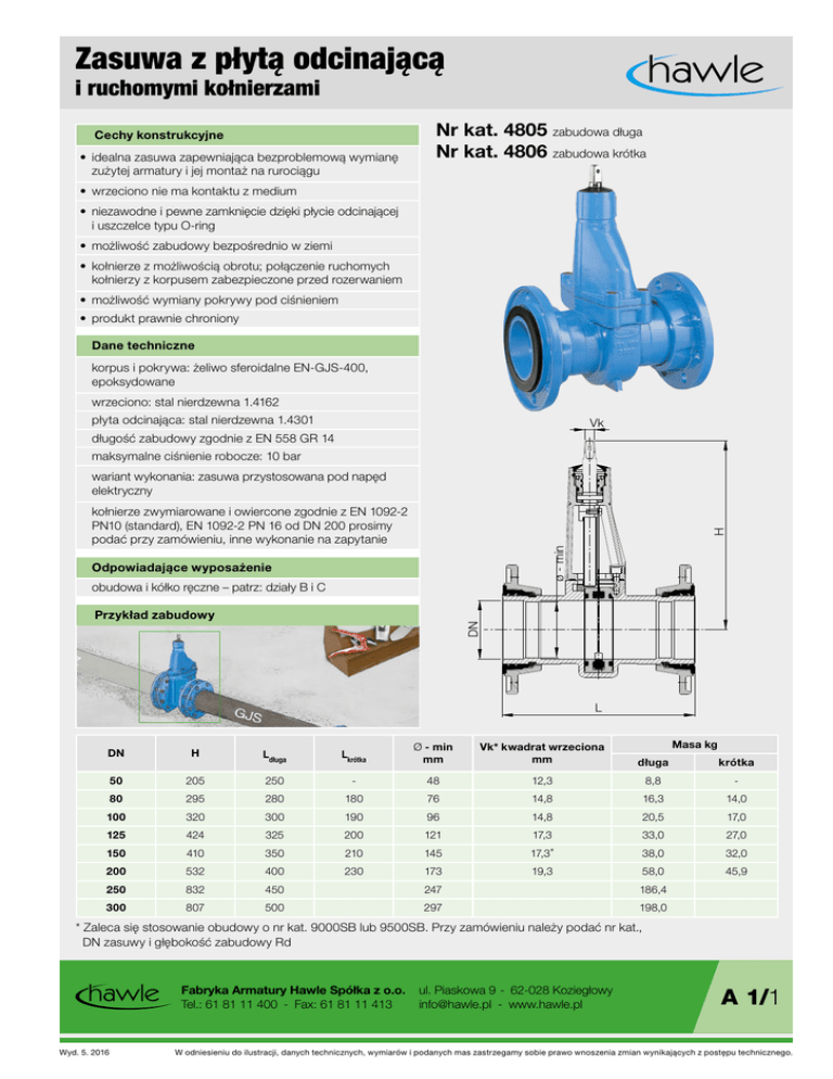 Zasuwa z płytą odcinającą i ruchomymi kołnierzami Nr kat. 4805 zabudowa długa Nr kat. 4806 zabudowa krótka Cechy konstrukcyjne • idealna zasuwa zapewniająca bezproblemową wymianę zużytej armatury i jej montaż na rurociągu • wrzeciono nie ma kontaktu z medium • niezawodne i pewne zamknięcie dzięki płycie odcinającej i uszczelce typu O-ring • możliwość zabudowy bezpośrednio w ziemi • kołnierze z możliwością obrotu; połączenie ruchomych kołnierzy z korpusem zabezpieczone przed rozerwaniem • możliwość wymiany pokrywy pod ciśnieniem • produkt prawnie chroniony Dane techniczne korpus i pokrywa: żeliwo sferoidalne EN-GJS-400, epoksydowane wrzeciono: stal nierdzewna 1.4162 płyta odcinająca: stal nierdzewna 1.4301 Vk długość zabudowy zgodnie z EN 558 GR 14 maksymalne ciśnienie robocze: 10 bar wariant wykonania: zasuwa przystosowana pod napęd elektryczny ø - min H kołnierze zwymiarowane i owiercone zgodnie z EN 1092-2 PN10 (standard), EN 1092-2 PN 16 od DN 200 prosimy podać przy zamówieniu, inne wykonanie na zapytanie Odpowiadające wyposażenie obudowa i kółko ręczne – patrz: działy B i C DN Przykład zabudowy L DN H Ldługa Lkrótka Ø - min mm Vk* kwadrat wrzeciona mm Masa kg długa krótka 50 205 250 - 48 12,3 8,8 - 80 295 280 180 76 14,8 16,3 14,0 100 320 300 190 96 14,8 20,5 17,0 125 424 325 200 121 17,3 33,0 27,0 150 410 350 210 145 17,3* 38,0 32,0 200 532 400 230 173 19,3 58,0 45,9 250 832 450 247 186,4 300 807 500 297 198,0 * Zaleca się stosowanie obudowy o nr kat. 9000SB lub 9500SB. Przy zamówieniu należy podać nr kat., DN zasuwy i głębokość zabudowy Rd Fabryka Armatury Hawle Spółka z o.o. Tel.: 61 81 11 400 - Fax: 61 81 11 413 Wyd. 5. 2016 ul. Piaskowa 9 - 62-028 Koziegłowy [email protected] - www.hawle.pl A 1/1 W odniesieniu do ilustracji, danych technicznych, wymiarów i podanych mas zastrzegamy sobie prawo wnoszenia zmian wynikających z postępu technicznego. Zasuwa z płytą odcinającą i ruchomymi kołnierzami Przykład zastosowania zasuwa z ruchomymi kołnierzami zasuwa ze sztywnymi kołnierzami typowa zasuwa przeznaczona do demontażu zasuwa z ruchomymi kołnierzami przeznaczona do montażu w wolnej przestrzeni nowa typowa zasuwa kołnierzowa przeznaczona do montażu wolnej przestrzeni problem: osadzenie uszczelek między kołnierze (wymagane rozsunięcie kołnierza) kołnierze z możliwością obrotu zabezpieczone przed przesunięciem, uszczelki płaskie zamontowane są na stożkowych powierzchniach uszczelniających łatwy montaż dzięki rozsuwanym kołnierzom Specjalna konstrukcja zasuw z płytą odcinającą i ruchomymi kołnierzami, pozwalająca zastąpić zabudowane i wyeksploatowane zasuwy odcinające na przewodach kanalizacyjnych. Dotychczas wymiana starej zabudowanej zasuwy wiązała się z określonymi problemami i kosztami (patrz: przykład powyżej). Zastosowanie zasuwy wymiennej nr kat. 4805 i nr kat. 4806 eliminuje te utrudnienia i obniża koszty! Zasuwa z ruchomymi kołnierzami ma możliwość obrotu kołnierzy wokół własnej osi, dzięki czemu bez trudu można zamontować ją w przestrzeni powstałej po demontażu wyeksploatowanej armatury. Wykonywane czynności: 1. demontaż istniejącej zasuwy 2. kontrola i oczyszczenie powierzchni przylg uszczelniających przeciwległych kołnierzy rur lub kształtek, pomiędzy które ma zostać zabudowana zasuwa wymienna 3. wstawić zasuwę pomiędzy istniejące kołnierze i wyosiować pod zabudowę obudowy 4. przesunąć ruchome kołnierze w kierunku przeciwkołnierzy, wycentrować otwory kołnierzy, wsunąć nierdzewne śruby z podkładkami, następnie założyć i dokręcić nakrętki Zalety • możliwość wymiany zasuwy z wyeliminowaniem możliwych naprężeń montażowych • duża oszczędność czasu w porównaniu z montażem zasuw z tradycyjnymi kołnierzami • łatwy montaż dzięki ruchomym kołnierzom zabezpieczonym przed przesunięciem • uszczelki płaskie zamontowane są na stożkowych powierzchniach uszczelniających kołnierza • wytrzymałe na rozciąganie połączenie A 1/2 Fabryka Armatury Hawle Spółka z o.o. ul. Piaskowa 9 - 62-028 Koziegłowy Tel.: 61 81 11 400 - Fax: 61 81 11 413 [email protected] - www.hawle.pl W odniesieniu do ilustracji, danych technicznych, wymiarów i podanych mas zastrzegamy sobie prawo wnoszenia zmian wynikających z postępu technicznego. Wyd. 5. 2016