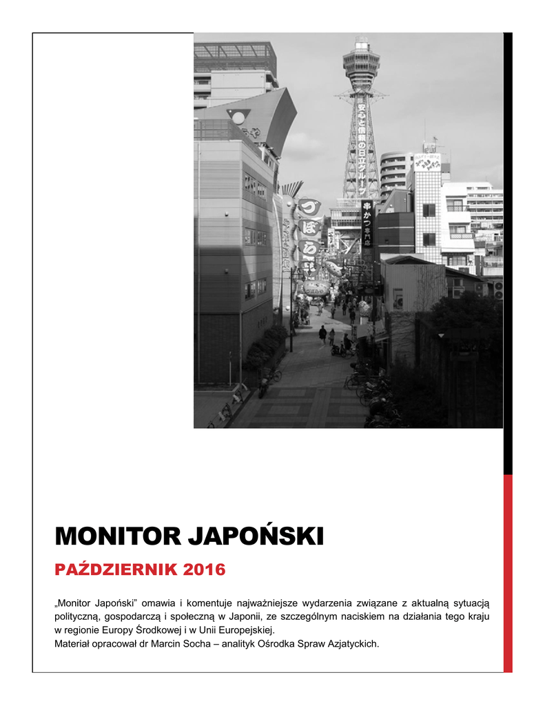 MONITOR JAPOŃSKI PAŹDZIERNIK 2016 „Monitor Japoński” omawia i komentuje najważniejsze wydarzenia związane z aktualną sytuacją polityczną, gospodarczą i społeczną w Japonii, ze szczególnym naciskiem na działania tego kraju w regionie Europy Środkowej i w Unii Europejskiej. Materiał opracował dr Marcin Socha – analityk Ośrodka Spraw Azjatyckich. MONITOR JAPOŃSKI WIZYTA PRE- PAŹDZIERNIK 2016 LIPIN W JA- I. WYDARZENIA SZCZEBLA CENTRALNEGO 28 września: Premier Abe liczy na przełom w negocjacjach z Rosją. Premier Japonii uważa, że bliskie relacje z prezydentem Putinem, problemy gospodarcze objętej sankcjami Rosji oraz obawy przed rosnącym znaczeniem Chin pomogą w osiągnięciu przełomu w negocjacjach dotyczących Kuryli Południowych. Pomimo tego, że zacieśnianie relacji z Moskwą może wywołać negatywną reakcję ze strony głównego sojusznika Japonii, Stanów Zjednoczonych premier Abe nie rezygnuje z ambitnego celu jakim jest uporządkowanie dwustronnych relacji. Japoński przywódca obiecał zakończenie "nienormalnej" sytuacji poprzez zwiększenie współpracy gospodarczej i energetycznej. W celu przyspieszenia negocjacji premier przedstawił ośmiopunktowy plan współpracy gospodarczej w regionie Syberii. Zdaniem części polityków z Partii Liberalno-Demokratycznej japoński rząd jest gotów zaprezentować nowe, ograniczone podejście do problemu poprzez rezygnację z części spornych terytoriów. Pogłoski te zostały szybko zdementowane przez sekretarza gabinetu Sugę Yoshihide, który nie przewiduje zmiany stanowiska. 1 października: Japonia i Indie podpiszą porozumienie o współpracy w zakresie energetyki jądrowej. Japonia i Indie są bliskie podpisania traktatu o cywilnej współpracy nuklearnej. Umowa ma zostać sfinalizowana podczas nadchodzącej wizyty premiera Narendry Modiego w Japonii, zaplanowanej na listopad. Wstępny projekt współpracy w dziedzinie energetyki jądrowej został przygotowany w grudniu zeszłego roku. Rozmowy zostały jednak wstrzymane z powodu różnic technologicznych i prawnych. Japonia domaga się dodatkowych gwarancji o nierozprzestrzenianiu technologii jądrowej. Podpisanie traktatu to szansa wejścia na ogromny rynek dla japońskoamerykańskich firm zajmujących się budową reaktorów nuklearnych. ZYDENTA FIPONII Najciekawszym wydarzenie minionego miesiąca była oficjalna wizyta kontrowersyjnego prezydenta Filipin Rodrigo Duterte w Japonii. Wizyta wzbudziła wiele emocji z powodu konfliktowego nastawienia nowego przywódcy do współpracy ze Stanami Zjednoczonymi, co postawiło pod znakiem zapytania przyszłość współpracy pomiędzy Japonią a Filipinami w zakresie bezpieczeństwa morskiego. 13 października: Japonia protestuje przeciwko nowym chińskim projektom wydobycia gazu. Pomimo protestów ze strony japońskiej, chińskie spółki wydobywcze rozwijają działalność na spornych wodach Morza Wschodniochińskiego. Japonia oskarża Chiny o nierespektowanie porozumienia zawartego w 2008 roku. Porozumienie zobowiązuje do nawiązania współpracy wydobywczej na wodach, na których nie doszło do ostatecznego rozgraniczenia strefy wpływów. Rząd chiński nie uznaje linii delimitacji wód na Morzu Wschodniochińskim, która ma oddzielać japońskie i chińskie platformy wydobywcze. Zdaniem przedstawicieli chińskiego MSZ nowe instalacje znajdują się na wodach, które bez wątpliwości znajdują się w chińskiej strefie wpływów. 17 października: Japoński rząd nie rozważa wspólnego zarządzania spornymi terytoriami z Rosją. Zgodnie z informacjami przedstawionymi przez Nikkei Shimbun premier Shinzō Abe rozważał propozycję ustanowienia wspólnej kontroli nad Kurylami Południowymi. Przedstawiciel japońskiego MSZ zdementował te pogłoski oświadczając, że Japonia i Rosja nie prowadzą rozmów dotyczących wspólnego zarządzania spornymi wyspami. Zdaniem niektórych członków PLD pogłoski o wspólnym zarządzaniu terytoriami nie są realistyczne. Stanowisko japońskiego rządu pozostaje niezmienne. Japonia podpisze traktat pokojowy z Rosją dopiero po rozwiązaniu problemu wszystkich spornych wysp. 18 października: Kolejne wizyty w świątyni Yasukuni. Grupa 85. parlamentarzystów oraz dwóch ministrów w gabinecie premiera Abe odwiedziło kontrowersyjną świątynię Yasukuni w Tokio. Sam premier po raz kolejny nie złożył wizyty w świątyni i ograniczył się do wysłania symbolicznej darowizny ku czci poległych. Obecny premier odwiedził Yasukuni tylko raz w 2013 roku, co wywołało falę protestów ze strony Chin, Korei Południowej i Stanów Zjednoczonych. 21 października: Pożyczka dla rosyjskiego banku ma przyspieszyć rozmowy nad spornymi terytoriami. Japoński Bank Współpracy Międzynarodowej pożyczy 39 milionów USD dla objętego sankcjami rosyjskiego banku Sberbank. Jeden z największych banków w Rosji ma zamiar przekazać pieniądze firmie zarządzającej portem Vostochny na Syberii. Pomimo tego, że pożyczka nie jest wysoka, Sberbank znajduje się na liście podmiotów objętych sankcjami przez Stany Zjednoczone i Unię Europejską. Japoński rząd respektuje te ograniczenia, lecz jest w stanie je ominąć korzystając z pożyczki denominowanej w Jenach, która nie znajduje się na liście zakazanych operacji. Wsparcie jest jednym z elementów ośmiopunktowego planu zacieśniania współpracy gospodarczej mającej na celu przyspieszenia rozmów dotyczących Kuryli Południowych. 26 października: Projekt przedłużenia kadencji premiera do dziewięciu lat. Zgodnie z przewidywaniami rządząca Partia Liberalno-Demokratyczna zaproponowała wydłużenie dopuszczalnego czasu sprawowania rządów premiera do trzech trzyletnich kadencji z rzędu. Projekt zmian ma umożliwić obecnemu premierowi Shinzō Abe pozostanie przy władzy aż do organizacji Igrzysk Olimpijskich w Tokio w 2020 r. Partia rządząca nie powinna mieć większych problemów ze zwiększeniem ilo