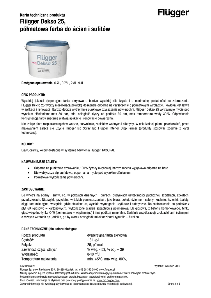 Karta techniczna produktu Flügger Dekso 25, półmatowa farba do ścian i sufitów Dostępne opakowania: 0.7L, 0.75L, 2.8L, 9.1L OPIS PRODUKTU: Wysokiej jakości dyspersyjna farba akrylowa o bardzo wysokiej sile krycia i o minimalnej podatności na zabrudzenia. Flügger Dekso 25 tworzy nieżółknącą powłokę doskonale odporną na czyszczenie o półmatowym wyglądzie. Powłoka jest łatwa w aplikacji i renowacji. Bardzo dobrze wytrzymuje punktowe czyszczenie powierzchni. Flügger Dekso 25 wytrzymuje mycie pod wysokim ciśnieniem: max 80 bar, min. odległość dyszy od podłoża 30 cm, max temperatura wody 30°C. Odpowiednia konsystencja farby znacznie ułatwia aplikację i renowację powierzchni. Nie izoluje plam rozpuszczalnych w wodzie, barwników, zacieków wodnych i nikotyny. W celu izolacji plam i przebarwień, przed malowaniem zaleca się użycie Flügger Iso Spray lub Flügger Interior Stop Primer (produkty stosować zgodnie z kartą techniczną). KOLORY: Biały, czarny, kolory dostępne w systemie barwienia Flügger, NCS, RAL NAJWAŻNIEJSZE ZALETY: Odporna na punktowe szorowanie, 100% żywicy akrylowej, bardzo mocna wyjątkowo odporna na brud Nie wybłyszcza się punktowo, odporna na mycie pod wysokim ciśnieniem Półmatowe wykończenie powierzchni. ZASTOSOWANIE: Do wnętrz na ściany i sufity, np. w pokojach dziennych i biurach, budynkach użyteczności publicznej, szpitalach, szkołach, przedszkolach. Niezwykle przydatna w takich pomieszczeniach, jak: biura, pokoje dzienne - salony, kuchnie, łazienki, toalety, ciągi komunikacyjne, wszędzie gdzie stawiane są wysokie wymagania użytkowe i estetyczne. Do zastosowania na podłoża: z płyt GK (gipsowo – kartonowych), wykończone gładzią szpachlową polimerową lub gipsową, z betonu komórkowego, tynku gipsowego lub tynku C-W (cementowo – wapiennego) i inne podłożą mineralne. Świetnie współpracuje z okładzinami ściennymi o różnych wzorach np. jodełka, gruby worek oraz gładkimi okładzinami typu filc – flizelina. DANE TECHNICZNE (dla koloru białego): Rodzaj produktu Gęstość: Połysk: Zawartość części stałych: Wydajność: Temperatura malowania: dyspersyjna farba akrylowa 1,31 kg/l 25, półmat % wag. - 53, % obj. – 39 8-10 m2/l min. +5°C, max wilg. 80%, Key: Dekso 25 wydanie: kwiecień 2015 Flugger Sp. z o.o. Rakietowa 20 A, 80-298 Gdańsk; tel. +48 58 340 28 00 www.flugger.pl Należy upewnić się, że wydanie Informacji jest aktualne. Własności produktu mogą się zmieniać wraz z rozwojem technicznym. Podane informacje bazują na obowiązującym prawie, badaniach laboratoryjnych i praktyce malarskiej. Patrz również: informacje na etykiecie oraz procedury postępowania na: www.gm.flugger.com Zawarte informacje nie zwalniają użytkownika od stosowania się do zasad sztuki malarskiej i budowlanej. Strona 1 z 2 Karta techniczna produktu Flügger Dekso 25, półmatowa farba do ścian i sufitów Czas schnięcia w 20°C, 60% wilg.: Odporność na szorowanie na mokro: Całkowita emisja: Współczynnik kontrastu (zdolność krycia): Zawartość LZO: Rozcieńczanie: Mycie narzędzi: Magazynowanie: również podczas schnięcia i utwardzania sucha na dotyk - 1 h następne malowanie - 6 h całkowicie utwardzona - kilka dni klasa 1, PN-EN 13300:2002 <350 ug/m2h po 28 dniach, PN-EN ISO 16000-9:2009 Klasa 2 (99,0) PN-EN 13300 max 60 g/l woda woda ze środkiem myjącym w chłodnym mrozoodpornym pomieszczeniu, w szczelnym opakowaniu TECHNOLOGIA WYKONANIA: a) Przygotowanie podłoża: Podłoże musi być czyste, suche, nośne. Pylące podłoża odpylić i oczyścić. Występujące miejscowe ubytki uzupełnić, np. szpachlówką Flugger Easy Filler lub Sandplast. Chłonne podłoże zagruntować: Flügger gruntem wodnym, lub Flügger Wall Primer White. Do przygotowania powierzchni przed malowaniem farbami Flügger należy stosować grunty Flügger. Malowane wcześniej powierzchnie przed malowaniem umyć płynem Fluren 37 (przed użyciem należy zapoznać się z kartą techniczną produktu). Unikać zacieków. Powierzchnie pokryte korozją biologiczną (grzyby, naloty pleśni) zmyć z użyciem płynu Flügger Fluren 39. b) Aplikacja, sposób użycia: Nakładać pędzlem, wałkiem lub natryskiem hydrodynamicznym. W zależności od rodzaju podłoża i temperatury, pierwsza warstwa może być rozcieńczona max 10% wodą. Farbę przed użyciem dokładnie wymieszać. Należy pamiętać o odpowiednich warunkach prowadzenia prac malarskich - wilgotności oraz temperaturze (podłoża i otoczenia). Przy aplikacji wałkiem powinniśmy dobrać właściwą długość włosia zależną od wysokości pomieszczenia, tak aby uzyskać równomierną strukturę oraz odpowiednią ilość nakładanej farby na malowanej powierzchni. Intensywne kolory mogą być mniej trwałe niż biały i jasne. c) Rekomendowane narzędzia: Wałek: Flügger Westlon, Flügger Micolon, Flügger Proflon, Flügger Lamlon, Flügger Rough Rapid. NATRYSK HYDRODYNAMICZNY: Graco ST Max 395 dysza 0,015``, 0,017``,0,019`` kąt od 10° wzwyż, ciśnienie min 170 bar. Wagner PS 3.21 dysza 0,015``, 0,017``,0,019`` kąt od 10° wzwyż, ciśnienie min 170 bar. ATESTY I CERTYFIKATY: Farba Flügger Dekso 25 posiada atest higieniczny. Flügger Dekso 25 jest oznakowana europejskim znakiem ekologicznym. Jest to jeden z najważniejszych certyfikatów przyznawany produktom przyjaznym dla środowiska. Produkty posiadające takie oznaczenie nie zawierają substancji toksycznych. Key: Dekso 25 wydanie: kwiecień 2015 Flugger Sp. z o.o. Rakietowa 20 A, 80-298 Gdańsk; tel. +48 58 340 28 00 www.flugger.pl Należy upewnić się, że wydanie Informacji jest aktualne. Własności produktu mogą się zmieniać wraz z rozwojem technicznym. Podane informacje bazują na obowiązującym prawie, badaniach laboratoryjnych i praktyce malarskiej. Patrz również: informacje na etykiecie oraz procedury postępowania na: www.gm.flugger.com Zawarte informacje nie zwalniają użytkownika