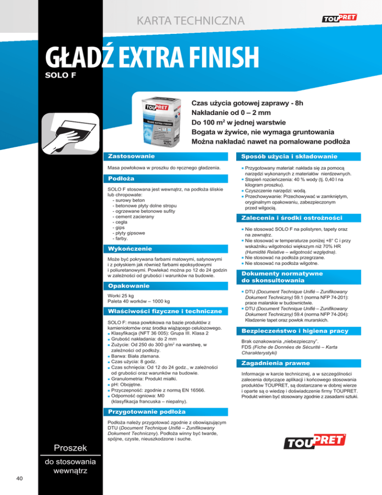 KARTA TECHNICZNA GŁADŹ EXTRA FINISH SOLO F Czas użycia gotowej zaprawy - 8h Nakładanie od 0 – 2 mm Do 100 m2 w jednej warstwie Bogata w żywice, nie wymaga gruntowania Można nakładać nawet na pomalowane podłoża Zastosowanie Sposób użycia i składowanie Masa powłokowa w proszku do ręcznego gładzenia. ■ Podłoża SOLO F stosowana jest wewnątrz, na podłoża śliskie lub chropowate: - surowy beton - betonowe płyty dolne stropu - ogrzewane betonowe sufity - cement zacierany - cegła - gips - płyty gipsowe - farby. Wykończenie Może być pokrywana farbami matowymi, satynowymi i z połyskiem jak również farbami epoksydowymi i poliuretanowymi. Powlekać można po 12 do 24 godzin w zależności od grubości i warunków na budowie. Opakowanie Worki 25 kg Paleta 40 worków – 1000 kg Właściwości fizyczne i techniczne SOLO F: masa powłokowa na bazie produktów z kamieniołomów oraz środka wiążącego celulozowego. ■ Klasyfikacja (NFT 36 005): Grupa III. Klasa 2 ■ Grubość nakładania: do 2 mm ■ Zużycie: Od 250 do 300 g/m2 na warstwę, w zależności od podłoży. ■ Barwa: Biała złamana. ■ Czas użycia: 8 godz. ■ Czas schnięcia: Od 12 do 24 godz., w zależności od grubości oraz warunków na budowie. ■ Granulometria: Produkt miałki. ■ pH: Obojętne. ■ Przyczepność: zgodnie z normą EN 16566. ■ Odporność ogniowa: M0 (klasyfikacja francuska – niepalny). Przygotowany materiał: nakłada się za pomocą narzędzi wykonanych z materiałów nierdzewnych. ■ Stopień rozcieńczenia: 40 % wody (tj. 0,40 l na kilogram proszku). ■ Czyszczenie narzędzi: wodą. ■ Przechowywanie: Przechowywać w zamkniętym, oryginalnym opakowaniu, zabezpieczonym przed wilgocią. Zalecenia i środki ostrożności Nie stosować SOLO F na polistyren, tapety oraz na zewnątrz. ■ Nie stosować w temperaturze poniżej +8° C i przy wskaźniku wilgotności większym niż 70% HR (Humidité Relative – wilgotność względna). ■ Nie stosować na podłoża przegrzane. ■ Nie stosować na podłoża wilgotne. ■ Dokumenty normatywne do skonsultowania DTU (Document Technique Unifié – Zunifikowany Dokument Techniczny) 59.1 (norma NFP 74-201): prace malarskie w budownictwie. ■ DTU (Document Technique Unifié – Zunifikowany Dokument Techniczny) 59.4 (norma NFP 74-204): Kładzenie tapet oraz powłok murarskich. ■ Bezpieczeństwo i higiena pracy Brak oznakowania „niebezpieczny”. FDS (Fiche de Données de Sécurité – Karta Charakterystyki) Zagadnienia prawne Informacje w karcie technicznej, a w szczególności zalecenia dotyczące aplikacji i końcowego stosowania produktów TOUPRET, są dostarczane w dobrej wierze i oparte są o wiedzę i doświadczenie firmy TOUPRET. Produkt winien być stosowany zgodnie z zasadami sztuki. Przygotowanie podłoża Podłoża należy przygotować zgodnie z obowiązującym DTU (Document Technique Unifié – Zunifikowany Dokument Techniczny). Podłoża winny być twarde, spójne, czyste, nieuszkodzone i suche. Proszek 40 do stosowania wewnątrz TOUPRET POLSKA Sp. z o.o. ul. Przemysłowa 18, 62-069 Zakrzewo k/Poznania, [email protected], tel. 61 670 68 68