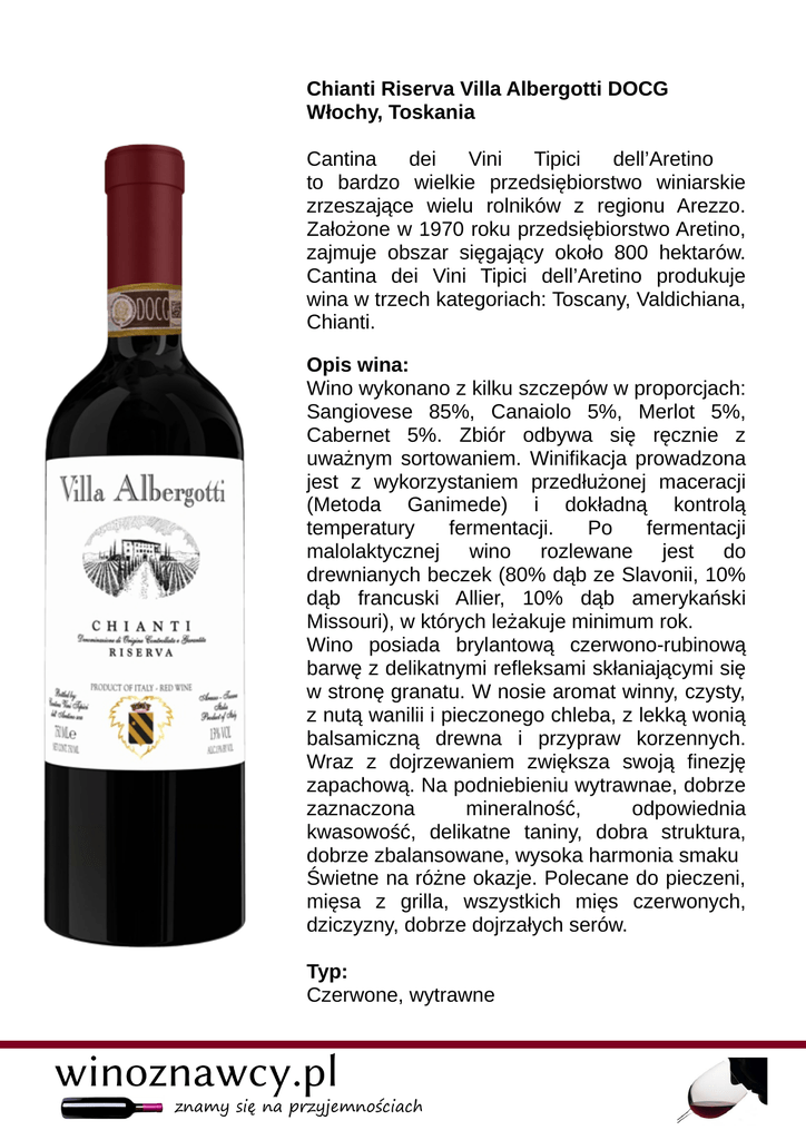 Chianti Riserva Villa Albergotti DOCG Włochy, Toskania Cantina dei Vini Tipici dell’Aretino to bardzo wielkie przedsiębiorstwo winiarskie zrzeszające wielu rolników z regionu Arezzo. Założone w 1970 roku przedsiębiorstwo Aretino, zajmuje obszar sięgający około 800 hektarów. Cantina dei Vini Tipici dell’Aretino produkuje wina w trzech kategoriach: Toscany, Valdichiana, Chianti. Opis wina: Wino wykonano z kilku szczepów w proporcjach: Sangiovese 85%, Canaiolo 5%, Merlot 5%, Cabernet 5%. Zbiór odbywa się ręcznie z uważnym sortowaniem. Winifikacja prowadzona jest z wykorzystaniem przedłużonej maceracji (Metoda Ganimede) i dokładną kontrolą temperatury fermentacji. Po fermentacji malolaktycznej wino rozlewane jest do drewnianych beczek (80% dąb ze Slavonii, 10% dąb francuski Allier, 10% dąb amerykański Missouri), w których leżakuje minimum rok. Wino posiada brylantową czerwono-rubinową barwę z delikatnymi refleksami skłaniającymi się w stronę granatu. W nosie aromat winny, czysty, z nutą wanilii i pieczonego chleba, z lekką wonią balsamiczną drewna i przypraw korzennych. Wraz z dojrzewaniem zwiększa swoją finezję zapachową. Na podniebieniu wytrawnae, dobrze zaznaczona mineralność, odpowiednia kwasowość, delikatne taniny, dobra struktura, dobrze zbalansowane, wysoka harmonia smaku Świetne na różne okazje. Polecane do pieczeni, mięsa z grilla, wszystkich mięs czerwonych, dziczyzny, dobrze dojrzałych serów. Typ: Czerwone, wytrawne
