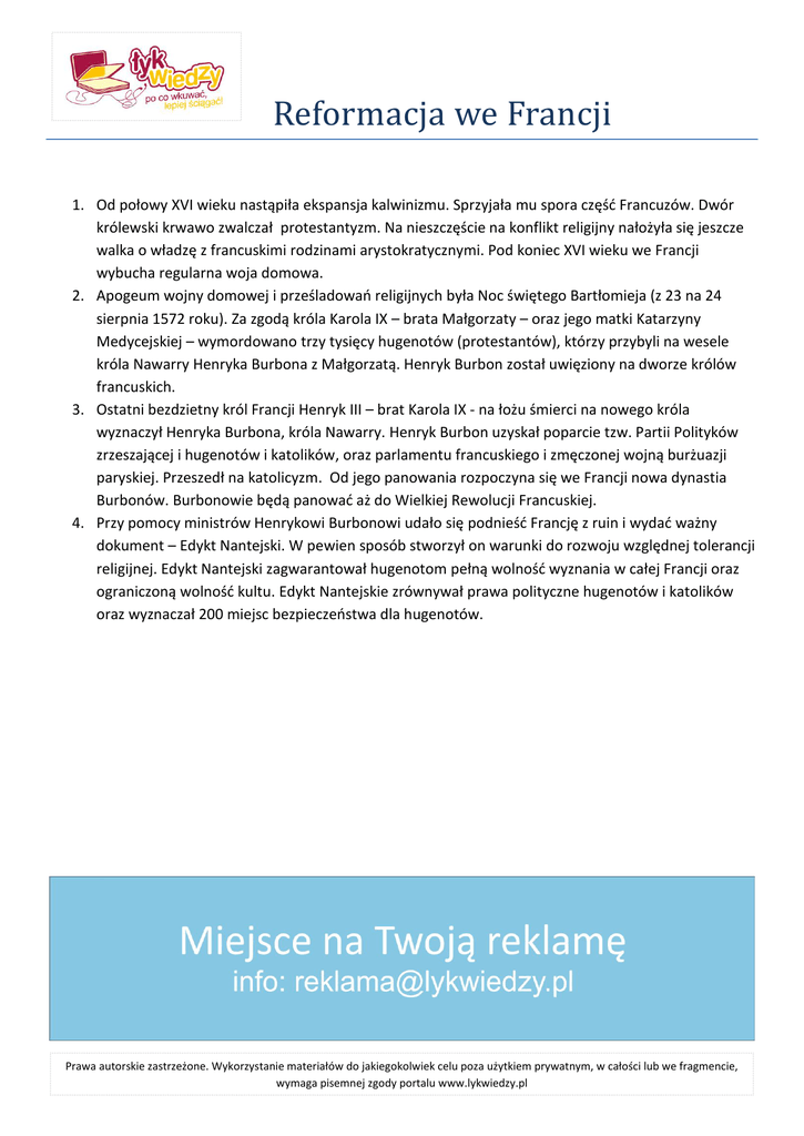 Reformacja we Francji 1. Od połowy XVI wieku nastąpiła ekspansja kalwinizmu. Sprzyjała mu spora częśd Francuzów. Dwór królewski krwawo zwalczał protestantyzm. Na nieszczęście na konflikt religijny nałożyła się jeszcze walka o władzę z francuskimi rodzinami arystokratycznymi. Pod koniec XVI wieku we Francji wybucha regularna woja domowa. 2. Apogeum wojny domowej i prześladowao religijnych była Noc świętego Bartłomieja (z 23 na 24 sierpnia 1572 roku). Za zgodą króla Karola IX – brata Małgorzaty – oraz jego matki Katarzyny Medycejskiej – wymordowano trzy tysięcy hugenotów (protestantów), którzy przybyli na wesele króla Nawarry Henryka Burbona z Małgorzatą. Henryk Burbon został uwięziony na dworze królów francuskich. 3. Ostatni bezdzietny król Francji Henryk III – brat Karola IX - na łożu śmierci na nowego króla wyznaczył Henryka Burbona, króla Nawarry. Henryk Burbon uzyskał poparcie tzw. Partii Polityków zrzeszającej i hugenotów i katolików, oraz parlamentu francuskiego i zmęczonej wojną burżuazji paryskiej. Przeszedł na katolicyzm. Od jego panowania rozpoczyna się we Francji nowa dynastia Burbonów. Burbonowie będą panowad aż do Wielkiej Rewolucji Francuskiej. 4. Przy pomocy ministrów Henrykowi Burbonowi udało się podnieśd Francję z ruin i wydad ważny dokument – Edykt Nantejski. W pewien sposób stworzył on warunki do rozwoju względnej tolerancji religijnej. Edykt Nantejski zagwarantował hugenotom pełną wolnośd wyznania w całej Francji oraz ograniczoną wolnośd kultu. Edykt Nantejskie zrównywał prawa polityczne hugenotów i katolików oraz wyznaczał 200 miejsc bezpieczeostwa dla hugenotów. Prawa autorskie zastrzeżone. Wykorzystanie materiałów do jakiegokolwiek celu poza użytkiem prywatnym, w całości lub we fragmencie, wymaga pisemnej zgody portalu www.lykwiedzy.pl
