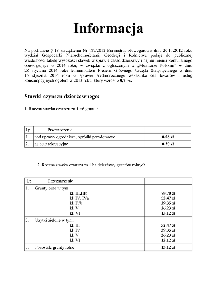 Informacja Na podstawie § 18 zarządzenia Nr 187/2012 Burmistrza Nowogardu z dnia 20.11.2012 roku wydział Gospodarki Nieruchomościami, Geodezji i Rolnictwa podaje do publicznej wiadomości tabelę wysokości stawek w sprawie zasad dzierżawy i najmu mienia komunalnego obowiązujące w 2014 roku, w związku z ogłoszonym w „Monitorze Polskim” w dniu 28 stycznia 2014 roku komunikatem Prezesa Głównego Urzędu Statystycznego z dnia 15 stycznia 2014 roku w sprawie średniorocznego wskaźnika cen towarów i usług konsumpcyjnych ogółem w 2013 roku, który wzrósł o 0,9 %. Stawki czynszu dzierżawnego: 1. Roczna stawka czynszu za 1 m² gruntu: Lp Przeznaczenie 1. pod uprawy ogrodnicze, ogródki przydomowe. 0,08 zł 2. na cele rekreacyjne 0,30 zł 2. Roczna stawka czynszu za 1 ha dzierżawy gruntów rolnych: Lp 1. Przeznaczenie Grunty orne w tym: kl. III,IIIb kl IV, IVa kl. IVb kl. V kl. VI 2. 3. 78,70 zł 52,47 zł 39,35 zł 26,23 zł 13,12 zł Użytki zielone w tym: kl. III kl IV kl. V kl. VI 52,47 zł 39,35 zł 26,23 zł 13,12 zł Pozostałe grunty rolne 13,12 zł 3. Miesięczna stawka czynszu za 1 m² gruntu: Lp. Przeznaczenie 1. na cele przemysłowo-składowe 0,15 zł 2. pod parking 1,05 zł 3. na cele handlowe i małej gastronomi, pod kontenerami, kioskami, pawilonami handlowymi, pawilonami usługowymi, itp 1,97 zł 4. pod garaże lub pod budowę nowego garażu 0,60 zł 5. pod budynki gospodarcze – obory, chlewnie, stodoły, itp 0,10 zł 6. pod małe budynki gospodarcze (do 35m²), pomieszczenia gospodarcze 0,16 zł 7. pod szopy drewniane 0,08 zł 8. na cele poprawienia warunków zagospodarowania działki przyległej (dojazd do posesji itp.) 0,20 zł 9. pod reklamy 32,79 zł Miesięczna stawka czynszu najmu za 1m²: Lp. Przeznaczenie 1. komórki, małe budynki gospodarcze, itp 1,01 zł 2. obory, chlewnie, stodoły, itp 0,20 zł 3. garaże 2,02 zł Do podanych stawek będzie doliczony podatek VAT w obowiązującej wysokości.