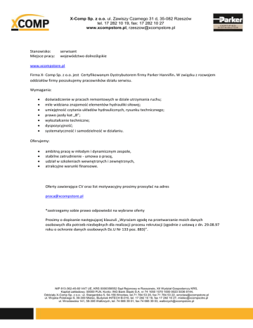 X-Comp Sp. z o.o. ul. Zawiszy Czarnego 31 d, 35-082 Rzeszów tel. 17 282 10 19, fax: 17 282 10 27 www.xcompstore.pl, [email protected] Stanowisko: Miejsce pracy: serwisant województwo dolnośląskie www.xcompstore.pl Firma X- Comp Sp. z o.o. jest Certyfikowanym Dystrybutorem firmy Parker Hannifin. W związku z rozwojem oddziałów firmy poszukujemy pracowników działu serwisu. Wymagania: doświadczenie w pracach remontowych w dziale utrzymania ruchu; mile widziana znajomość elementów hydrauliki siłowej; umiejętność czytania układów hydraulicznych, rysunku technicznego; prawo jazdy kat „B”; wykształcenie techniczne; dyspozycyjność; systematyczność i samodzielność w działaniu. Oferujemy: ambitną pracę w młodym i dynamicznym zespole, stabilne zatrudnienie - umowa o pracę, udział w szkoleniach wewnętrznych i zewnętrznych, atrakcyjne warunki finansowe. Oferty zawierające CV oraz list motywacyjny prosimy przesyłać na adres [email protected] *zastrzegamy sobie prawo odpowiedzi na wybrane oferty Prosimy o dopisanie następującej klauzuli „Wyrażam zgodę na przetwarzanie moich danych osobowych dla potrzeb niezbędnych dla realizacji procesu rekrutacji (zgodnie z ustawą z dn. 29.08.97 roku o ochronie danych osobowych Dz.U Nr 133 poz. 883)”. NIP 813-362-45-60 VAT UE, KRS 0000358552 Sąd Rejonowy w Rzeszowie, XII Wydział Gospodarczy KRS, Kapitał zakładowy: 50000 PLN, Konto: ING Bank Śląski S.A. nr 74 1050 1070 1000 0023 5036 8144, Oddziały X-Comp Sp. z o.o.: ul. Stargardzka 5, 54-156 Wrocław, tel.71 784 53 20, fax 71 784 53 22, [email protected] ul. Wojska Polskiego 9, 39-300 Mielec, Budynek INTECH B-010, tel. 17 282 10 18, fax 17 282 10 27, [email protected] ul. Wrocławska 141, 58-306 Wałbrzych, tel. 74 666 39 01, fax 74 666 39 03, [email protected] 10